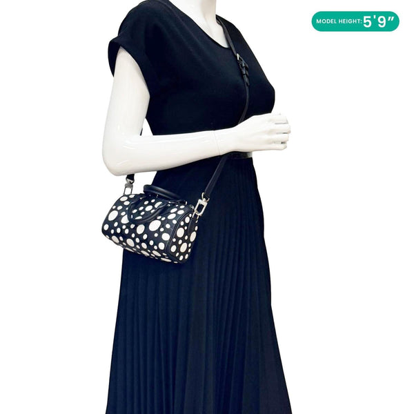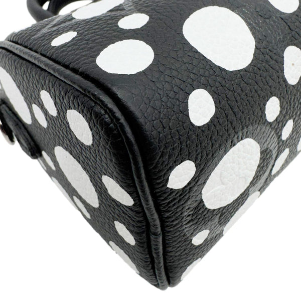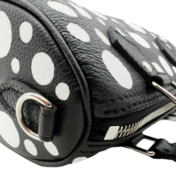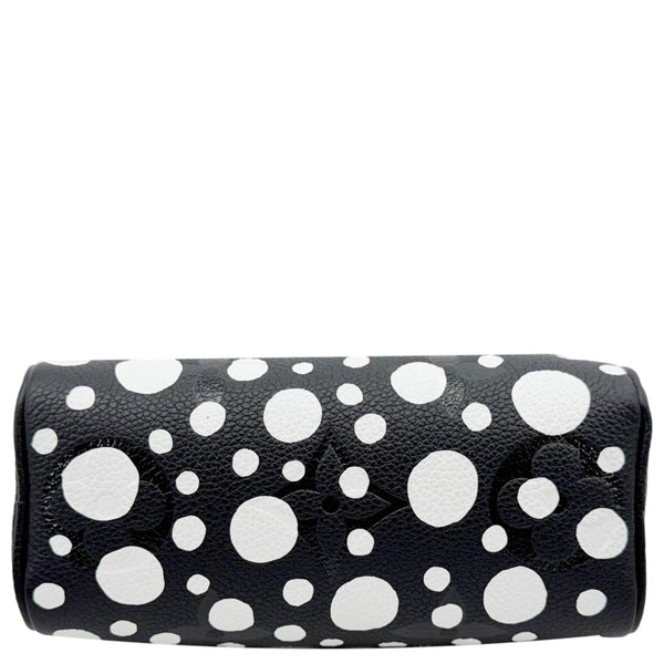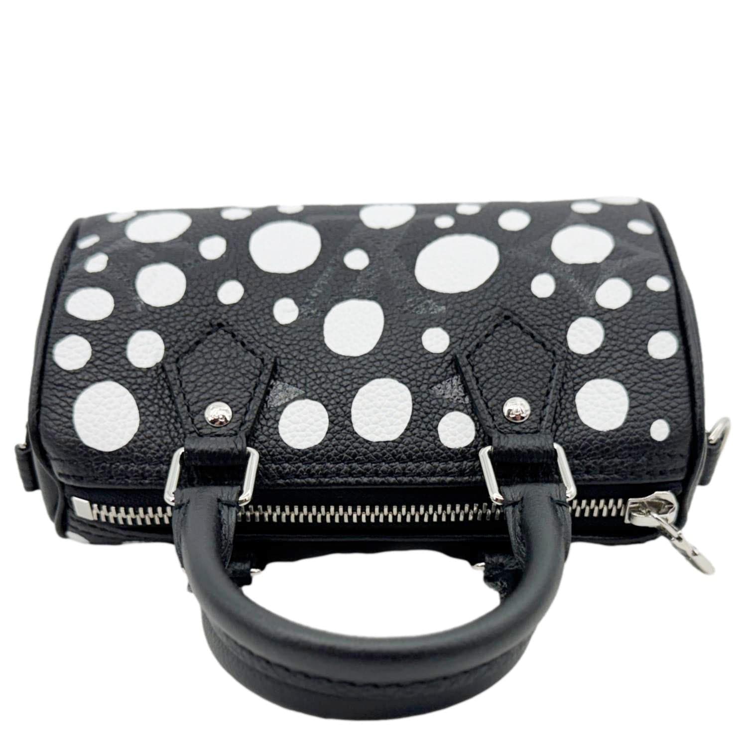 The Louis Vuitton LV x Yayoi Kusama Nano Speedy is crafted from black Monogram Empreinte leather with vibrant dotted accents. This limited-edition piece combines artistic flair with the iconic Speedy silhouette in a compact, collectible design.