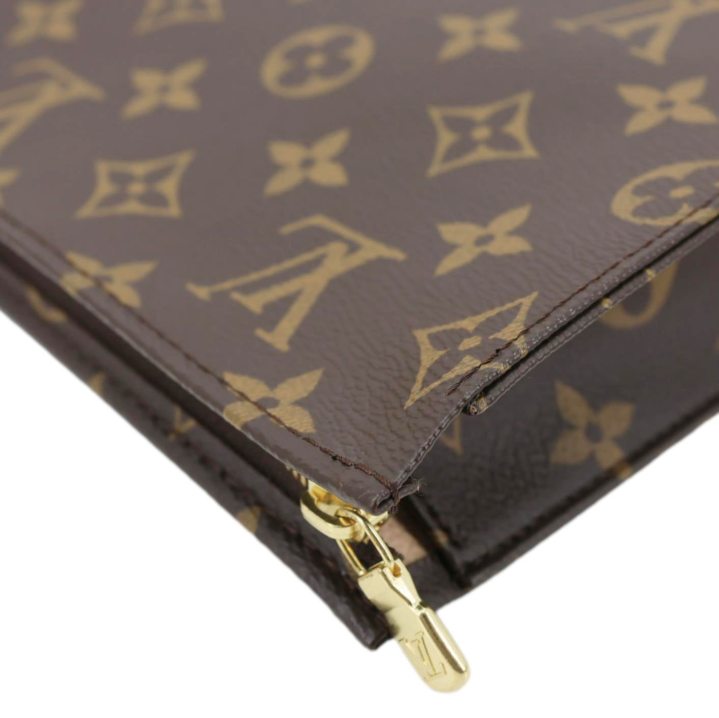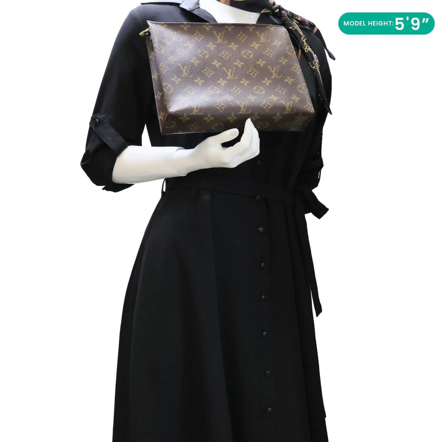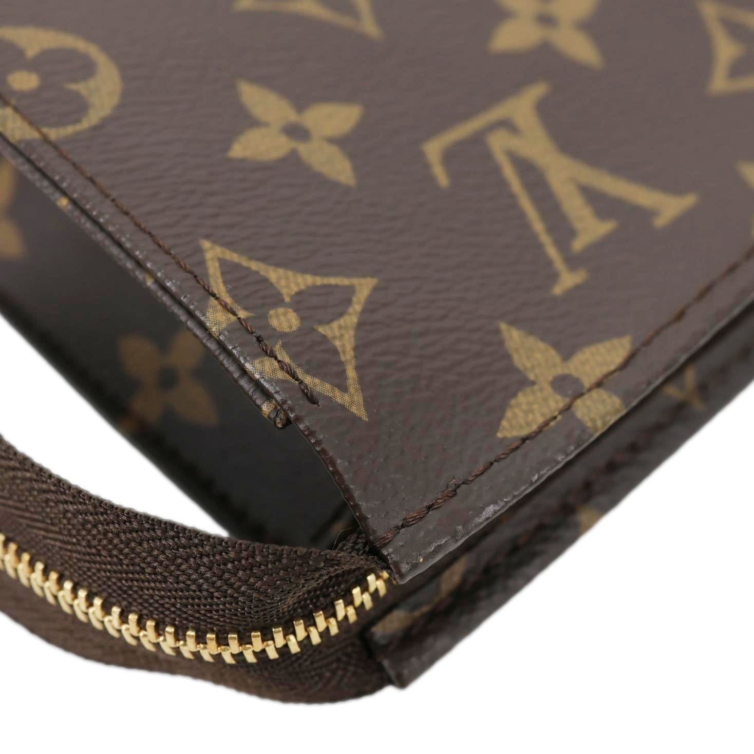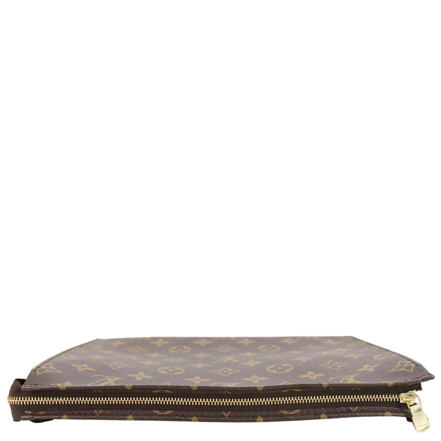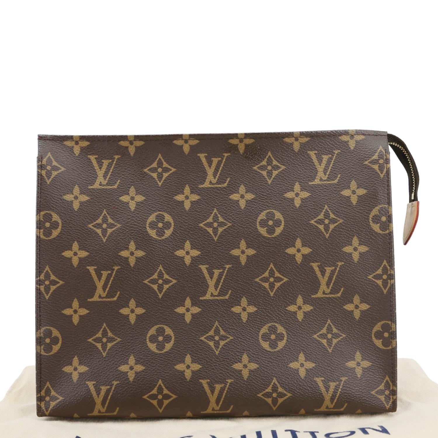 A classic Louis Vuitton Toiletry Pouch 26 crafted in durable Monogram canvas with a sleek clutch silhouette. Spacious and versatile, perfect for organizing essentials or carrying as a stylish hand-held pouch.