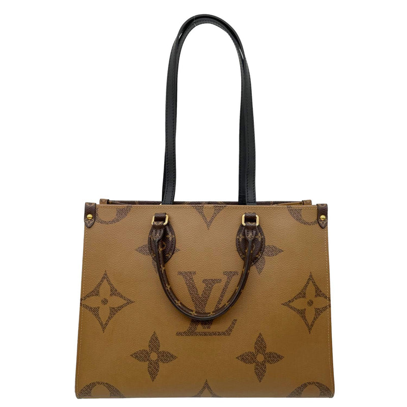 A bold Louis Vuitton Onthego MM tote crafted in Giant Monogram Reverse canvas with a structured, spacious design. Features dual top handles and long shoulder straps, making it perfect for stylish everyday or work use.