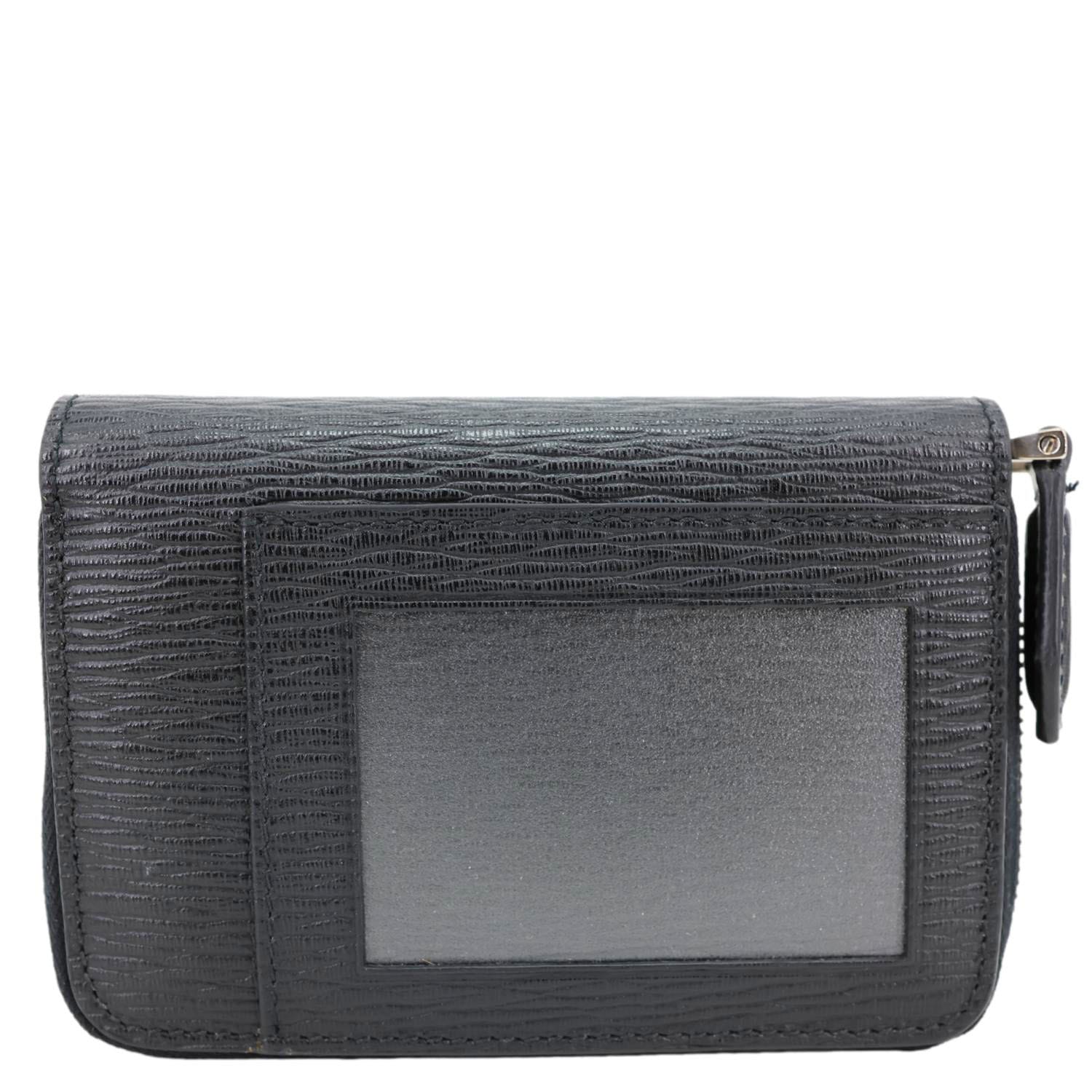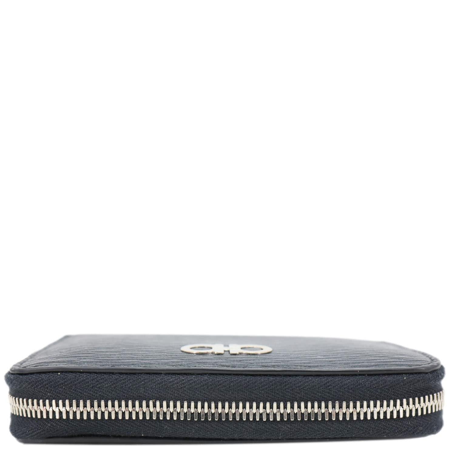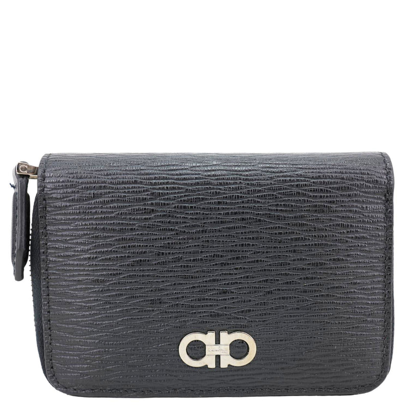 Sleek SALVATORE FERRAGAMO Gancini card case crafted in textured black leather with the iconic Gancini emblem for a refined touch. Compact yet functional design with multiple card slots, perfect for keeping essentials organized in style.
