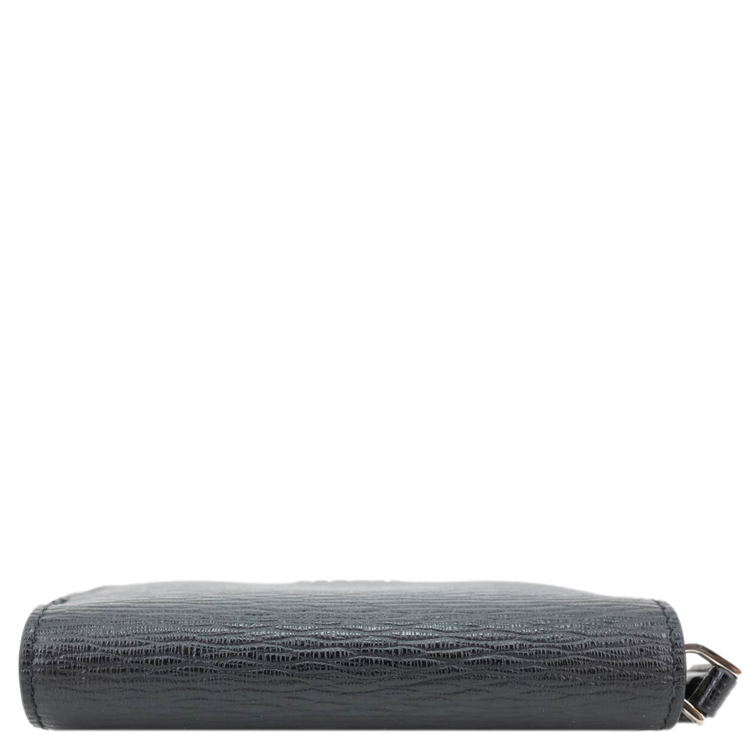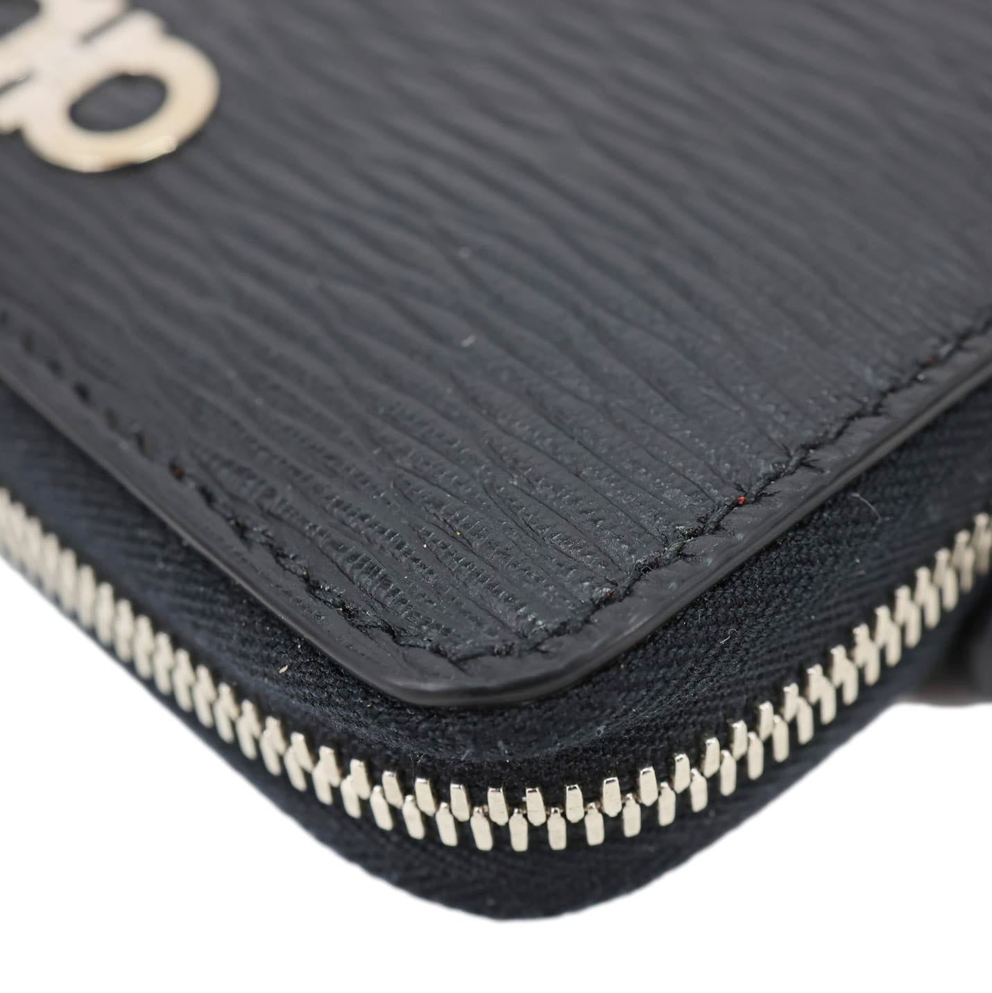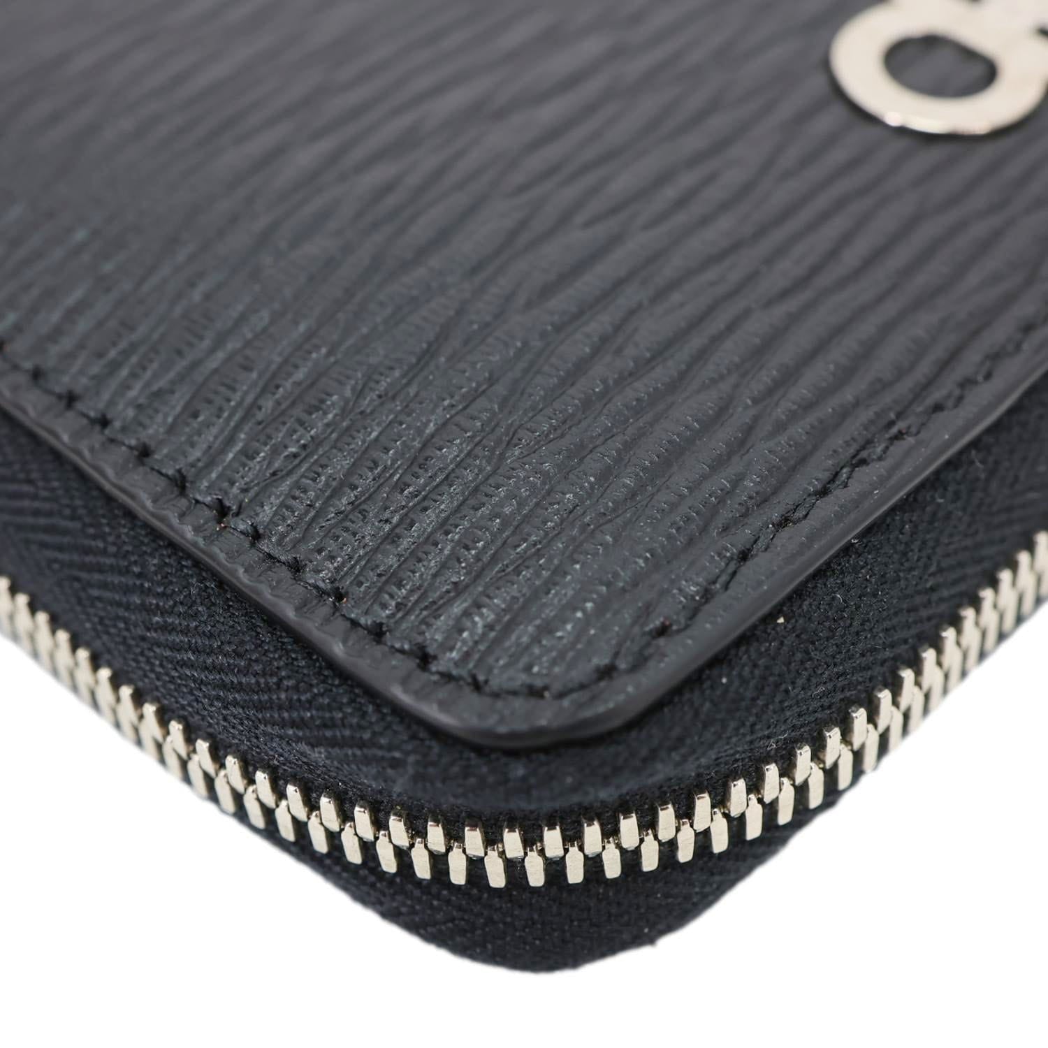 Sleek SALVATORE FERRAGAMO Gancini card case crafted in textured black leather with the iconic Gancini emblem for a refined touch. Compact yet functional design with multiple card slots, perfect for keeping essentials organized in style.