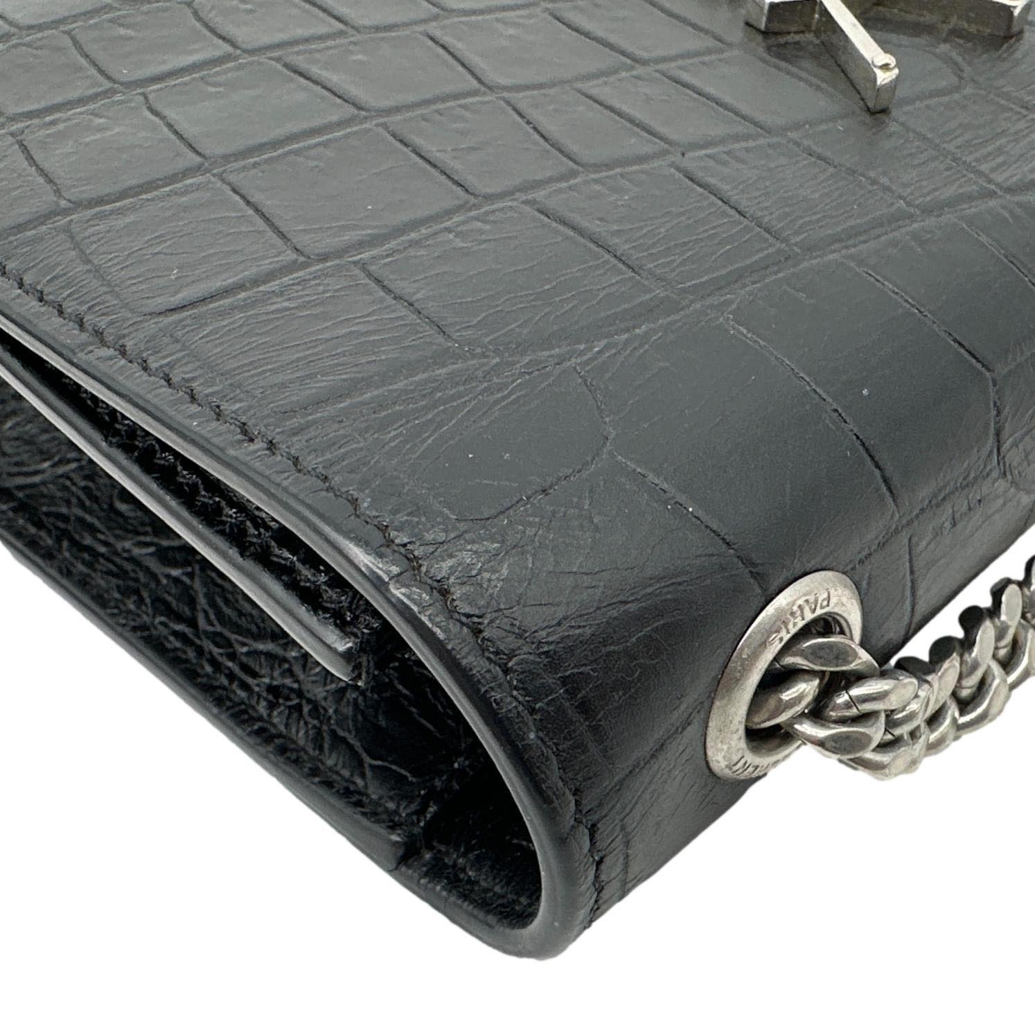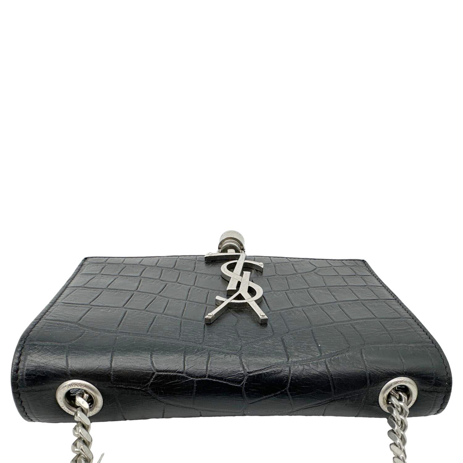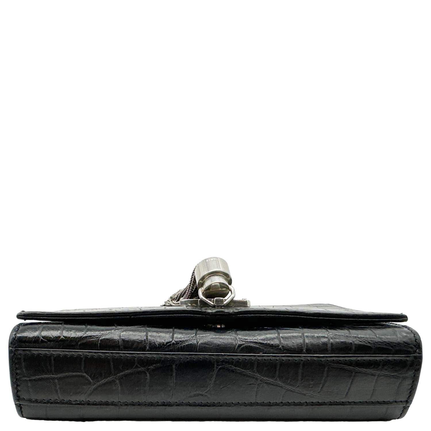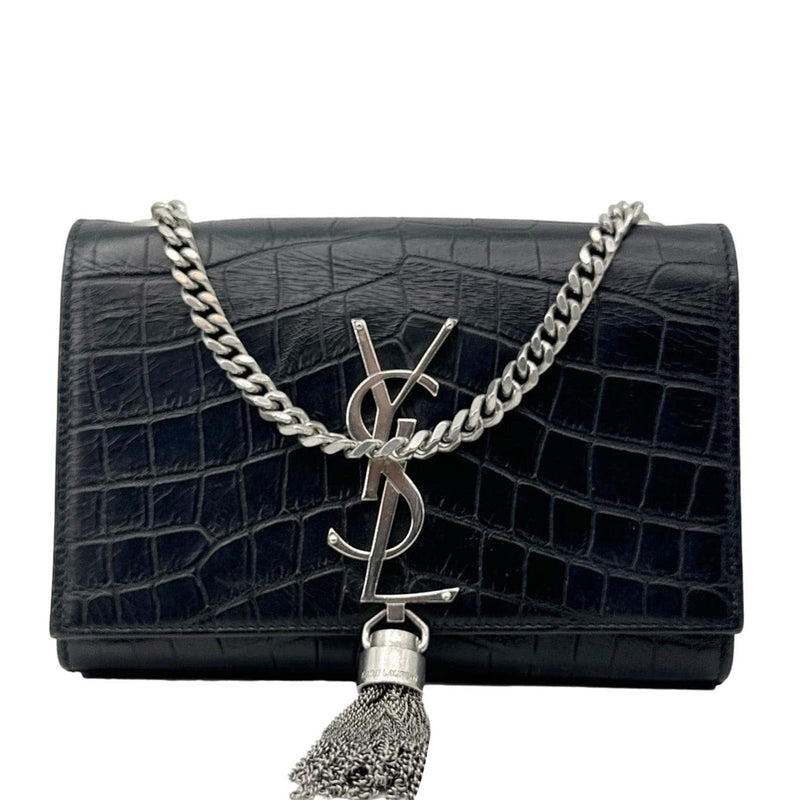 YVES SAINT LAURENT Kate Tassel crossbody in black crocodile-embossed leather with signature YSL logo. Features a sleek flap design with elegant tassel detail and chain strap. Chic and sophisticated, perfect for evening or elevated everyday style.