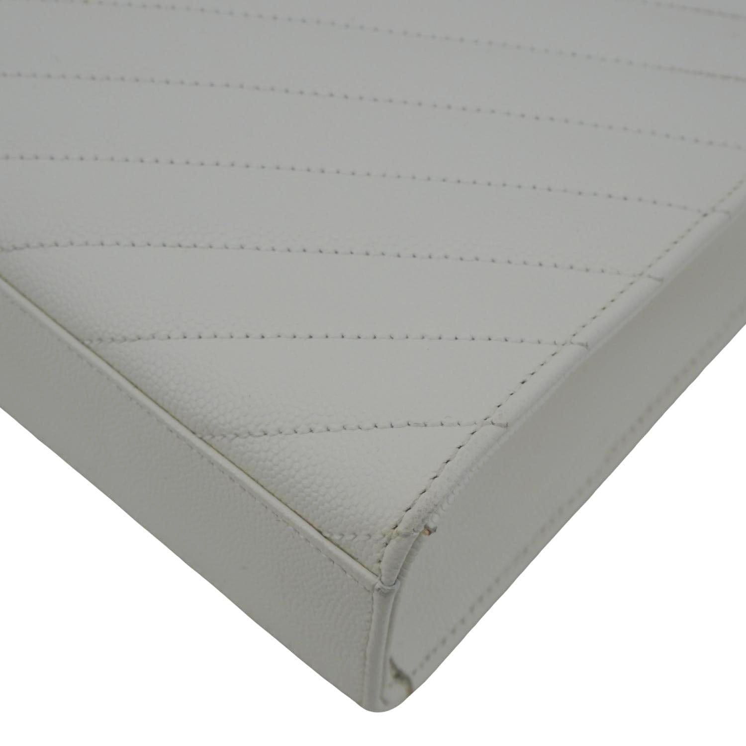 The YSL Envelope Large Crossbody Bag in white Grain de Poudre leather features signature chevron quilting and the iconic YSL logo. Sleek and structured, it’s a timeless piece for both day and night looks.