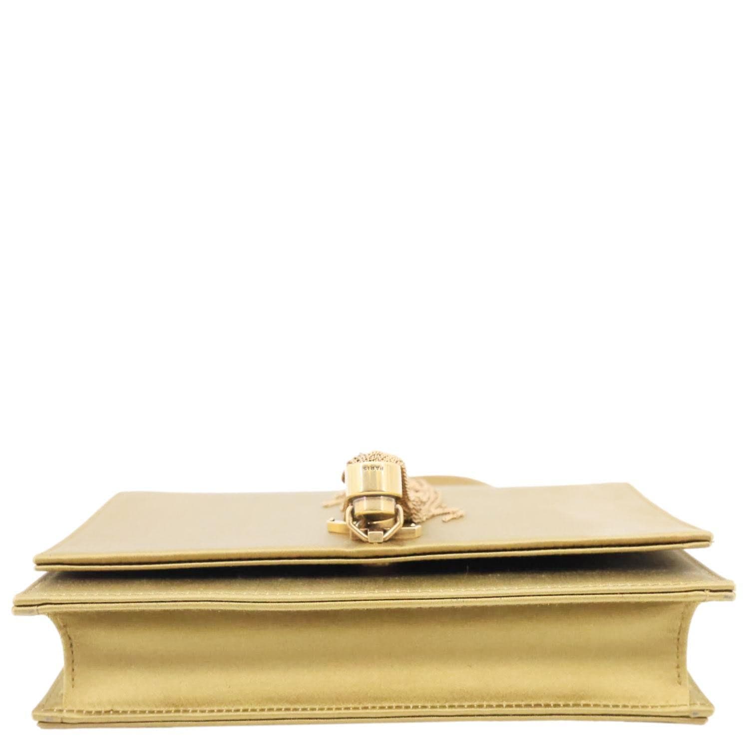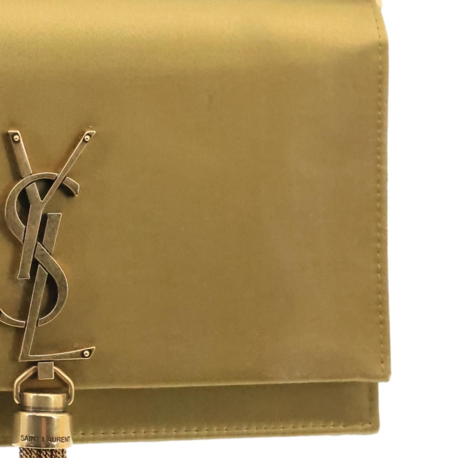 Yves Saint Laurent Kate Tassel Crossbody Bag, crafted in luxurious satin with a striking gold finish. Features the iconic YSL logo and elegant tassel detail with a chain strap. A glamorous statement piece perfect for evening wear and special occasions.