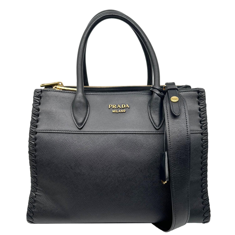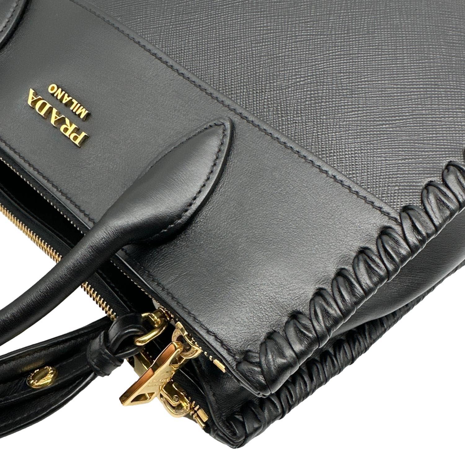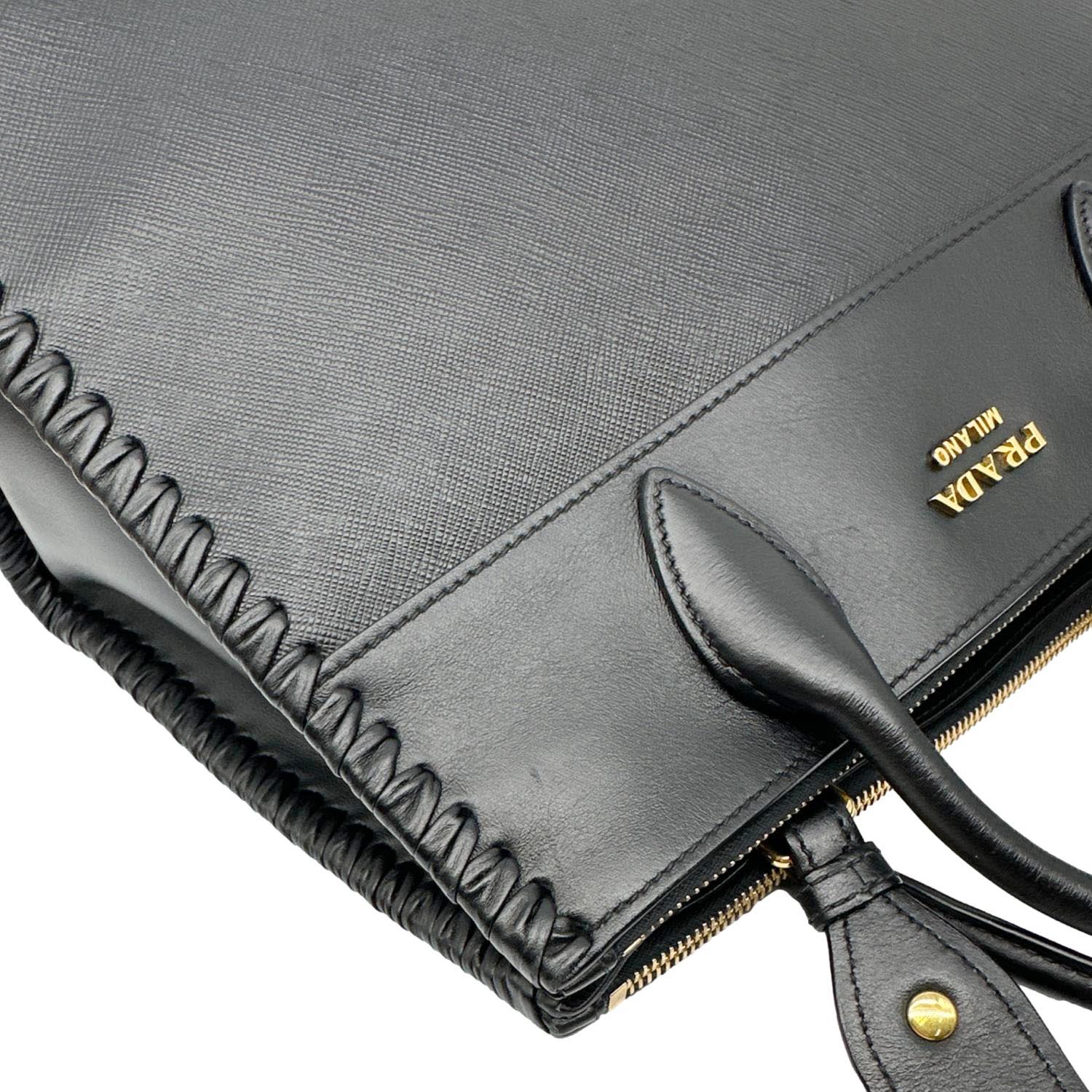 Prada Paradigme Tote in black combines saffiano and calf leather for a sleek, structured silhouette. Featuring a spacious interior and refined hardware, it’s perfect for elevated everyday luxury.
