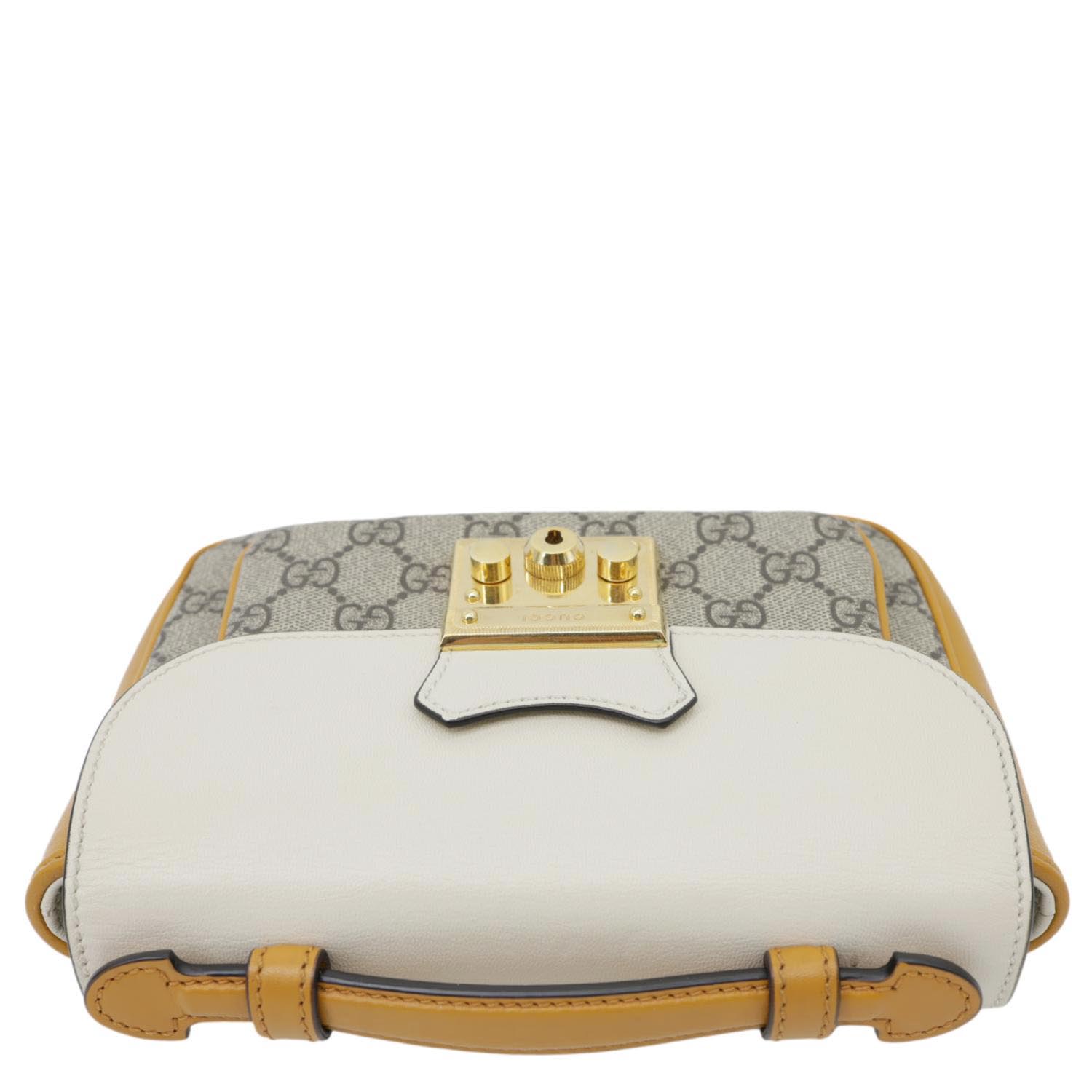 This GUCCI Padlock mini bag features a structured design in beige GG Supreme canvas with gold-toned hardware and black leather trim. The bag's compact size and adjustable chain strap make it perfect for everyday elegance.