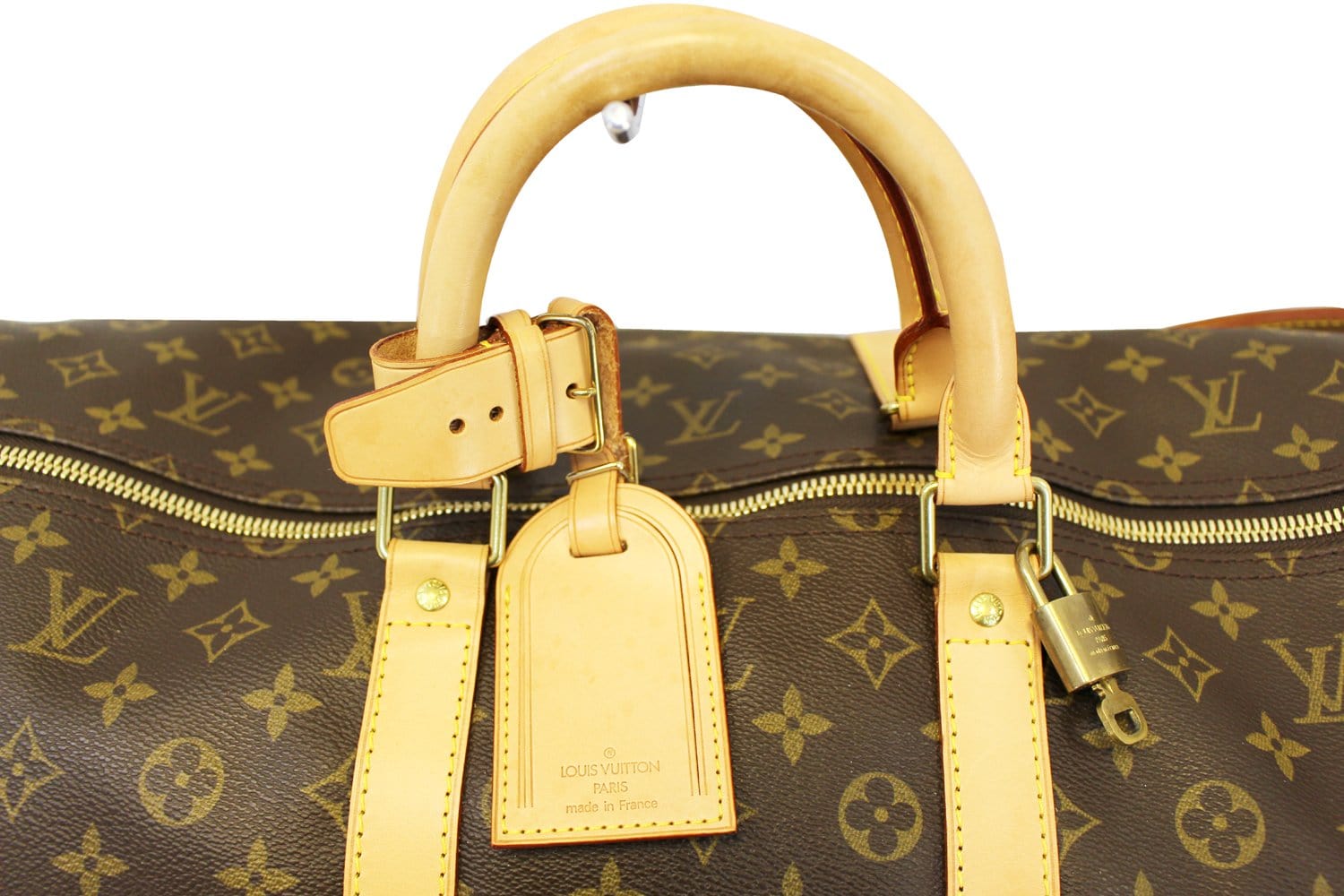 This stylish travel bag is finely crafted of classic Louis Vuitton monogram on coated canvas. The bag features vachetta cowhide rolled and reinforced leather top handles, an optional shoulder strap, trim, and polished brass hardware. The top zipper opens to a spacious brown fabric interior .