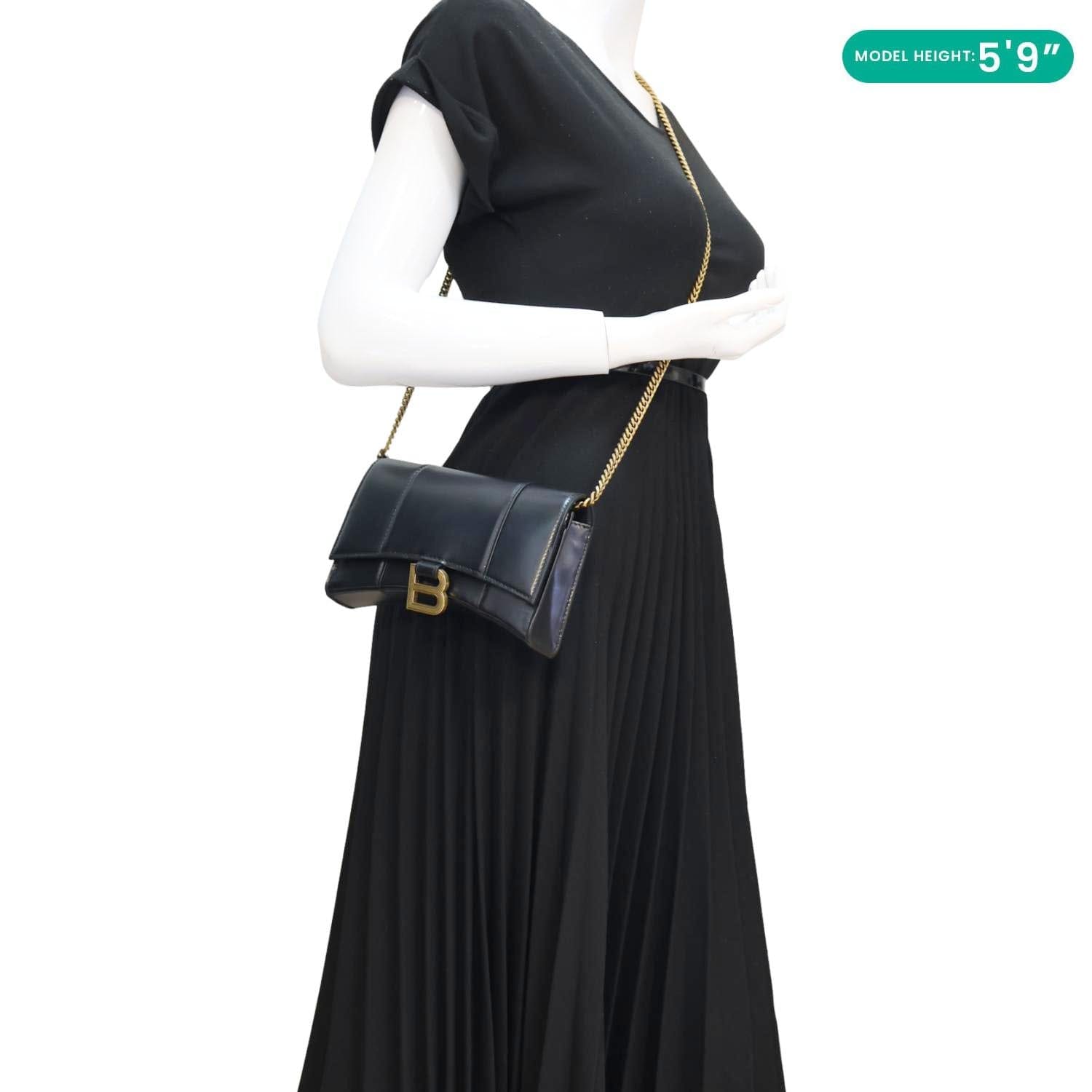 The Balenciaga Hourglass Wallet On Chain is crafted from shiny box calfskin leather in sleek black. Designed with the brand’s iconic curved silhouette, it features a versatile chain strap for shoulder or crossbody wear.