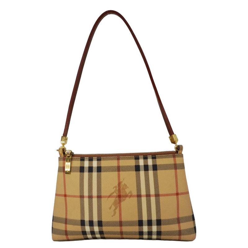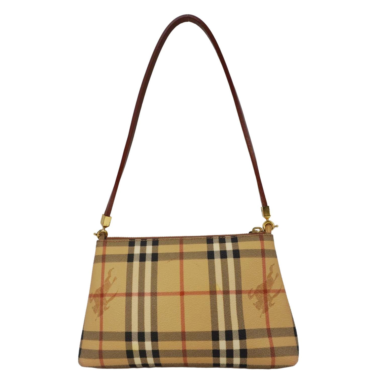 The Burberry Haymarket House Check Pochette Bag in beige features the iconic house check canvas with leather trim. Compact and stylish, it’s a perfect accessory for carrying essentials with timeless elegance.