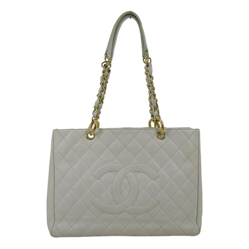 Elevate your style with this timeless CHANEL Grand Shopping Tote. Crafted in exquisite caviar leather, this luxurious white tote exudes sophistication, offering ample space and iconic elegance for your essentials