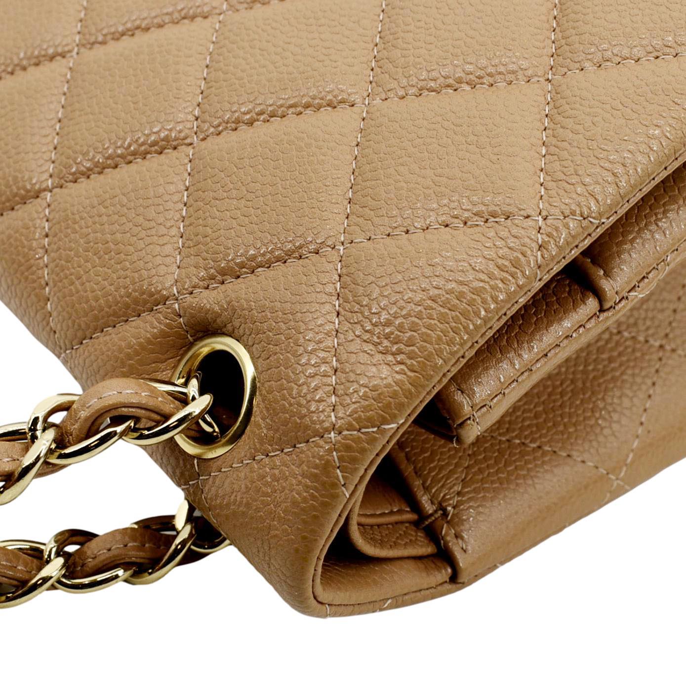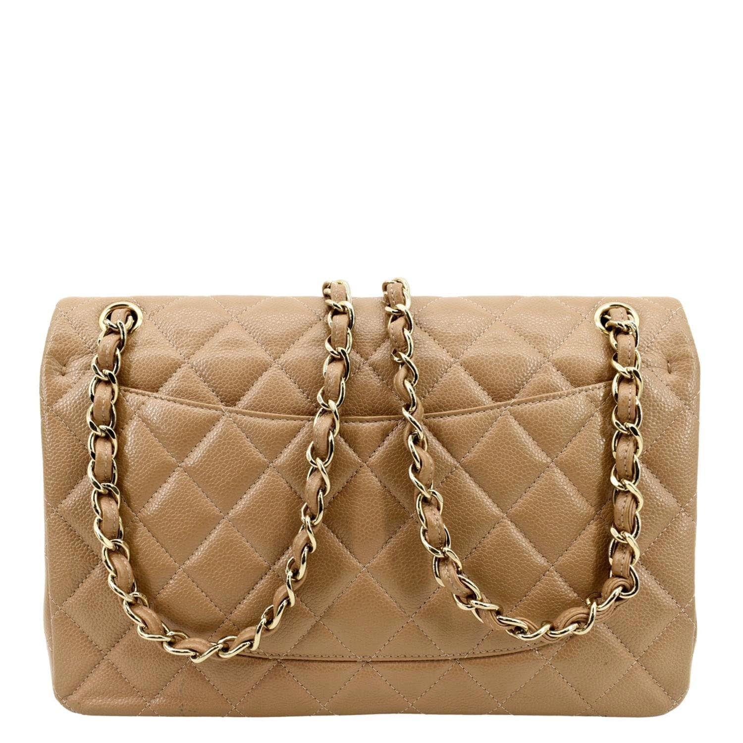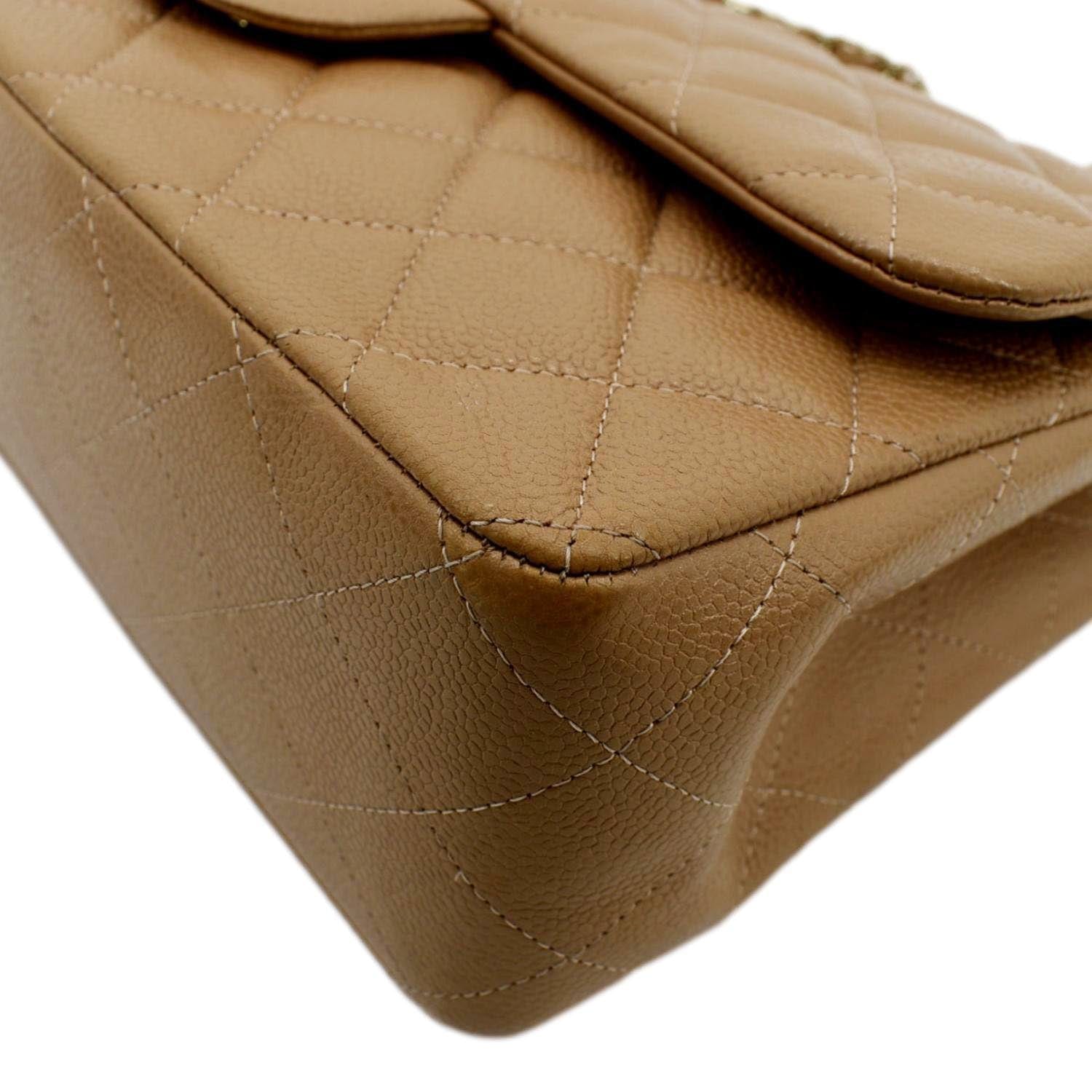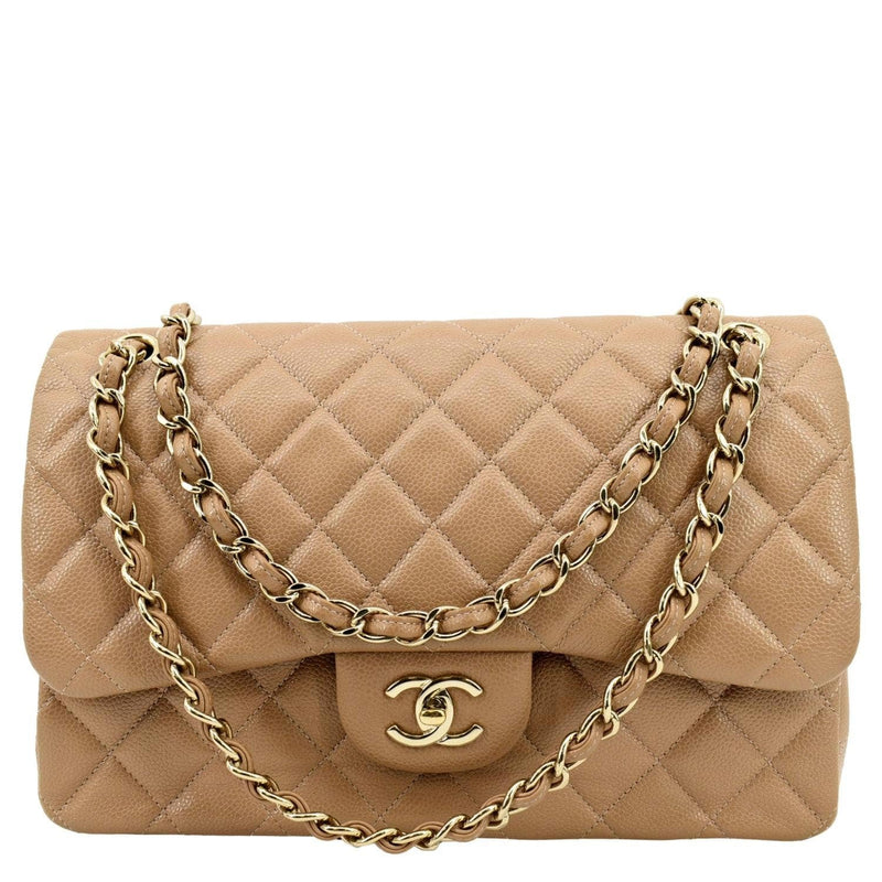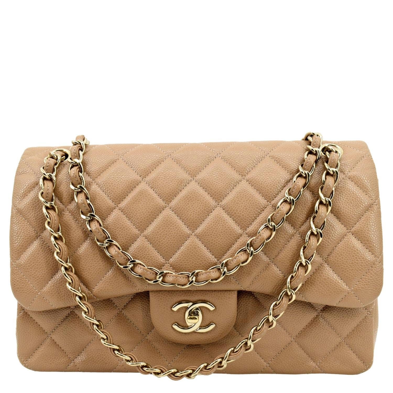 CHANEL Classic Jumbo Double Flap Quilted Caviar Leather Shoulder Bag Beige
