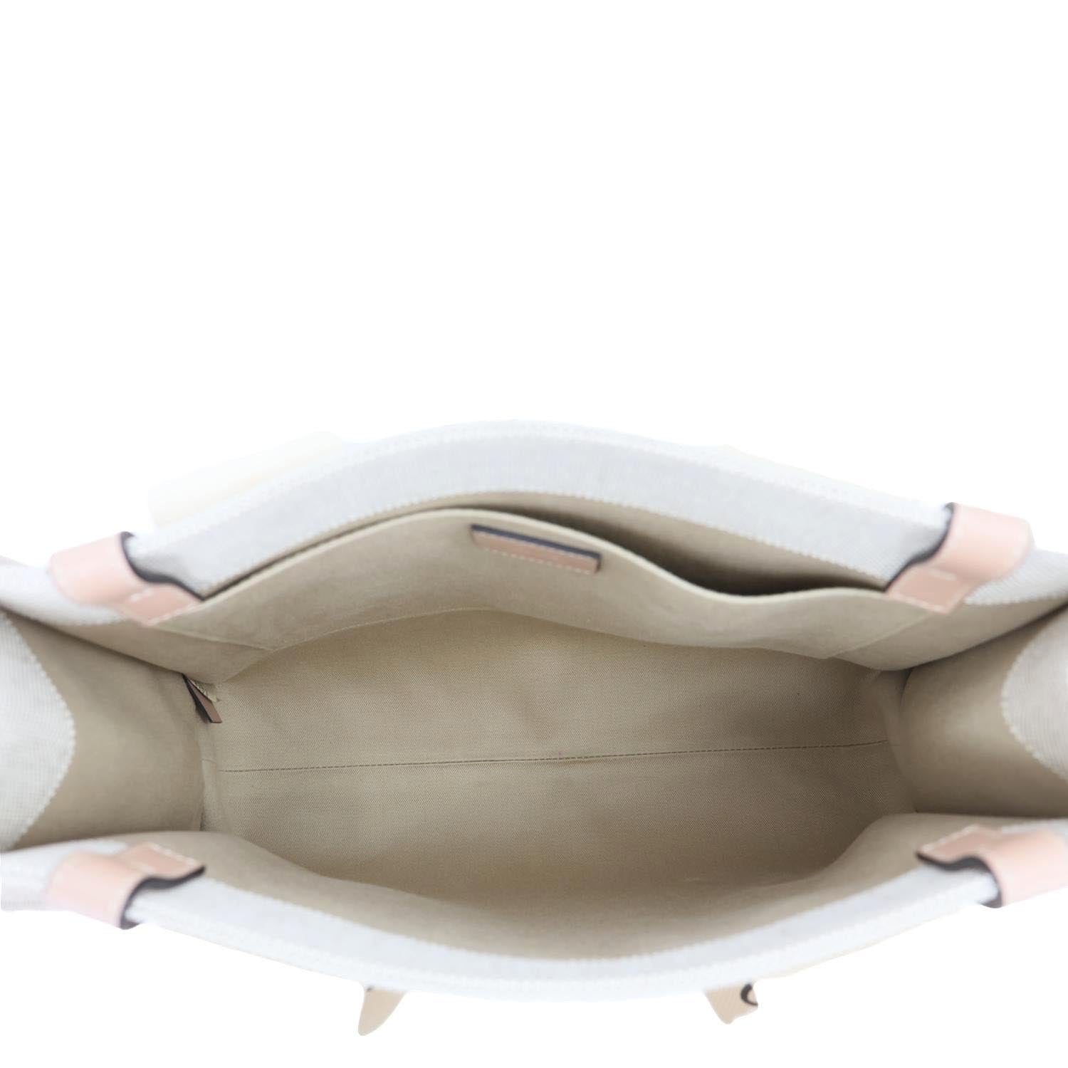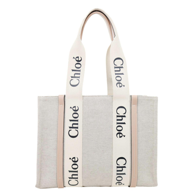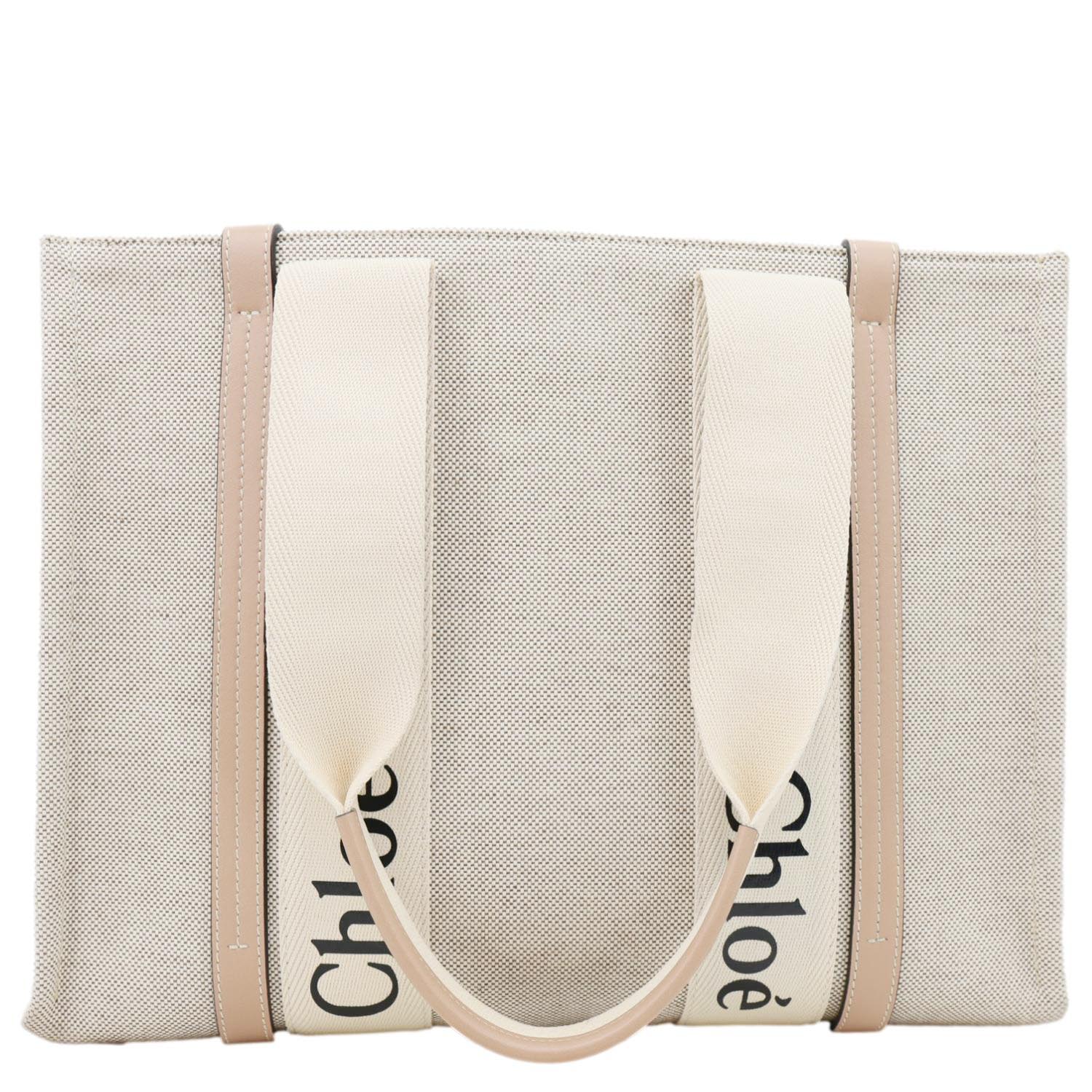 CHLOÉ Woody Linen Canvas Tote Bag Beige features natural linen canvas with signature logo straps for a casual yet chic look. Its roomy interior makes it perfect for everyday essentials with effortless style.
