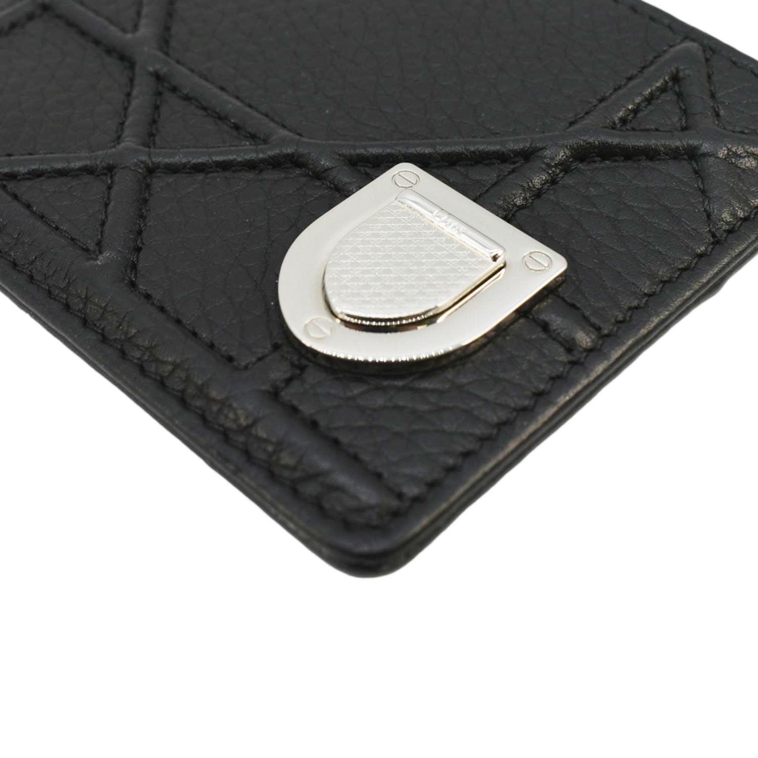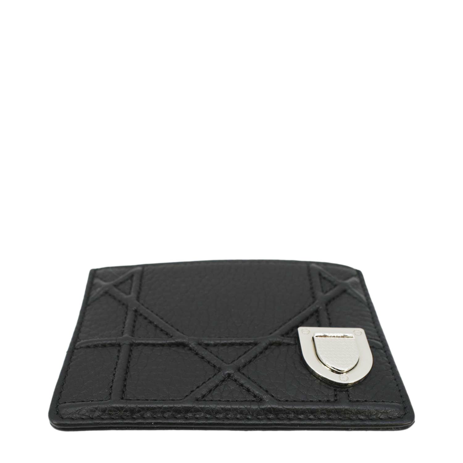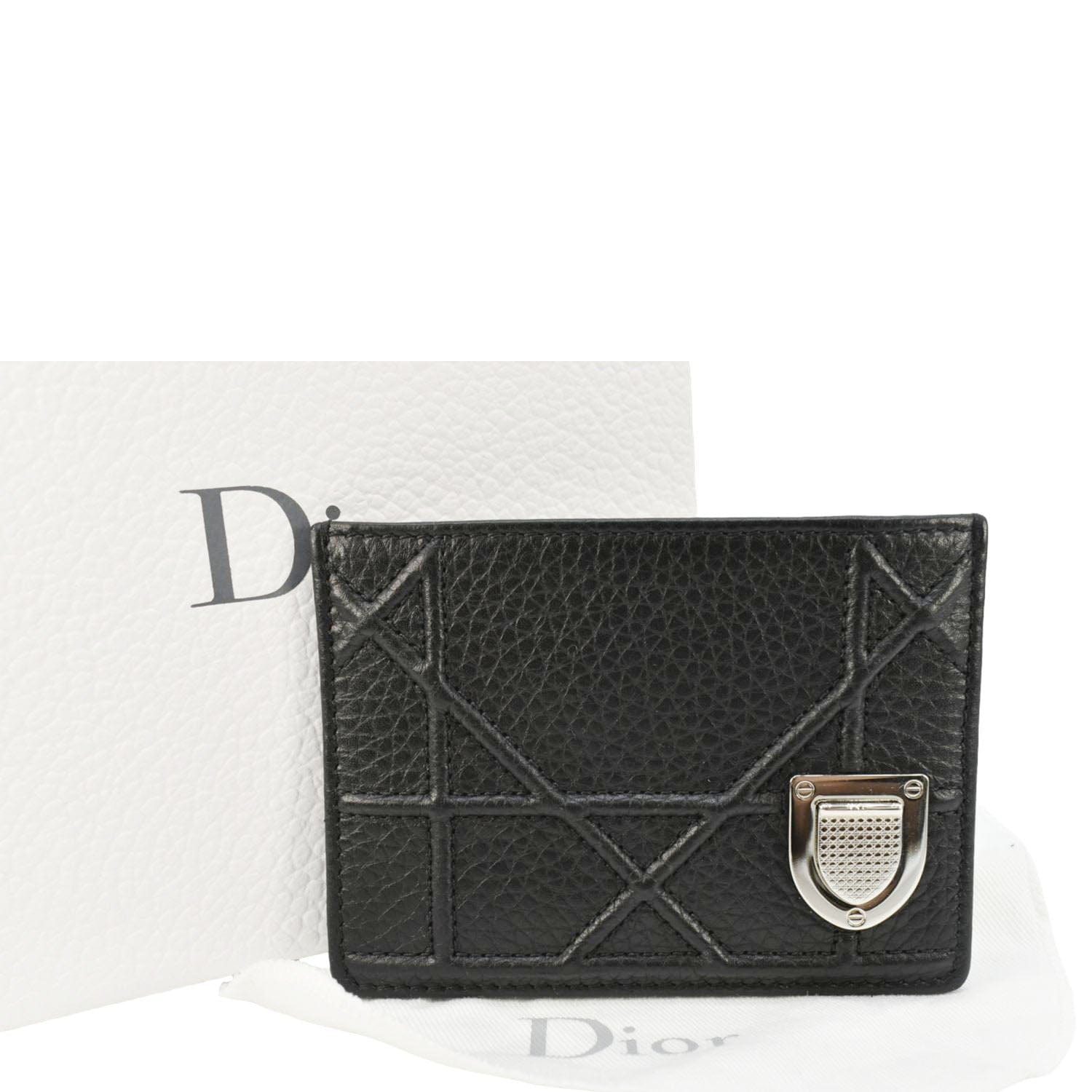 The Christian Dior Diorama Card Holder in black leather features the signature Diorama pattern with sleek metallic details. Compact and elegant, it's ideal for carrying essential cards with a touch of sophistication.