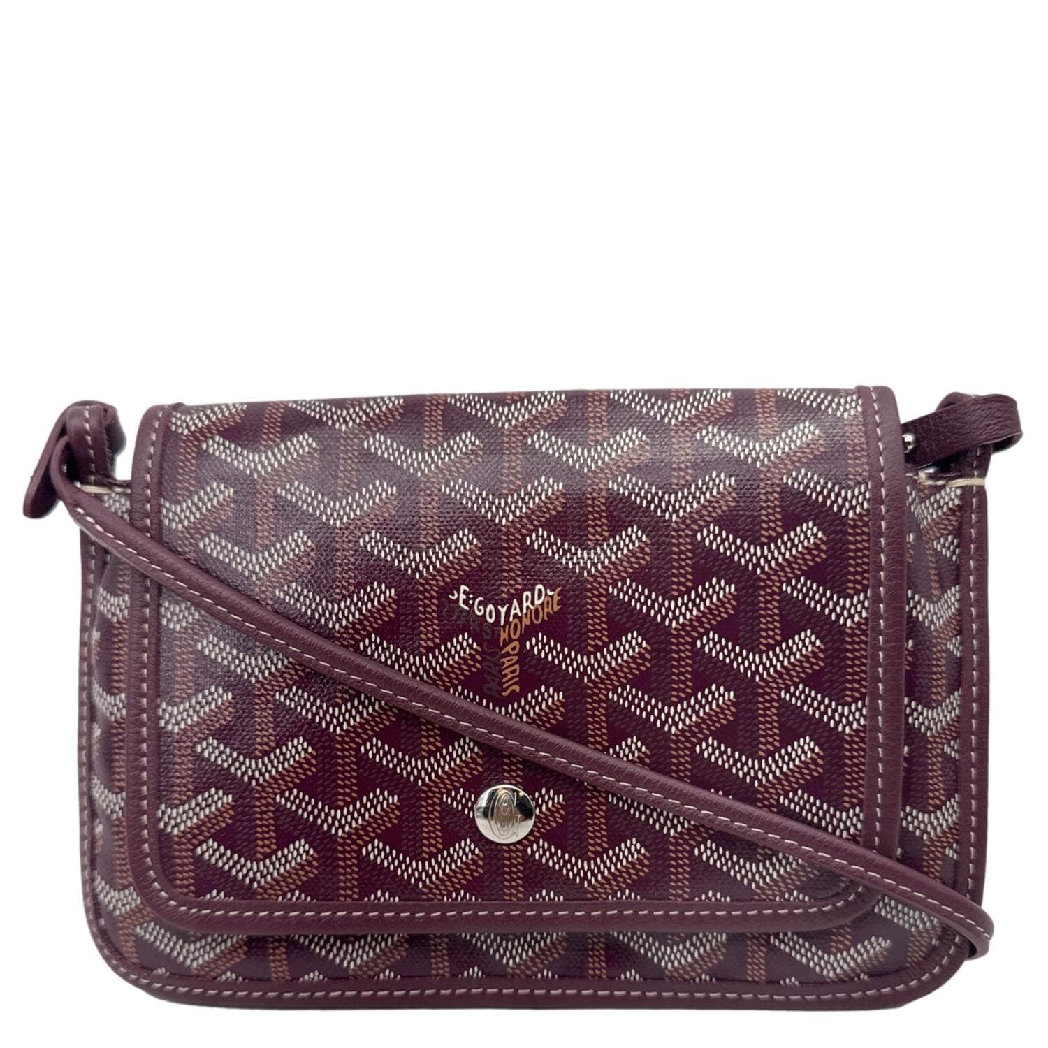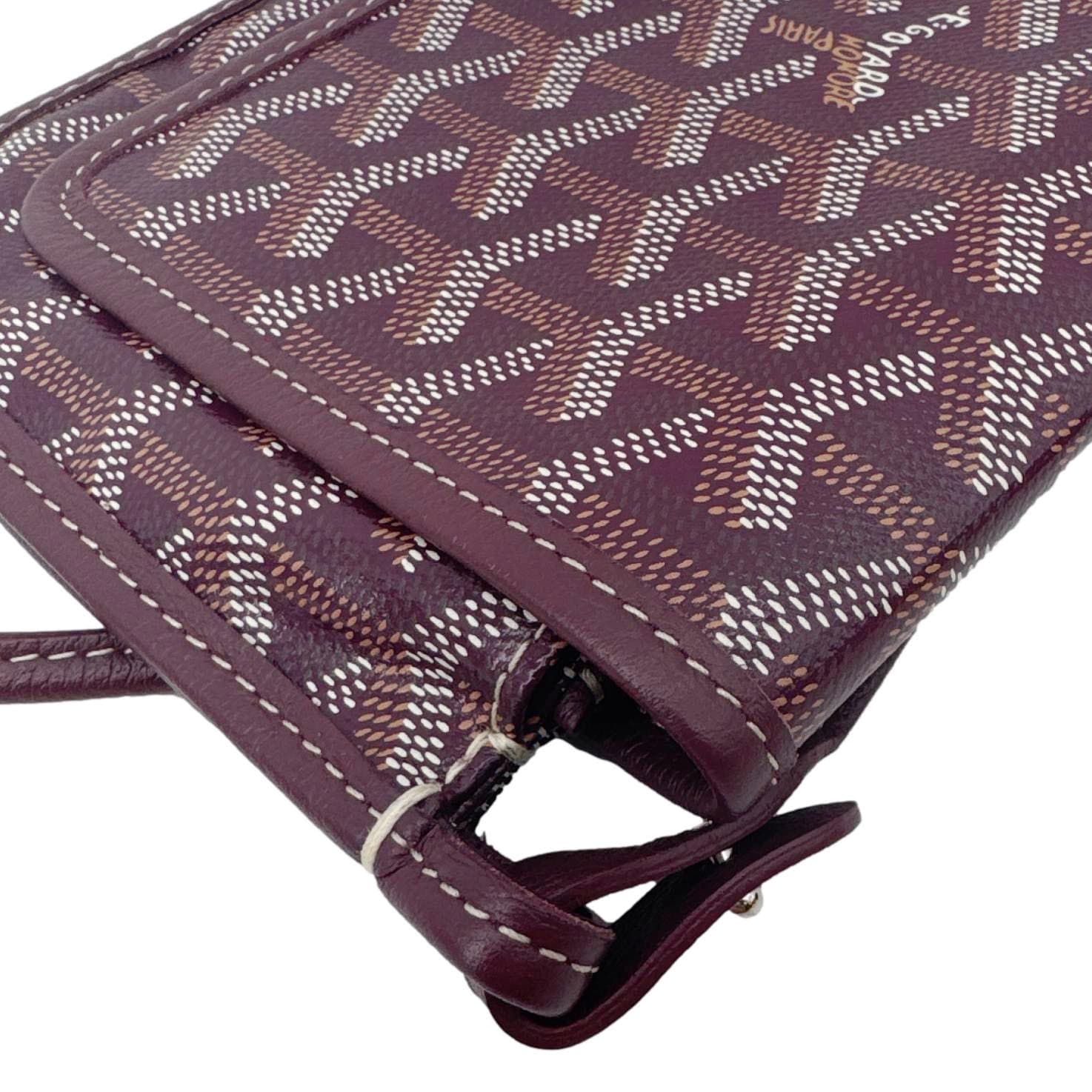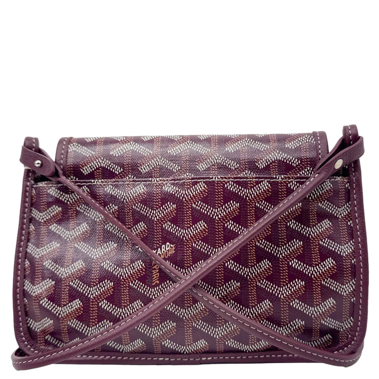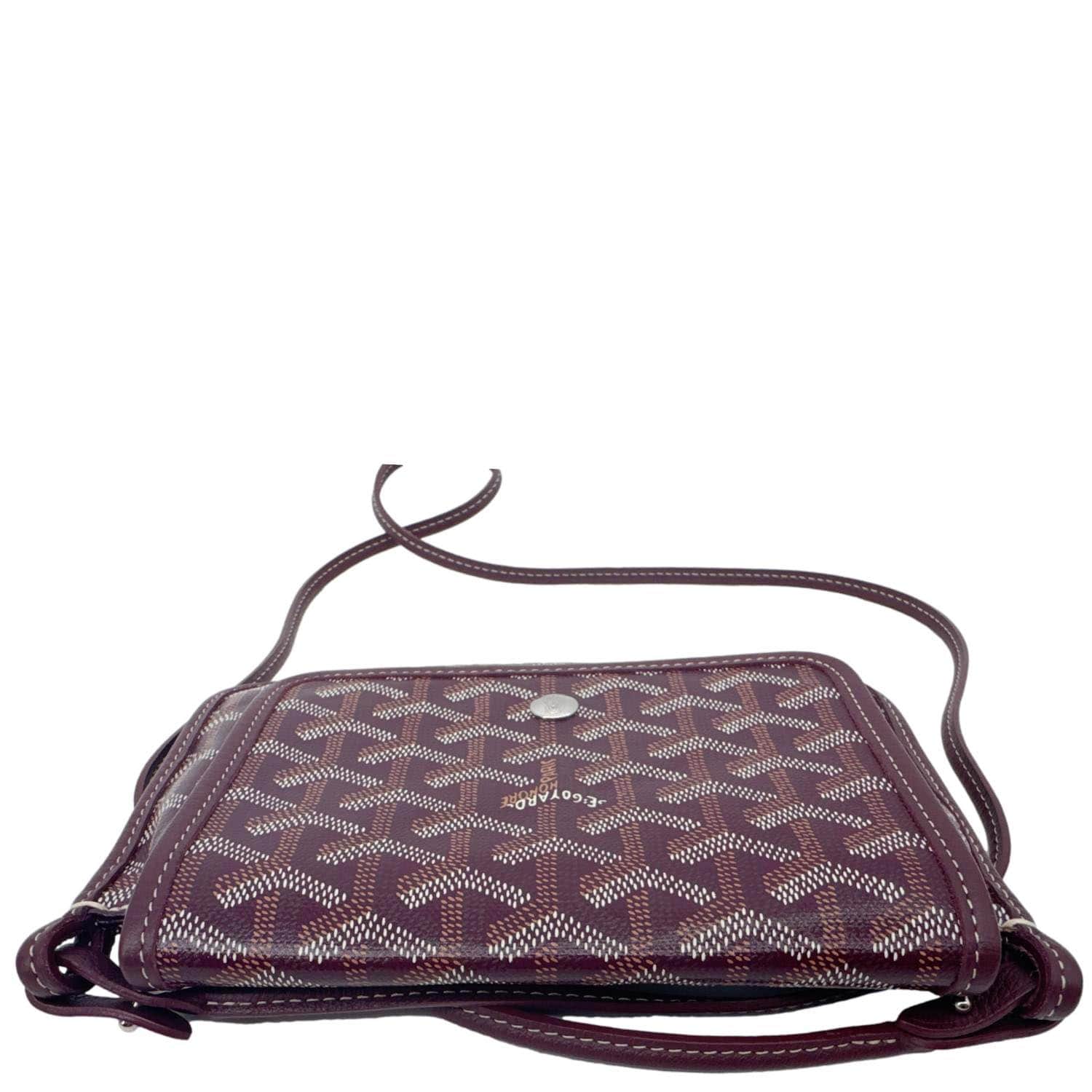 GOYARD Plumet Shoulder Bag in signature chevron print canvas with burgundy leather trim. Lightweight and compact, perfect for crossbody or shoulder wear with timeless elegance.