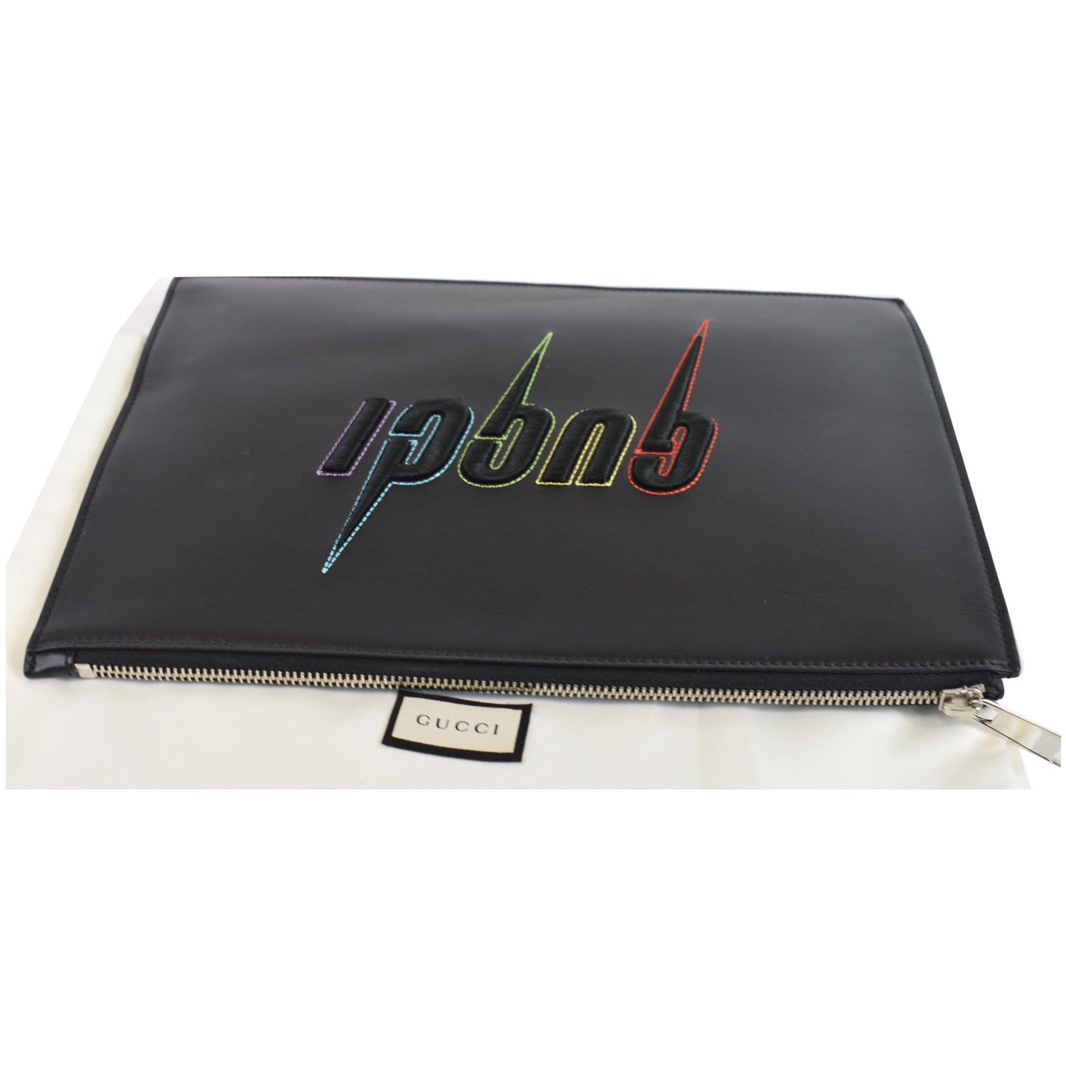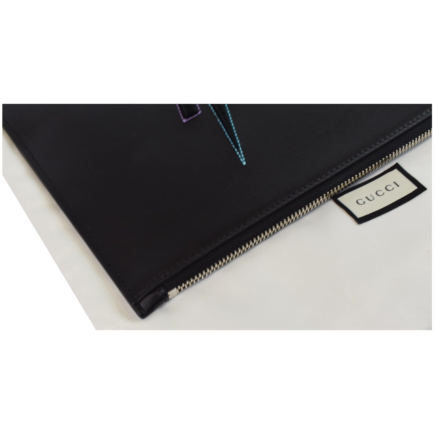 GUCCI Blade Embroidery Leather Wristlet Pouch Black 597678