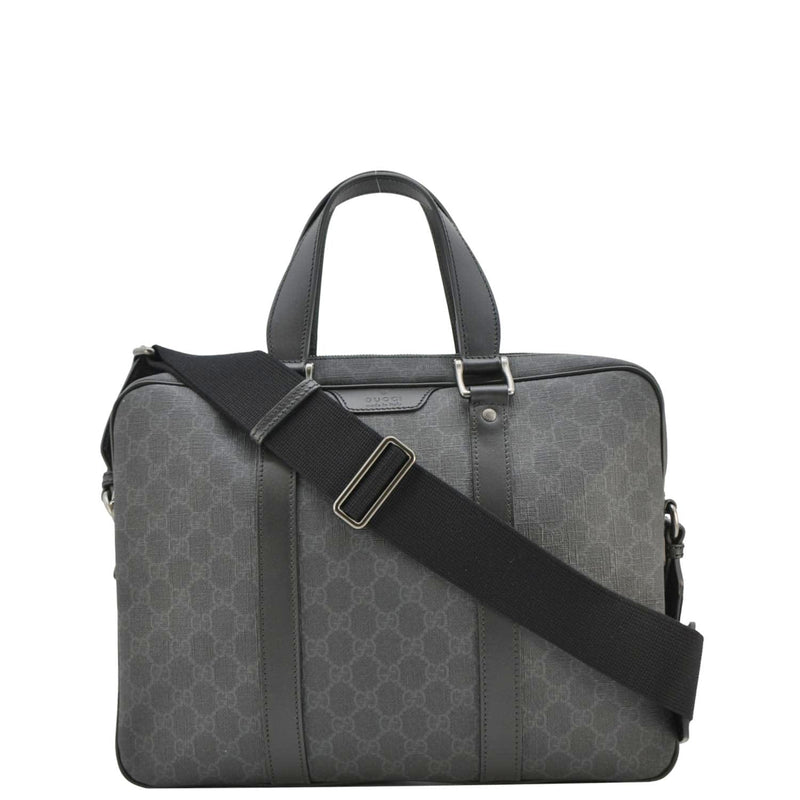 The GUCCI Business 2-Way GG Supreme Monogram Briefcase in Black features the iconic GG Supreme canvas with sleek black leather accents. This versatile briefcase offers both top handle and shoulder strap options, perfect for a sophisticated business look.