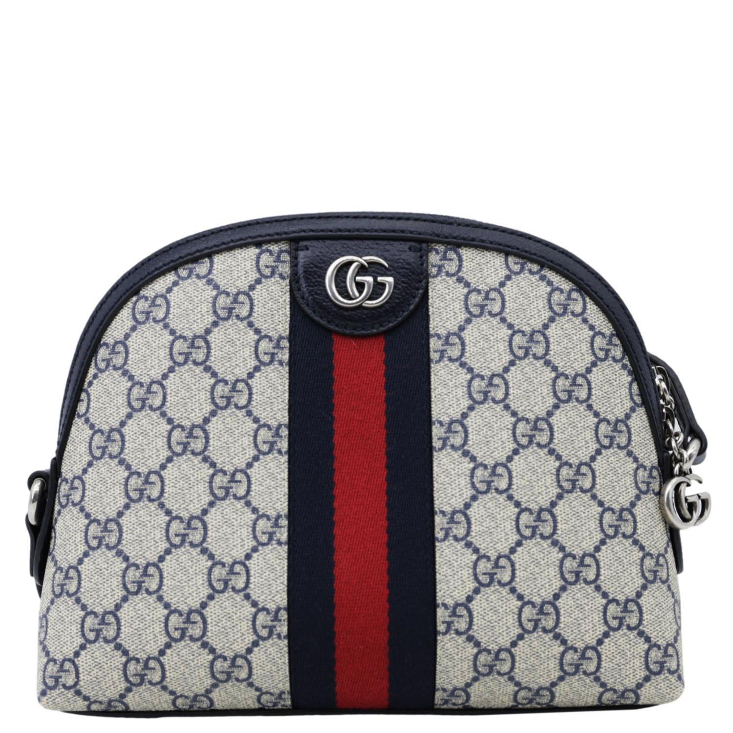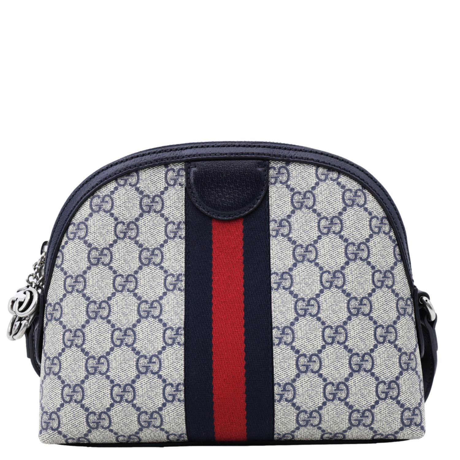 This GUCCI Ophidia Dome Small bag features a bold GG Supreme canvas in navy blue, adorned with iconic Web stripe detailing and gold-tone hardware. The compact design with leather trim and shoulder strap makes it perfect for everyday elegance.