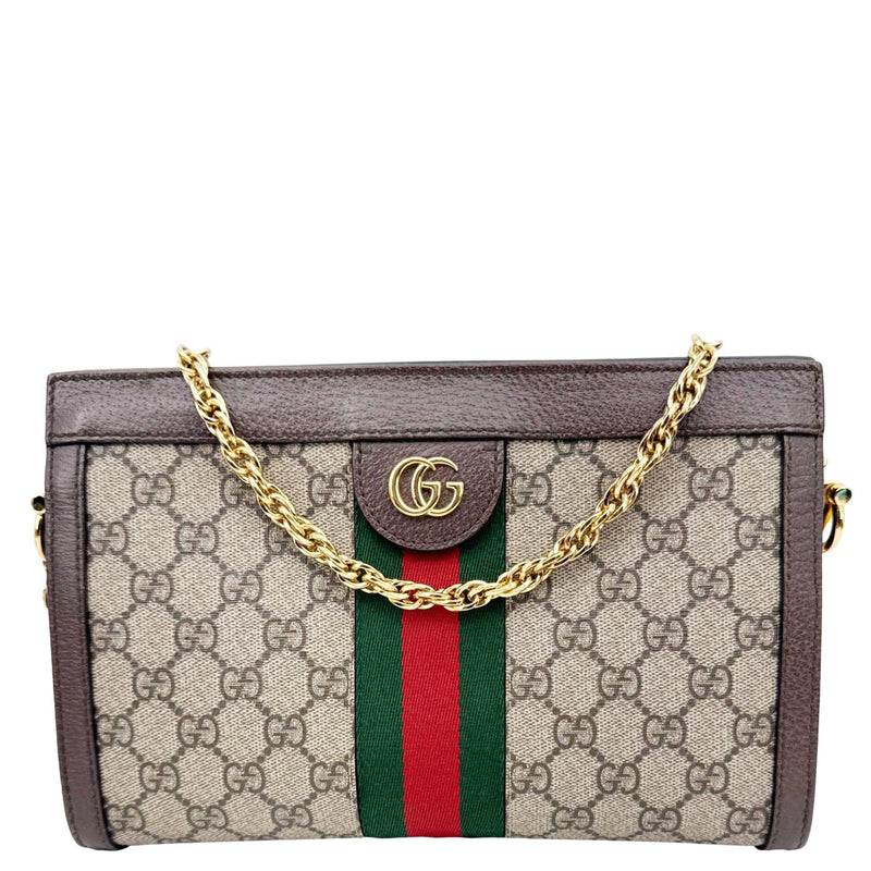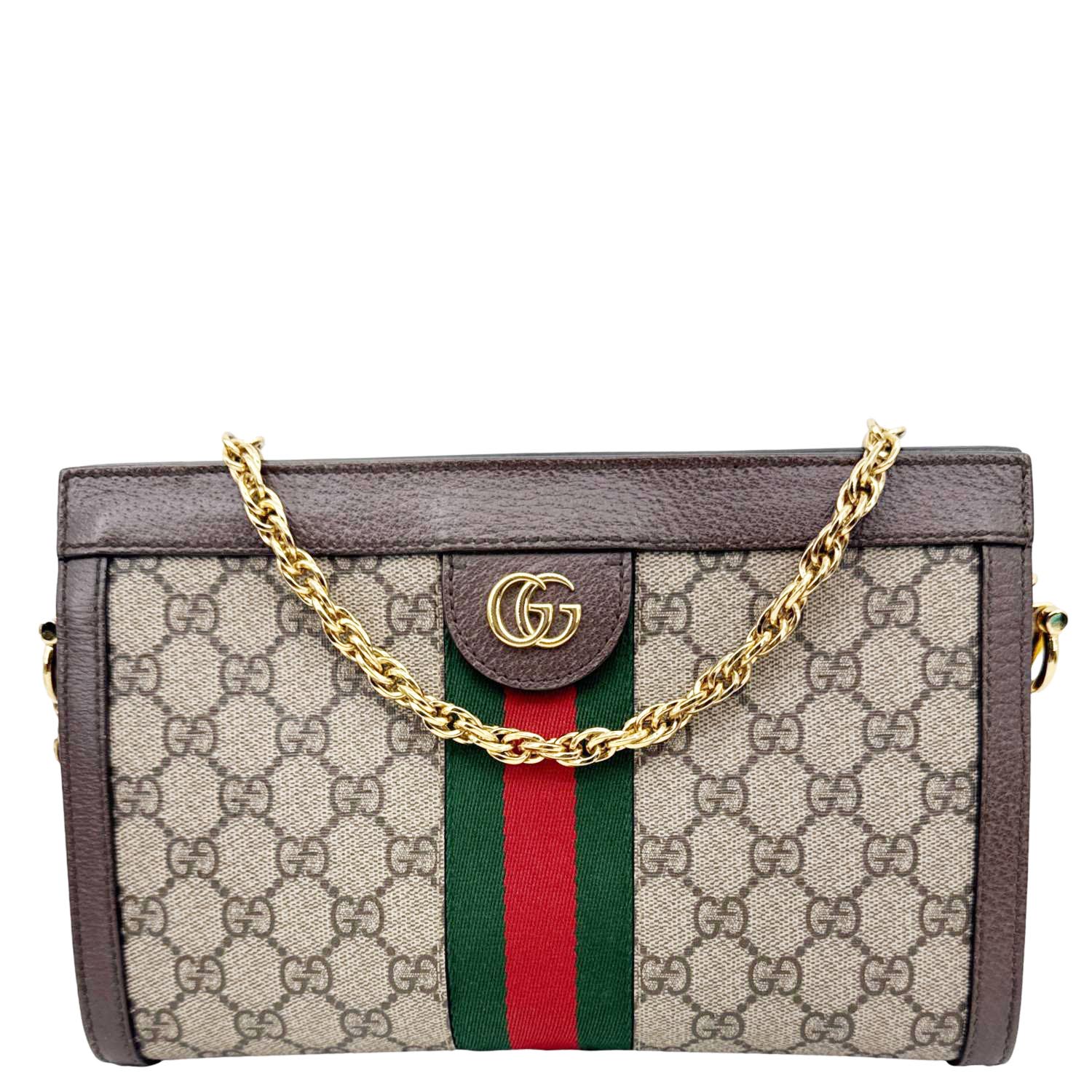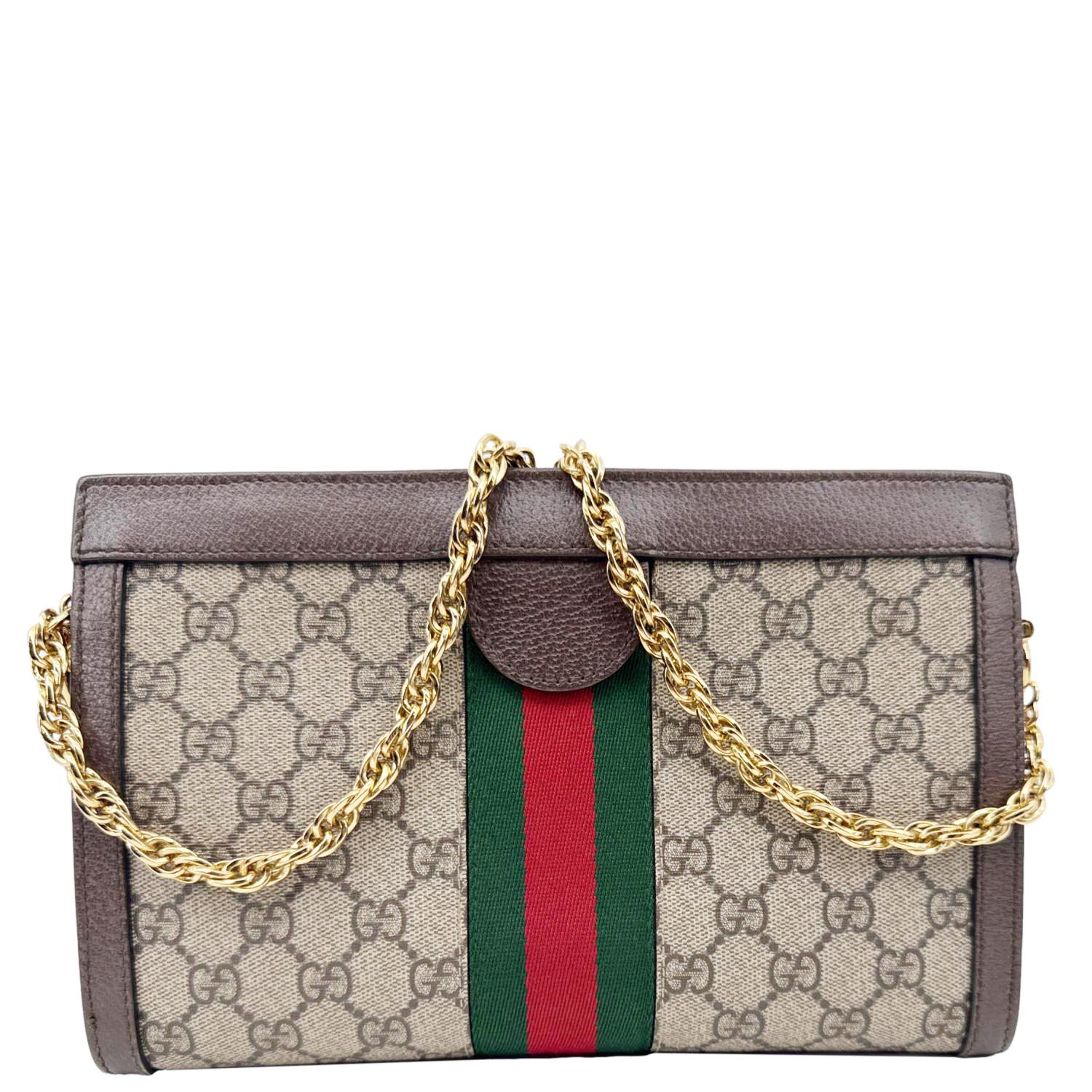 Crafted in GG Supreme canvas with beige tones, accented by the iconic green-red-green Web stripe. Features gold-tone Double G hardware, a compact shape, and a chain shoulder strap for versatile wear. A timeless blend of heritage and modern style.