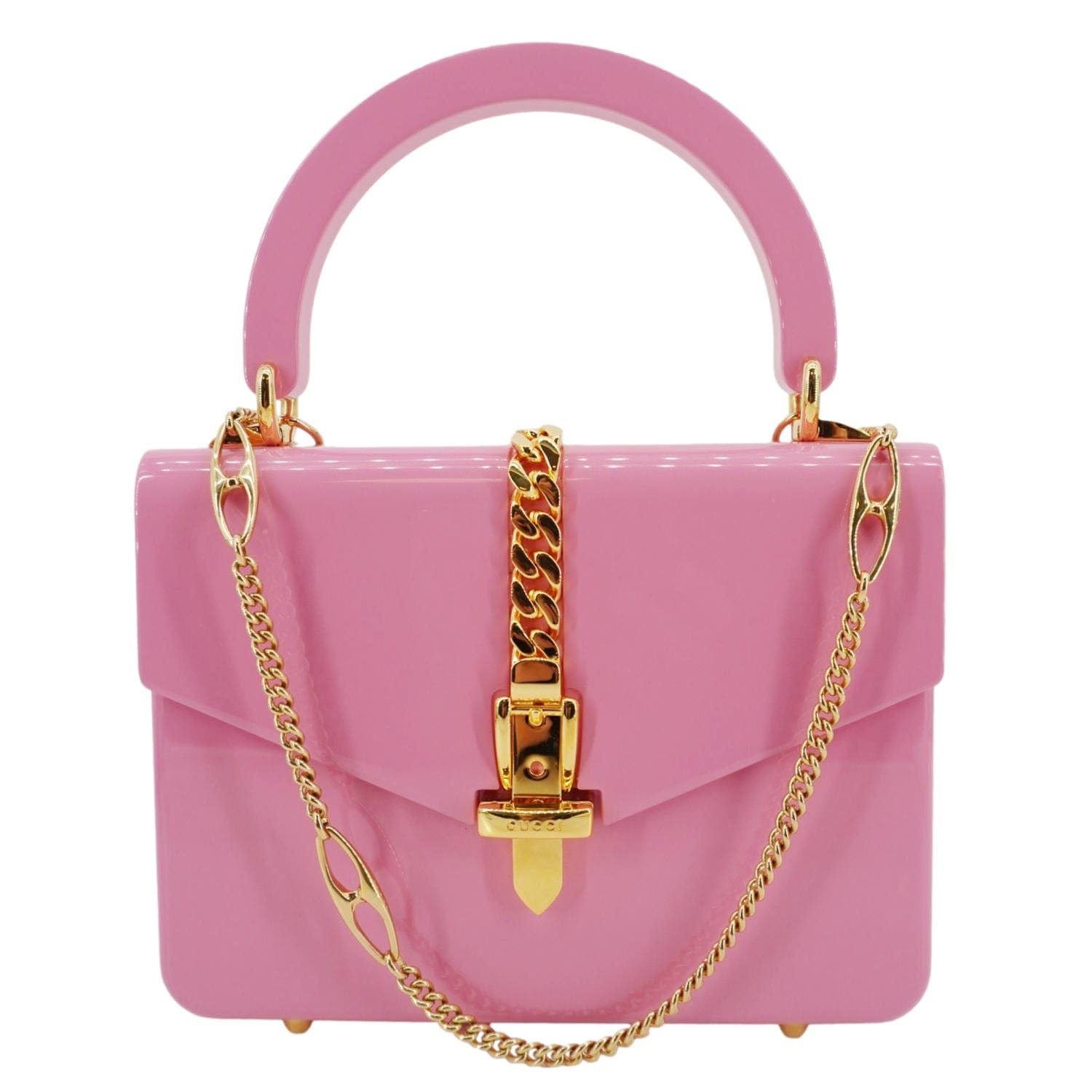 The Gucci Sylvie 1969 Plexiglass Top Handle Crossbody Bag in Pink exudes vintage elegance with its structured silhouette and gold-tone chain detail. Crafted from glossy plexiglass, it offers a statement-making touch to any ensemble.