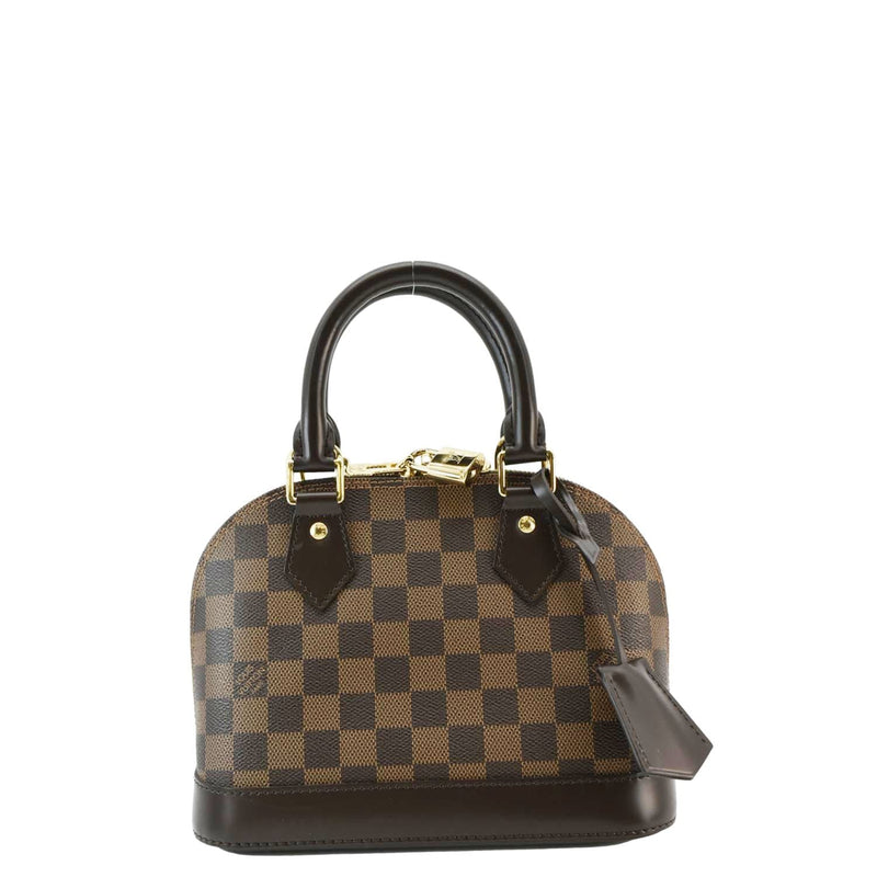 The Louis Vuitton Alma BB Satchel in Damier Ebene canvas is a compact and iconic brown bag. It features a structured silhouette with gold-tone hardware, double top handles, and a detachable shoulder strap, offering elegance and versatility for any occasion.