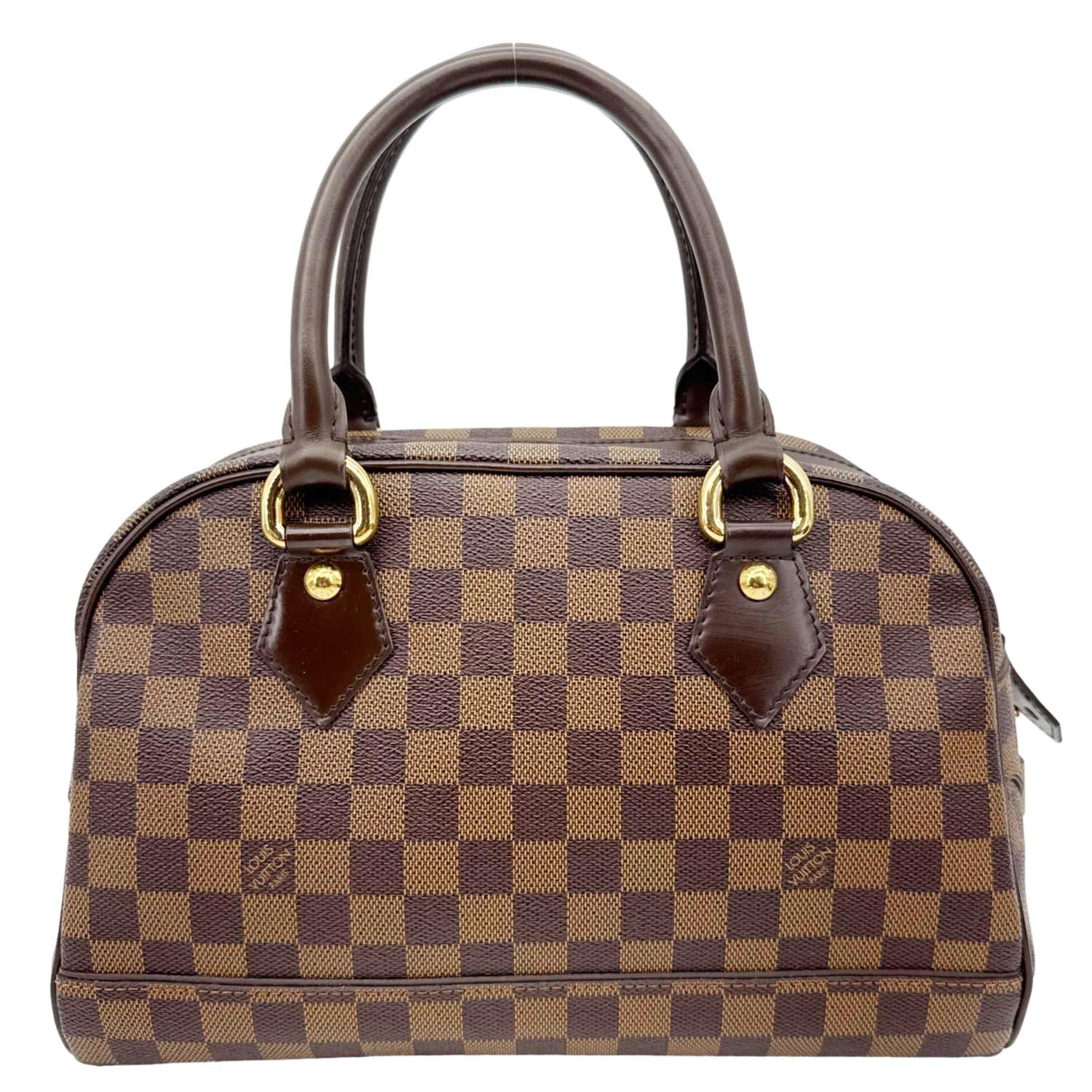 Louis Vuitton Duomo Damier Ebene Satchel Bag in brown, crafted from signature checkered canvas with smooth leather trim. Features a structured silhouette, roomy interior, and elegant rolled handles for timeless everyday style.