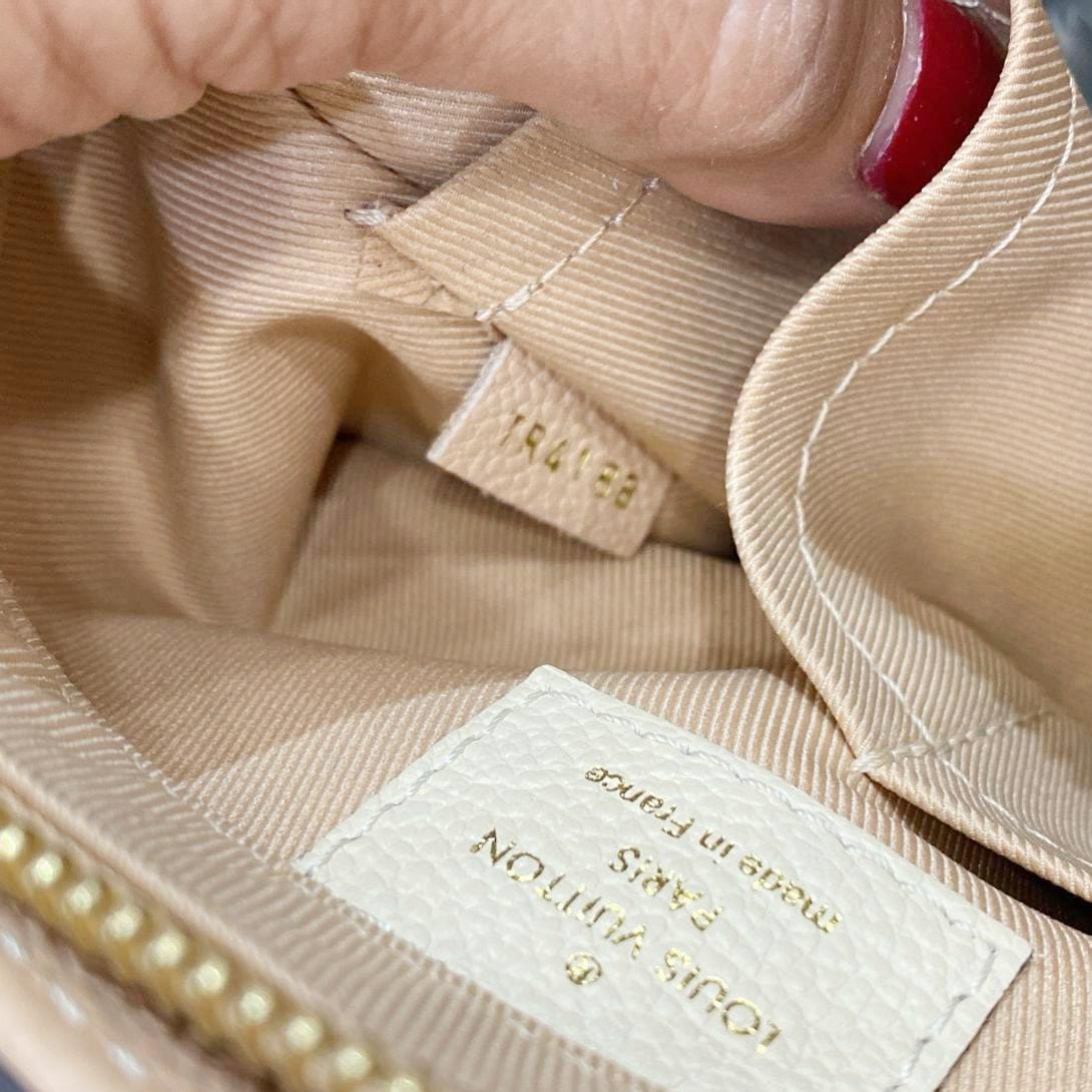 LOUIS VUITTON Sully PM in Monogram Empreinte leather with soft pleats and refined Papyrus tone. Features a spacious interior, braided handle, and elegant gold-tone hardware for everyday sophistication.