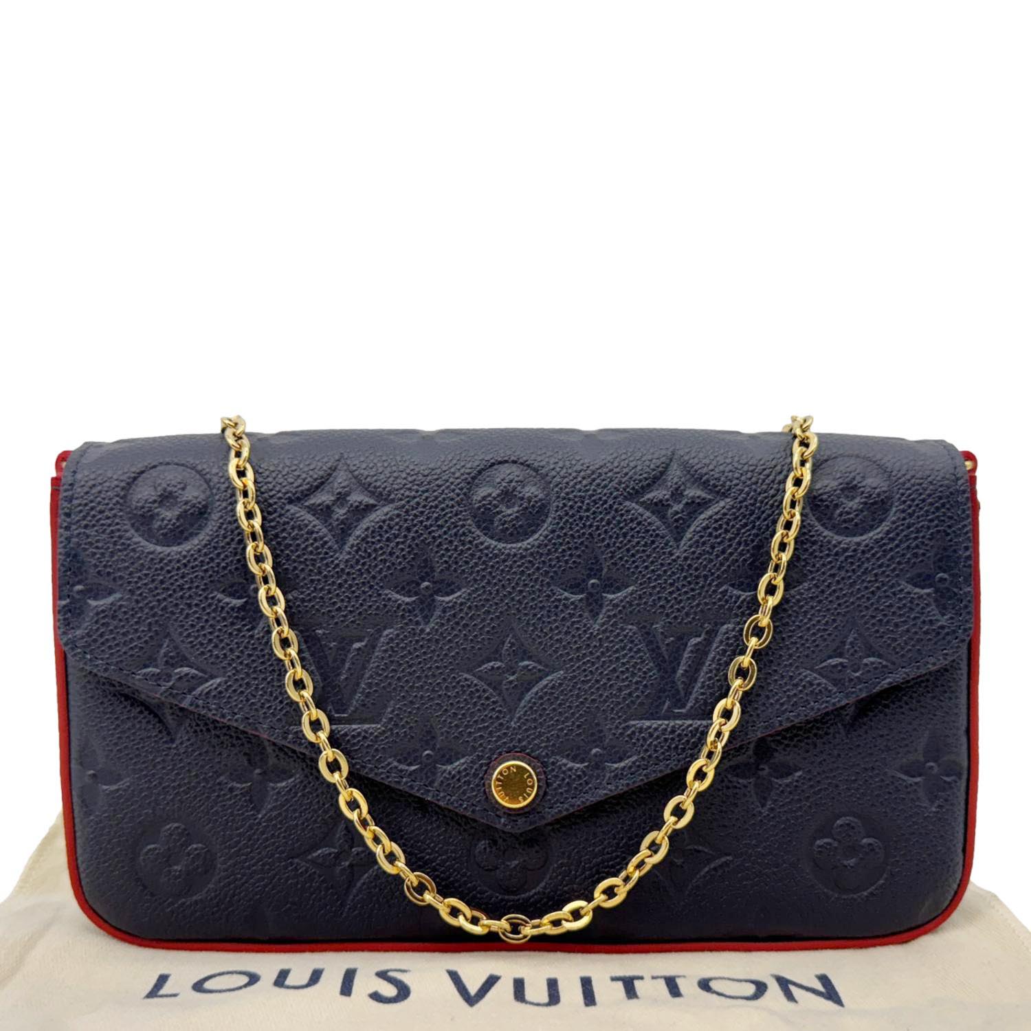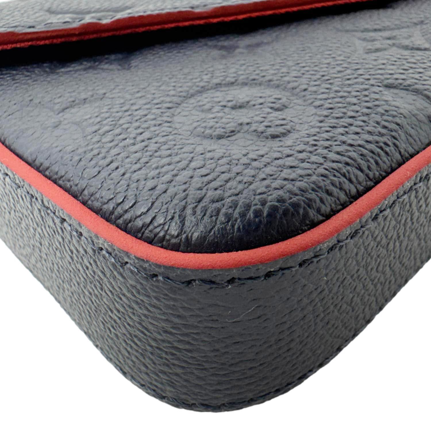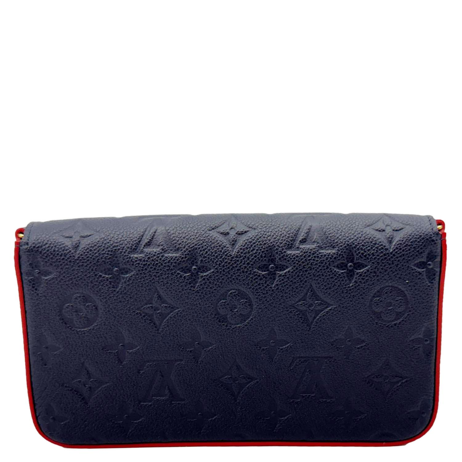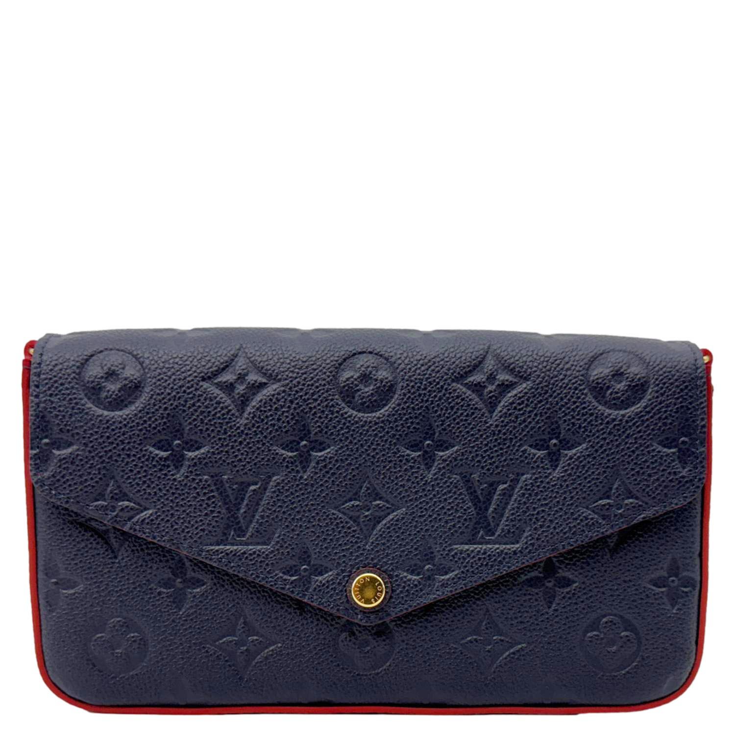 The LOUIS VUITTON Félicie Pochette in Navy Blue Monogram Empreinte Leather features a sleek envelope design with embossed monogram detailing. Versatile and elegant, it includes a removable chain strap for crossbody or clutch styling.