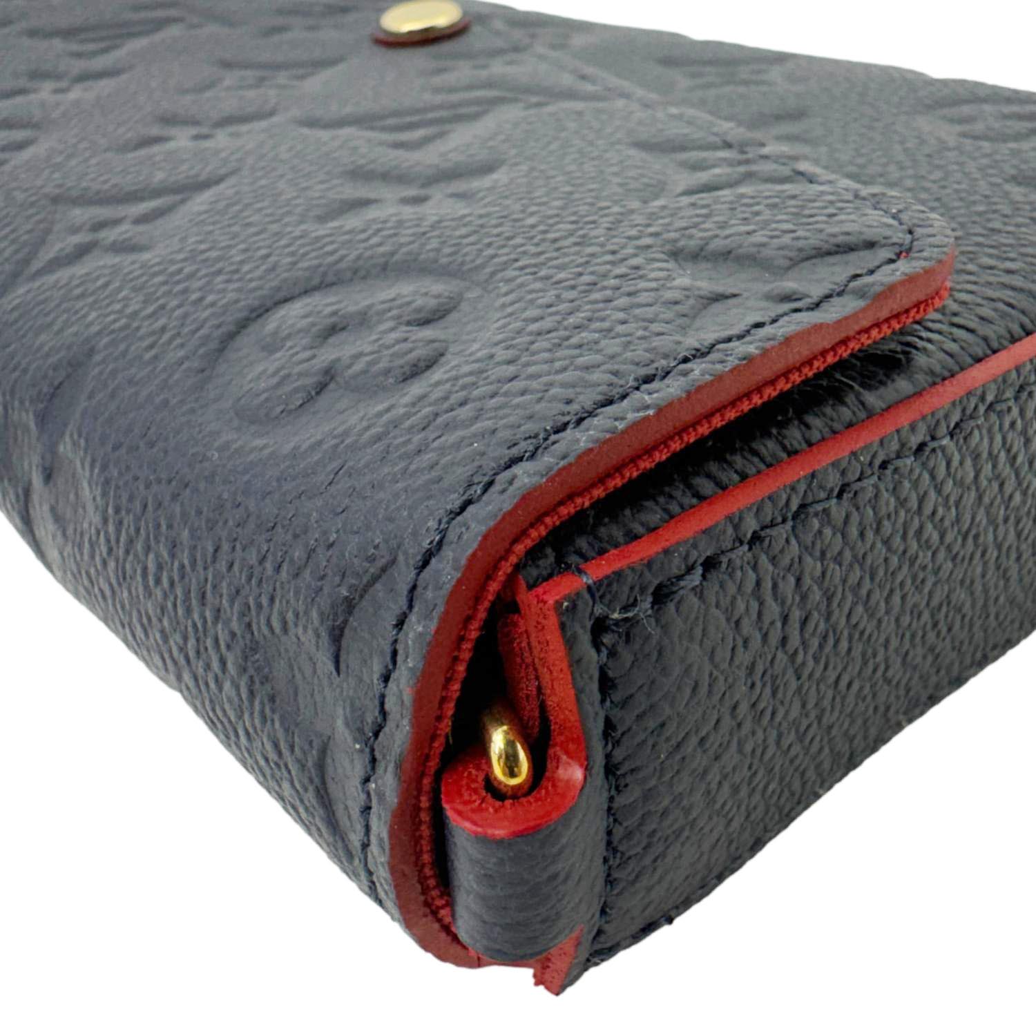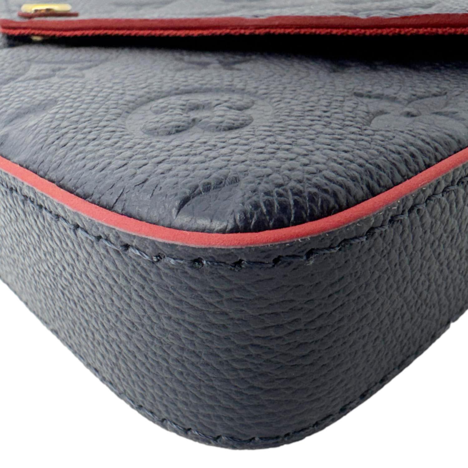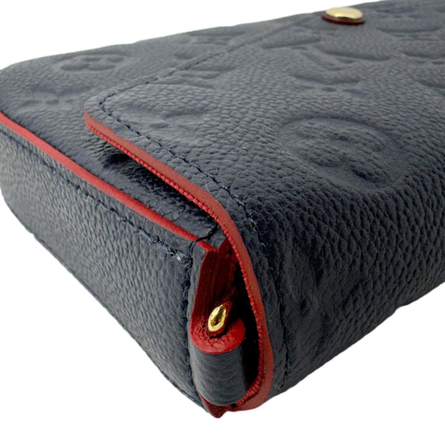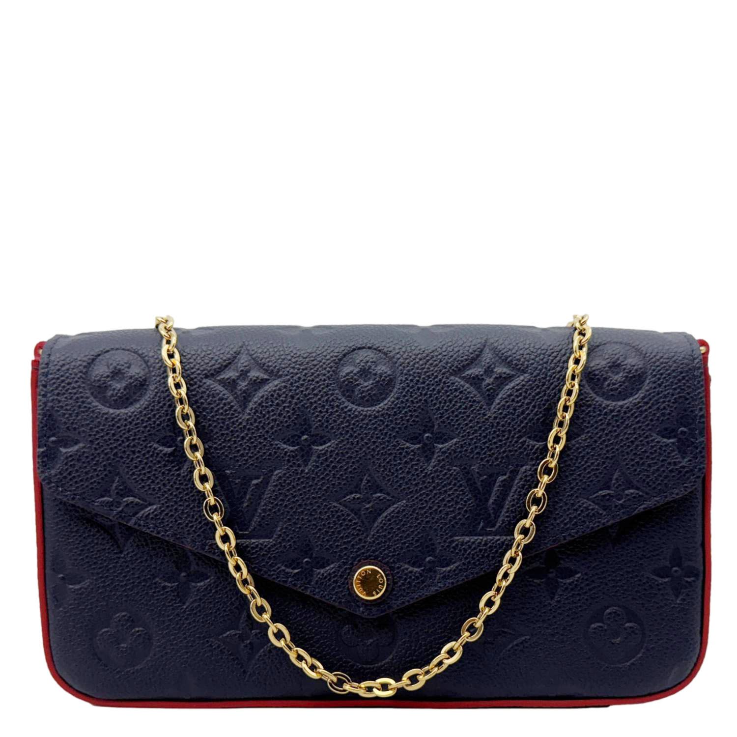 The LOUIS VUITTON Félicie Pochette in Navy Blue Monogram Empreinte Leather features a sleek envelope design with embossed monogram detailing. Versatile and elegant, it includes a removable chain strap for crossbody or clutch styling.