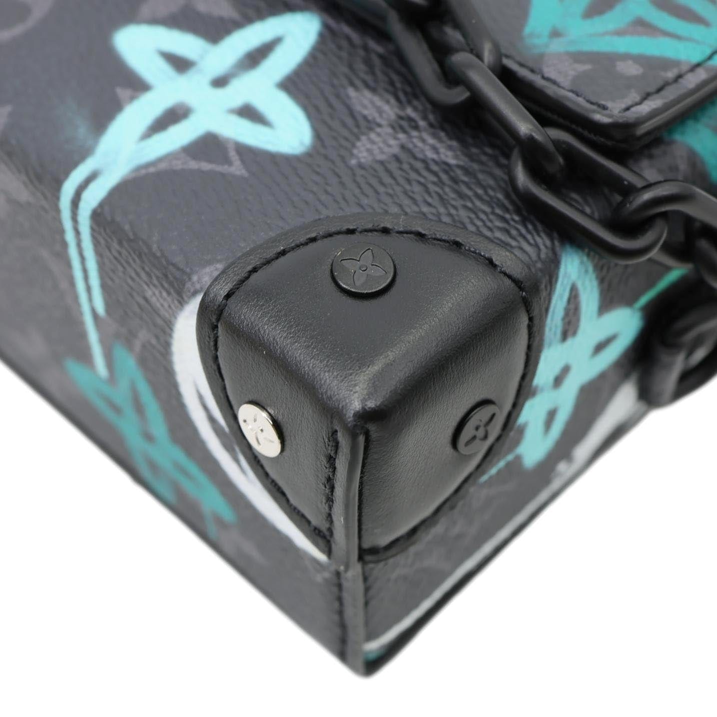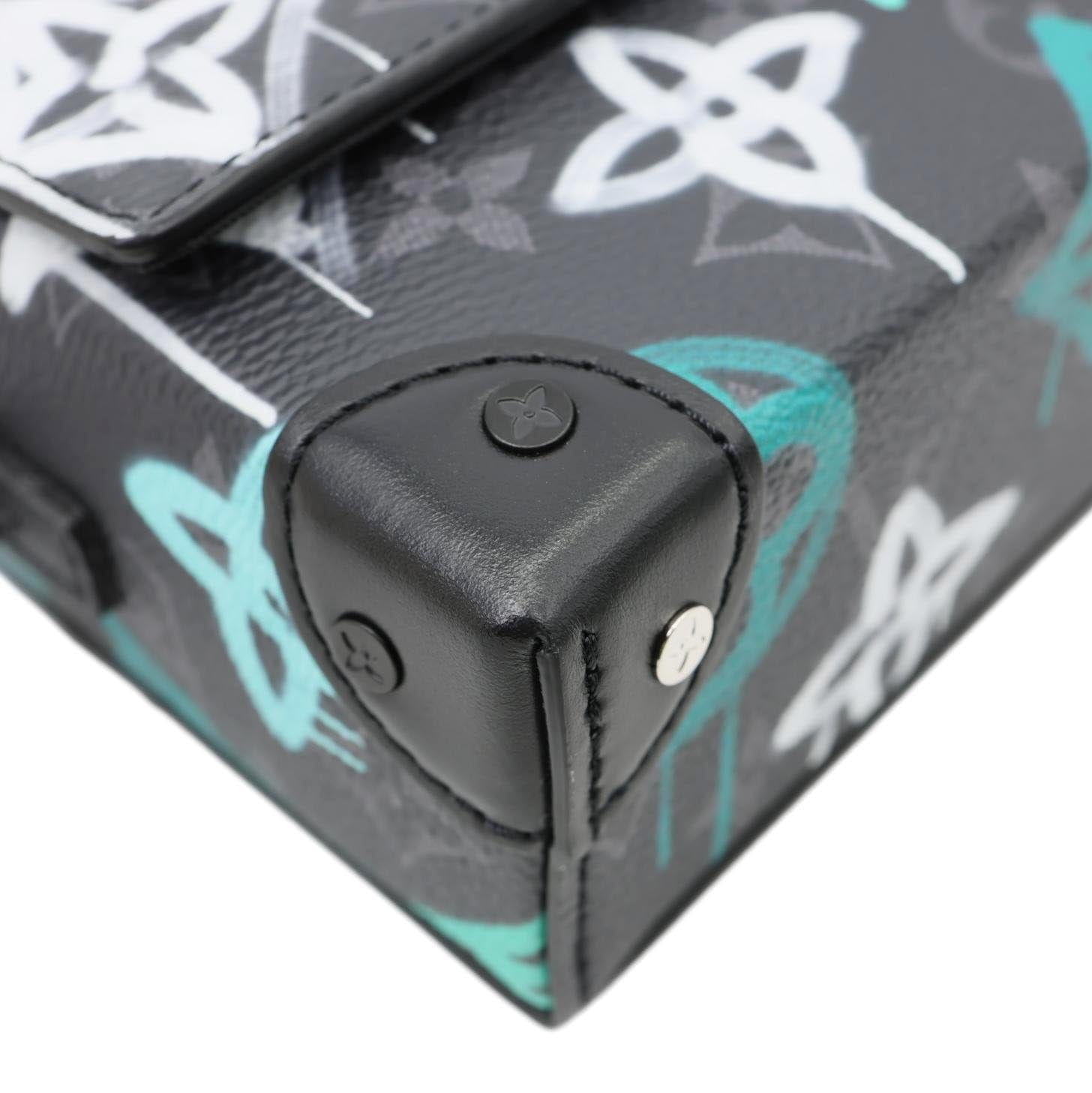 The Louis Vuitton Graffiti LV Steamer wallet in grey features Monogram Eclipse canvas and a graffiti-style print. This stylish crossbody wallet offers a front pocket and zippered compartment with matte black hardware.