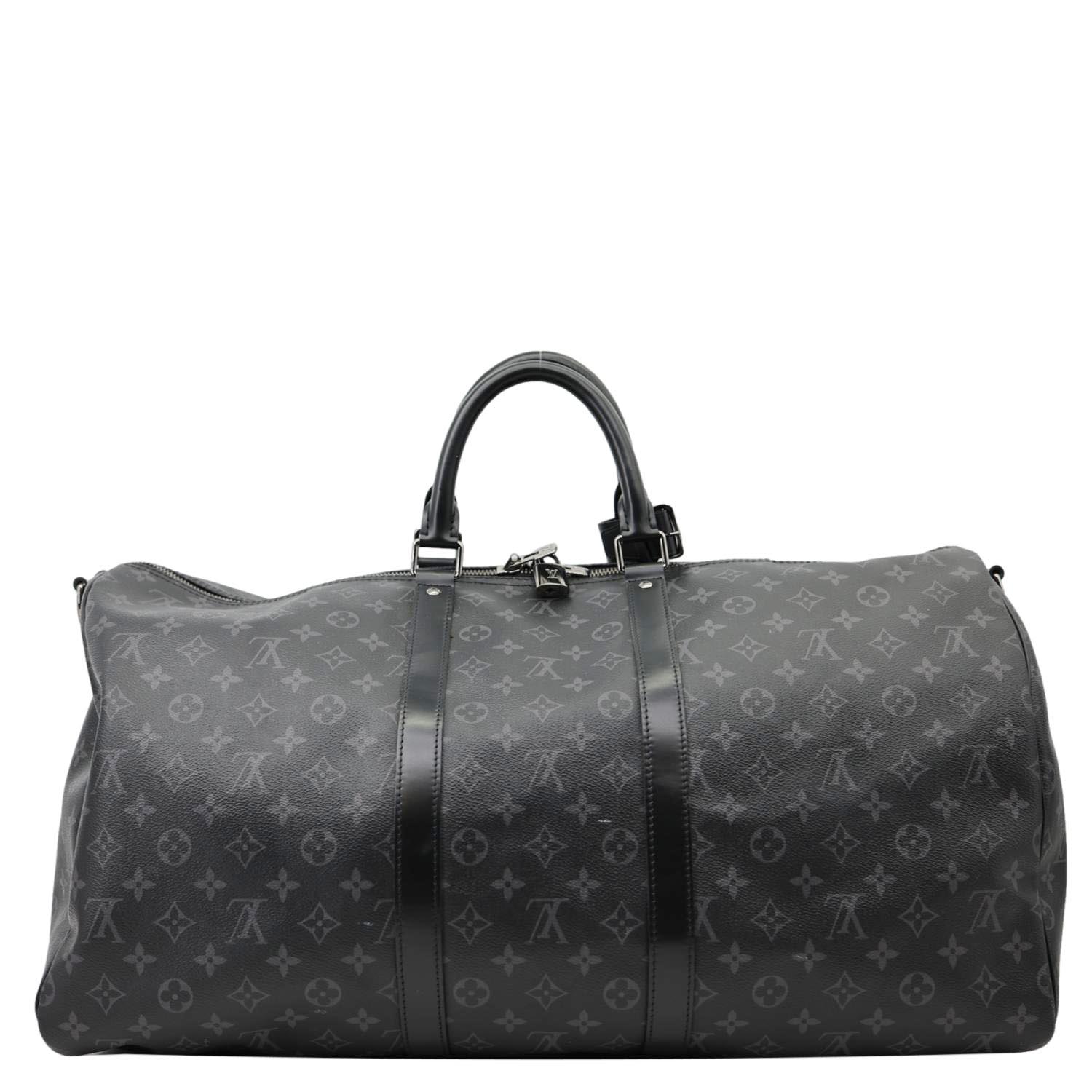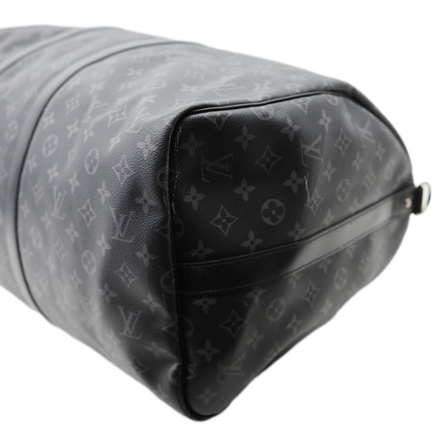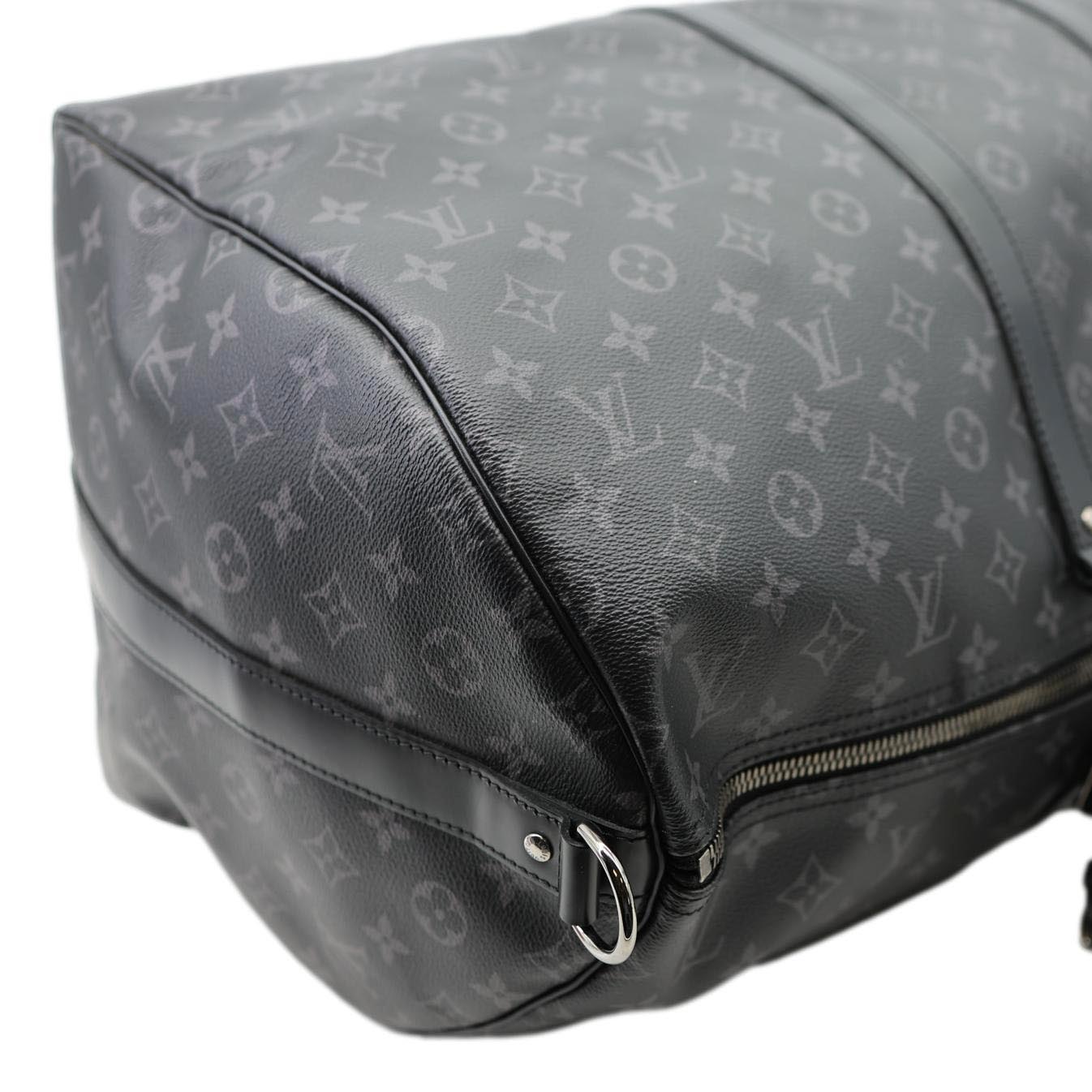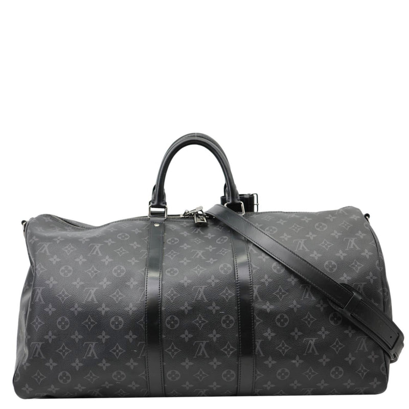 LOUIS VUITTON Keepall 55 Bandoulière Monogram Eclipse Travel Bag Black - A spacious and timeless travel bag crafted in Monogram Eclipse canvas. Features dual top handles, a removable shoulder strap, and a roomy interior perfect for short trips.