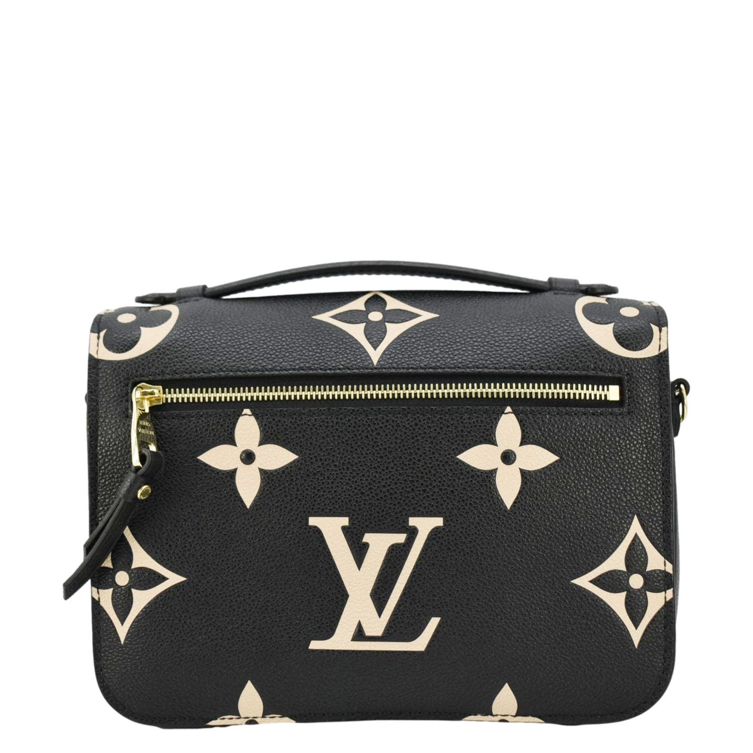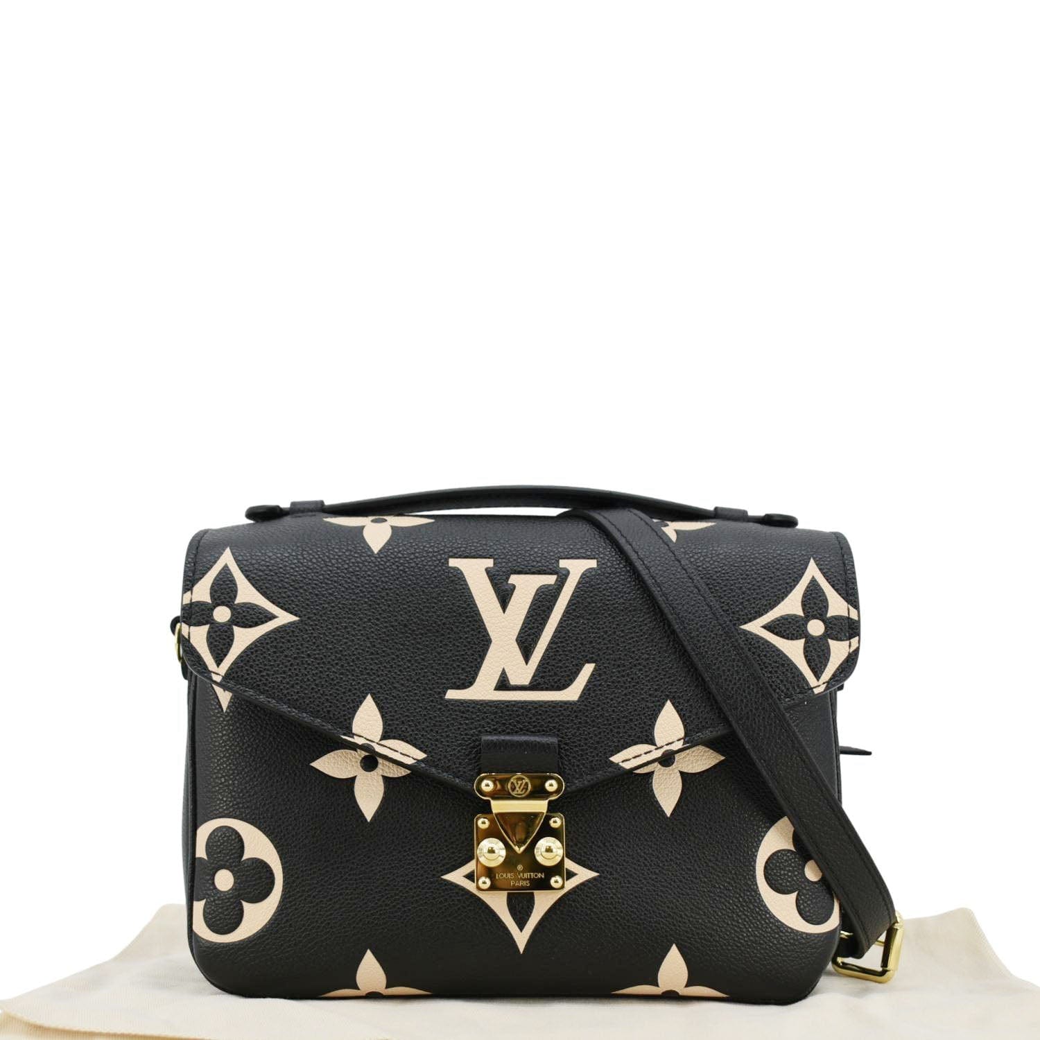 The LOUIS VUITTON Metis Pochette in Bicolor Empreinte Leather showcases a sophisticated blend of colors and the brand's signature embossed pattern. Its structured silhouette, detachable strap, and spacious interior make it a chic and versatile accessory for any occasion.