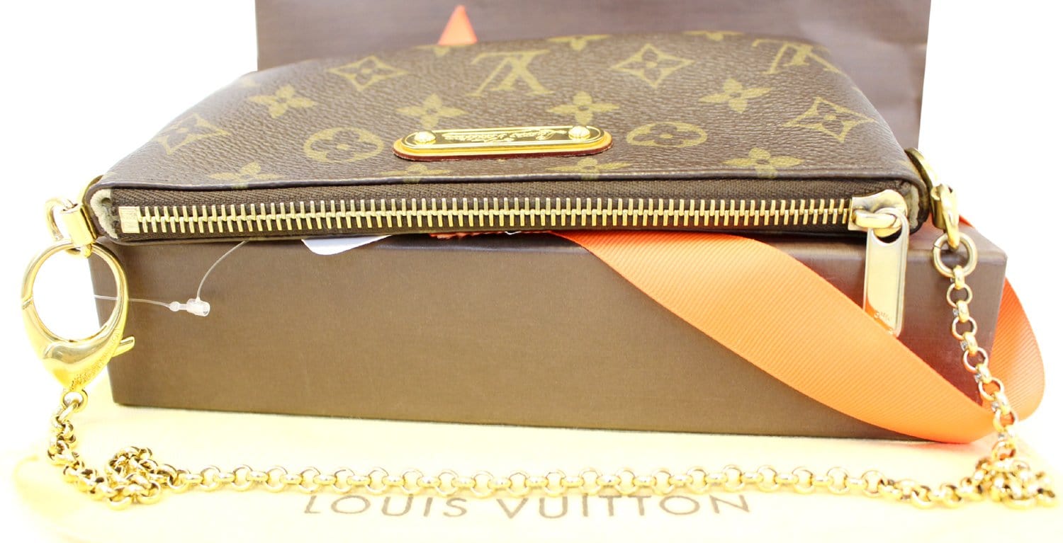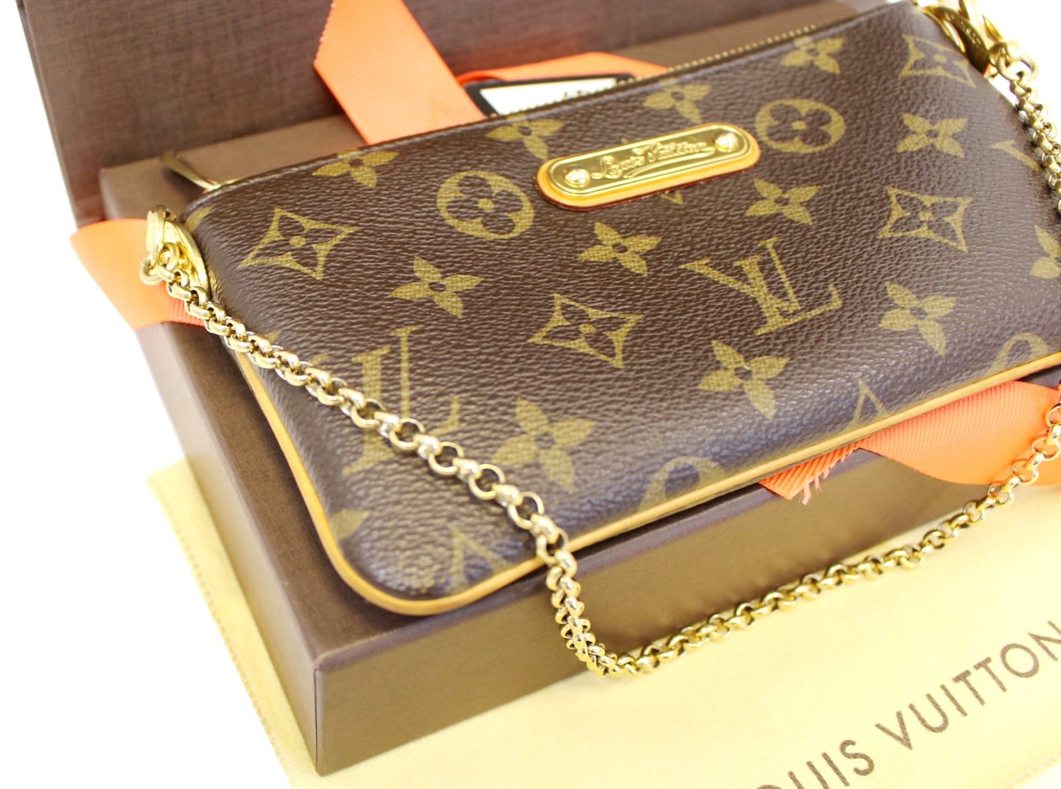 Louis Vuitton Monogram Canvas Milla Clutch MM Bag is ideal for holding your cosmetics and girly essentials in a fun and elegant manner. It features leather corner detailing and an elegant chain strap. The versatility of the chain handle makes this bag even better! It can be converted to a wrist strap as well. Whatever your mood is for the night, this bag is the perfect accessory.