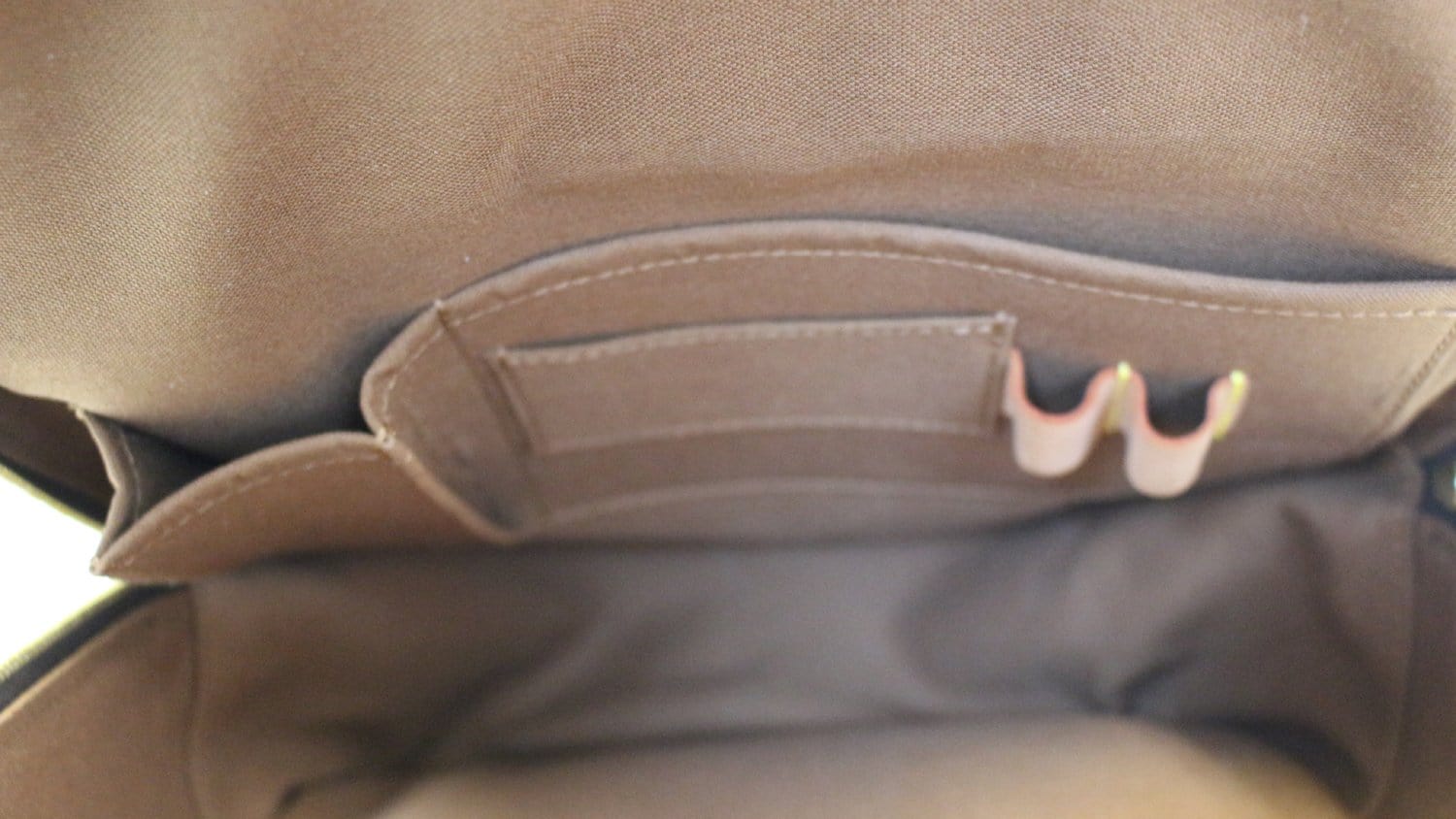 This stylish and sporty shoulder bag is finely crafted of classic Louis Vuitton monogram on toile canvas. The bag features a wide frontal pocket, vachetta cowhide leather trim and a sturdy top handle with an adjustable long nylon shoulder strap and polished brass hardware.