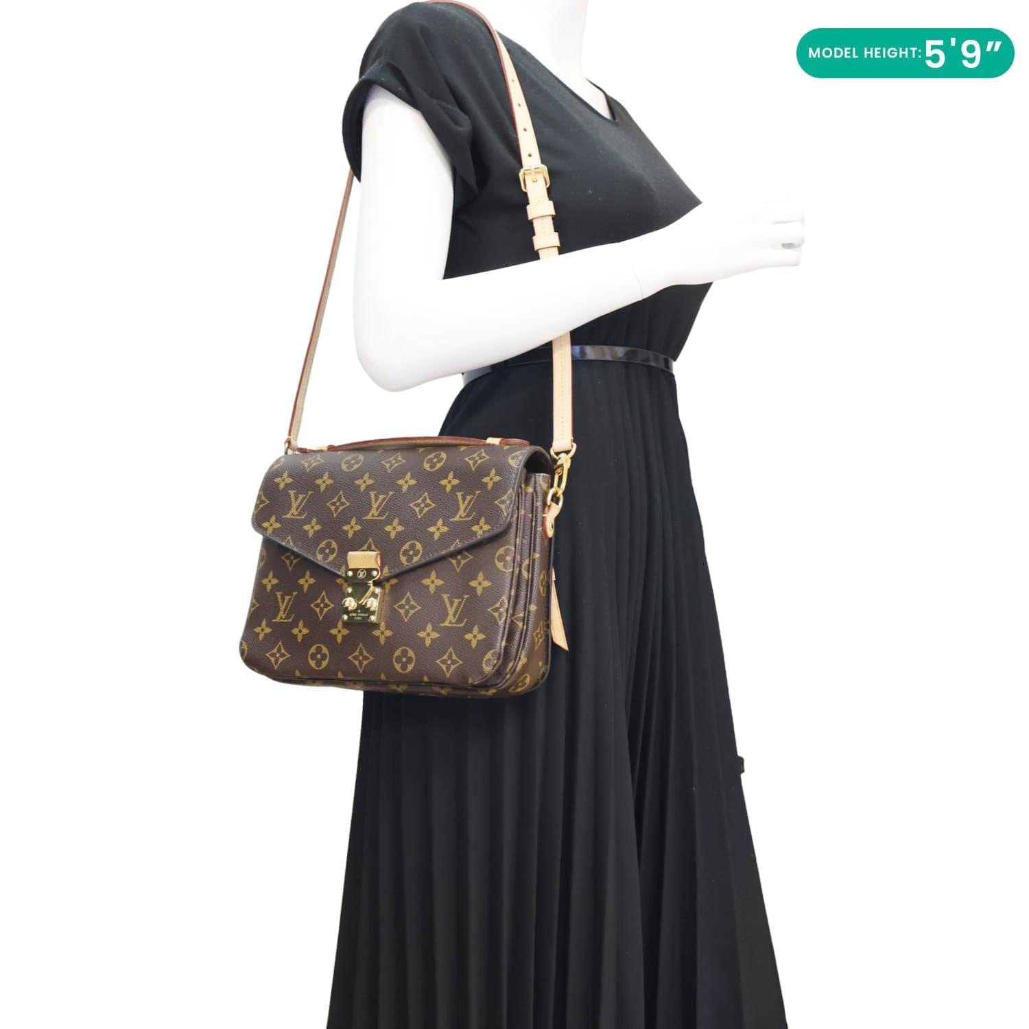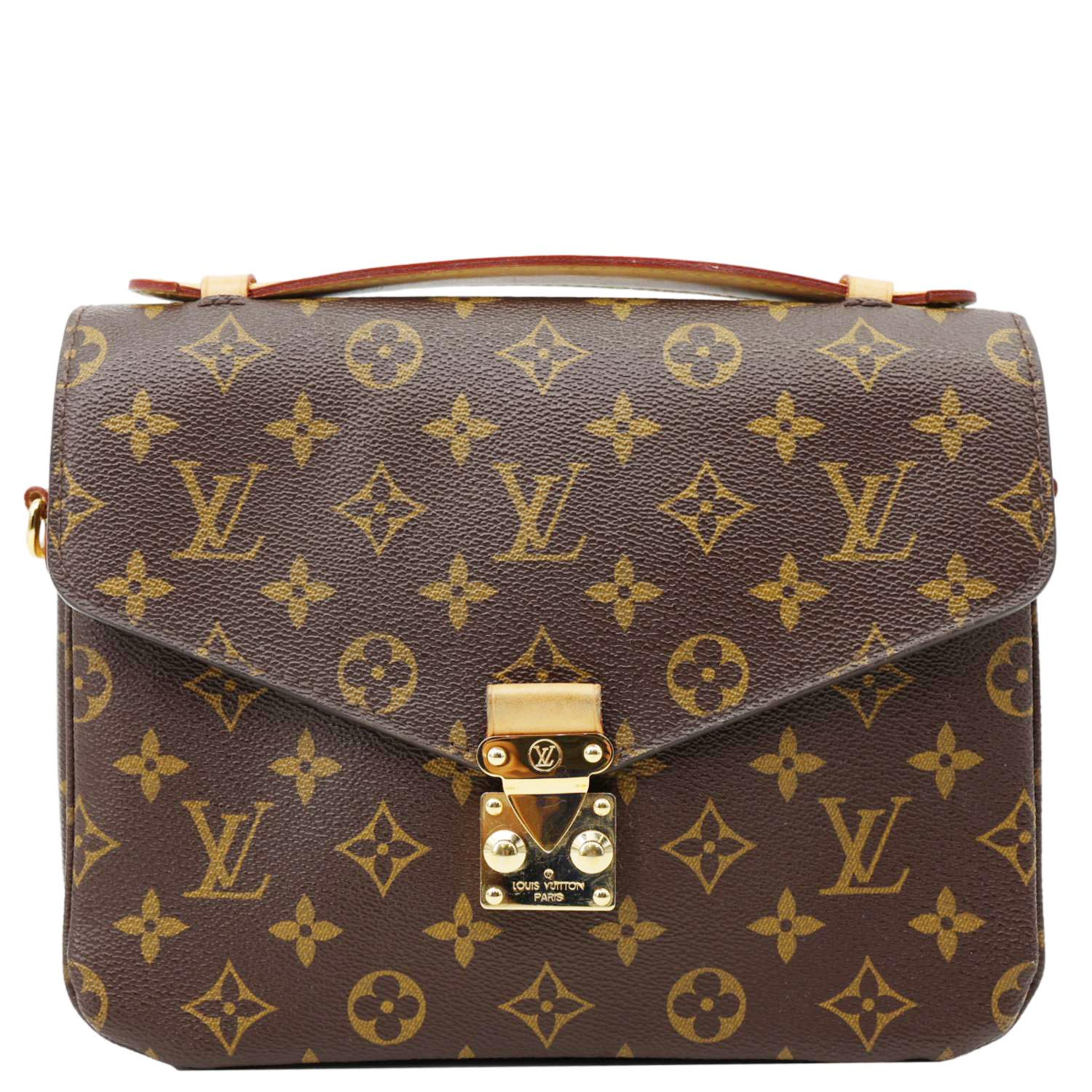 The Louis Vuitton Pochette Metis in Monogram canvas showcases a structured silhouette with the iconic S-lock closure and gold-tone hardware. Its top handle and adjustable crossbody strap make it a versatile and elegant daily companion.