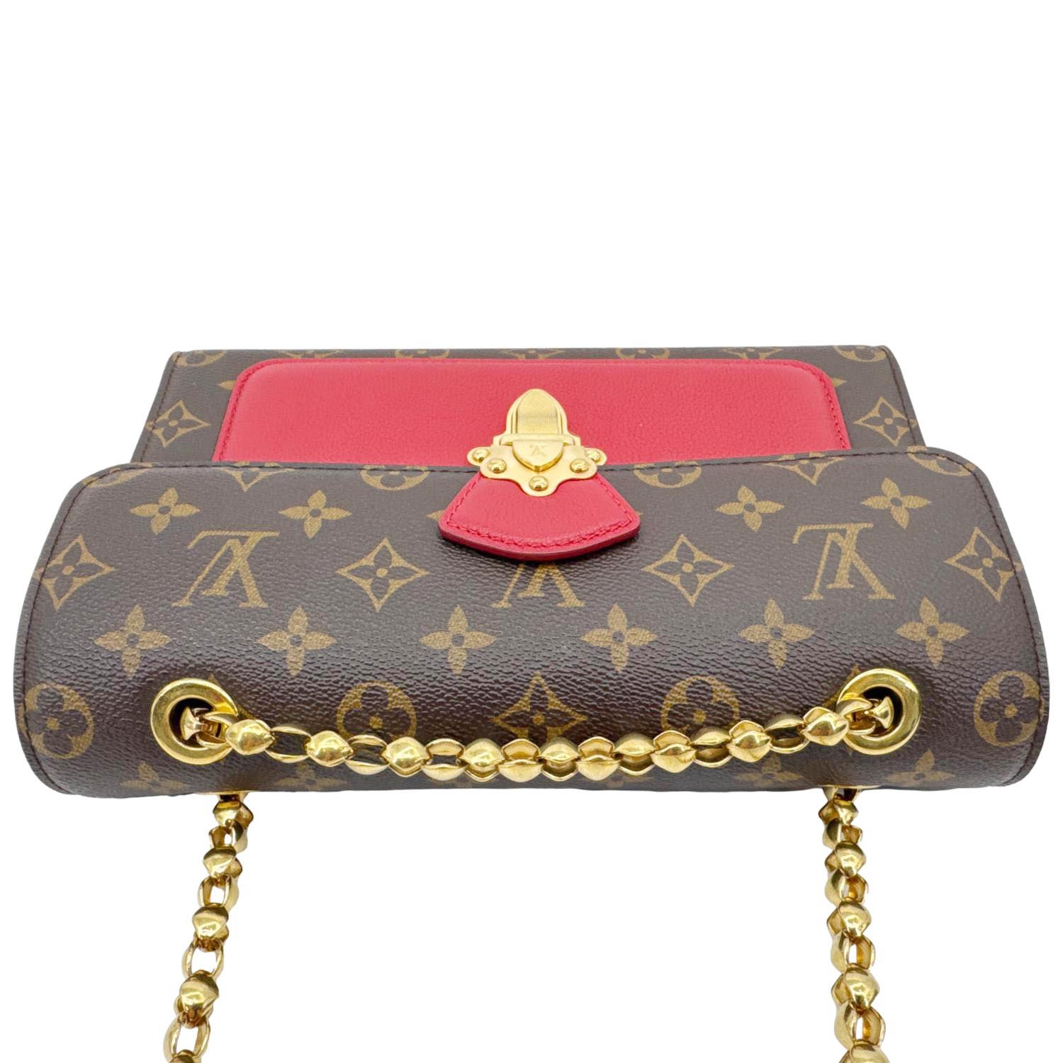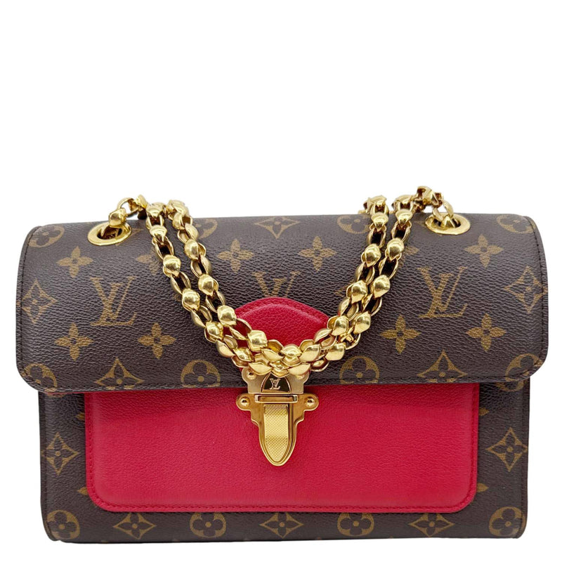 The Louis Vuitton Victoire Shoulder Bag blends iconic Monogram canvas with smooth cerise leather for a refined look. Finished with a gold-tone chain strap and clasp, it transitions effortlessly from day to evening. A chic crossbody option with timeless elegance.