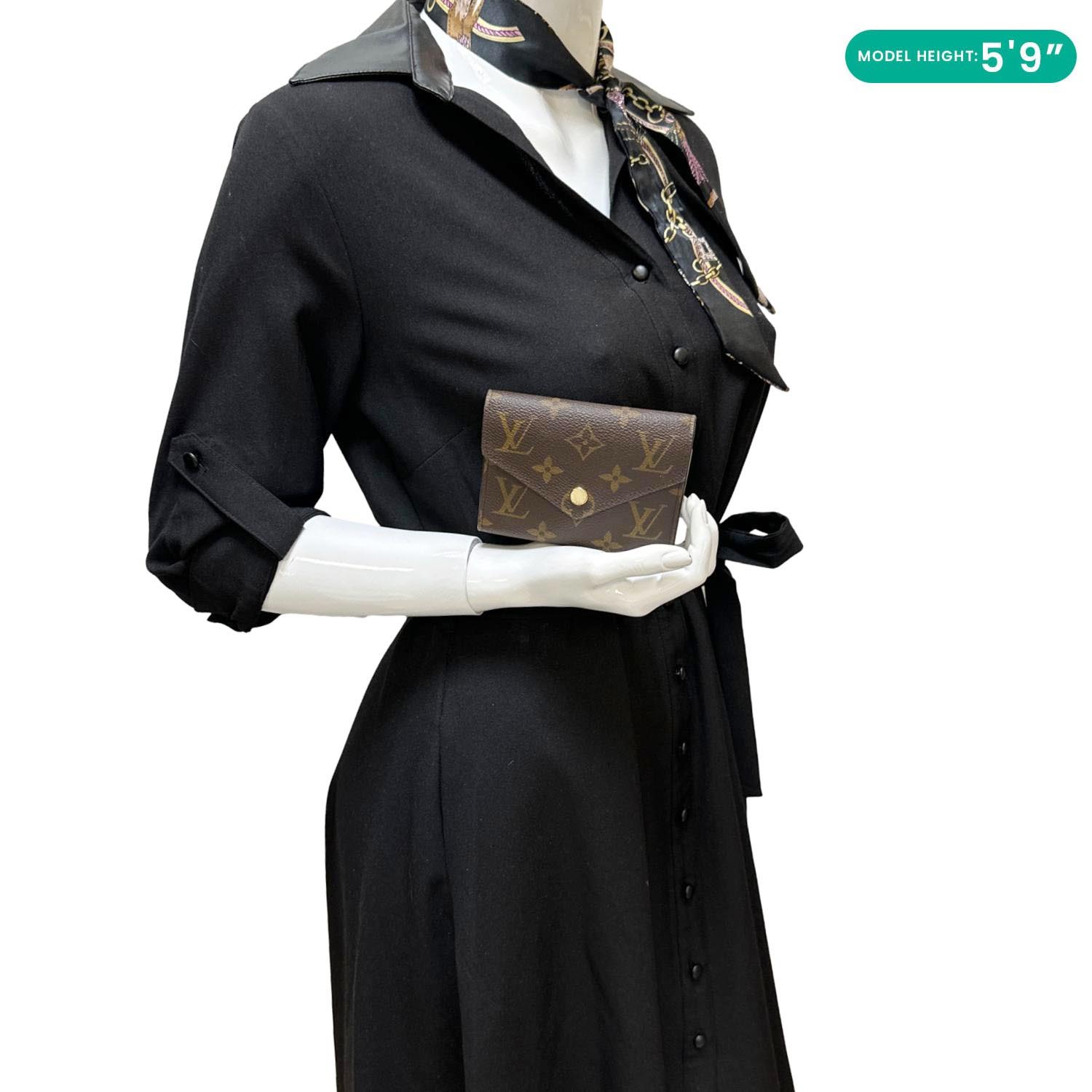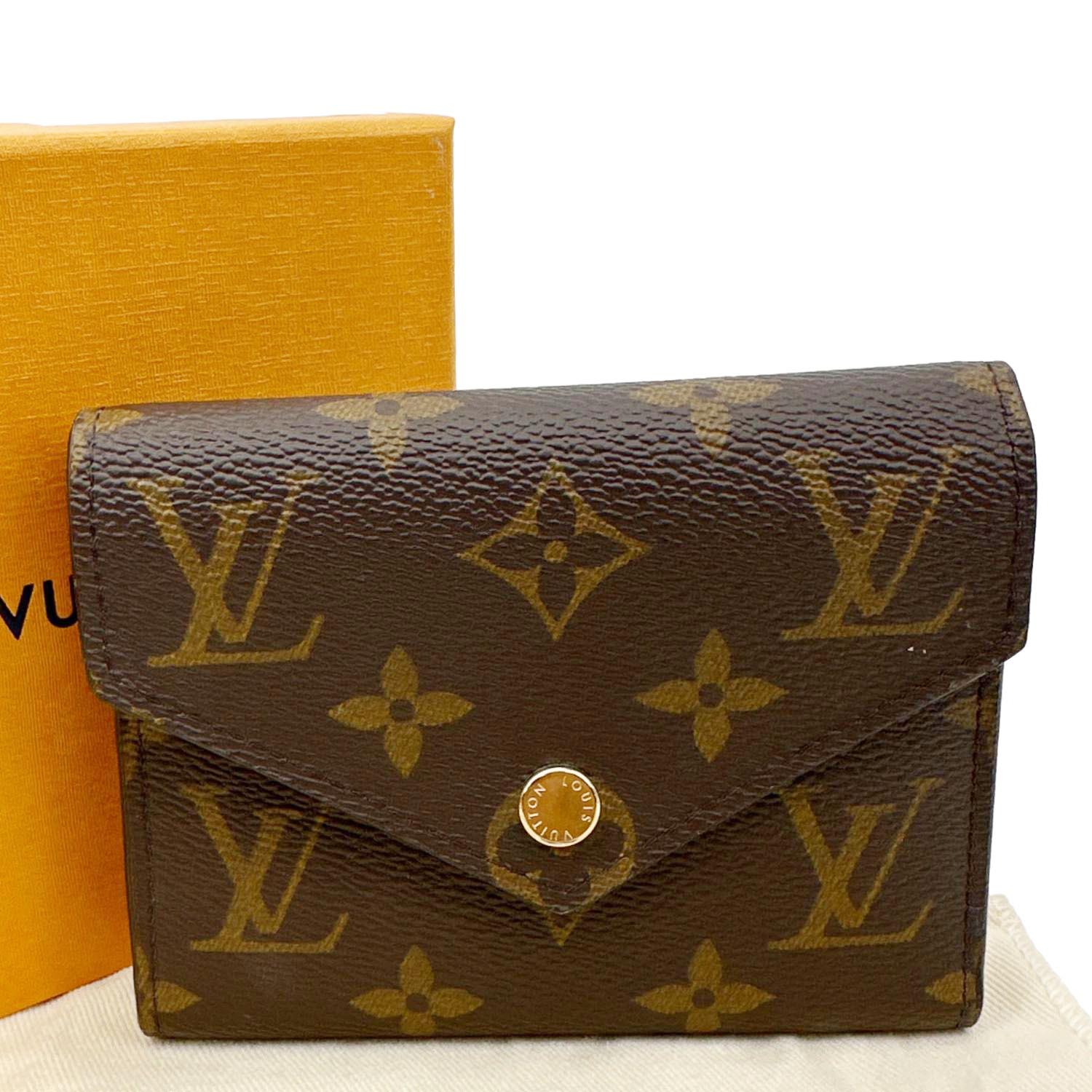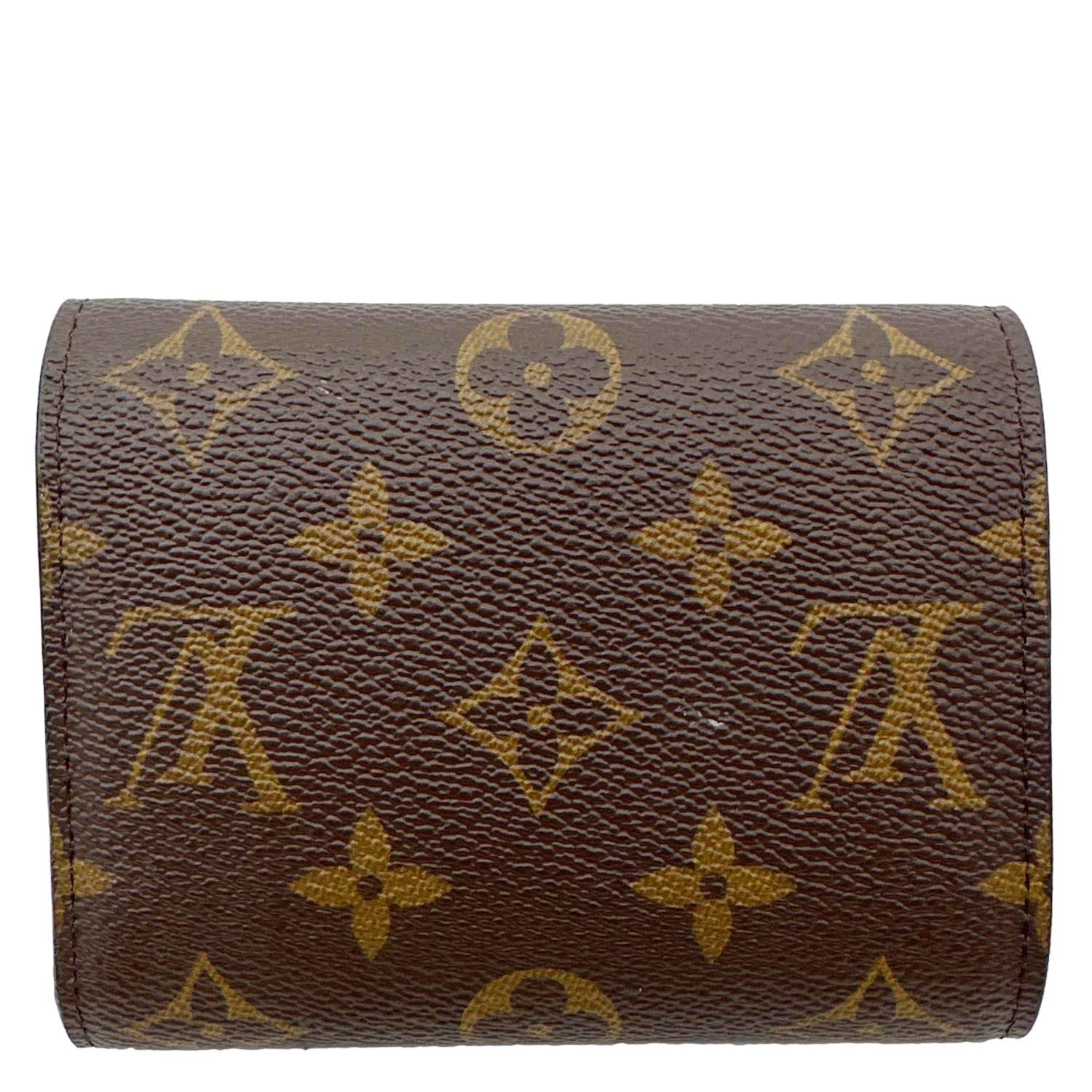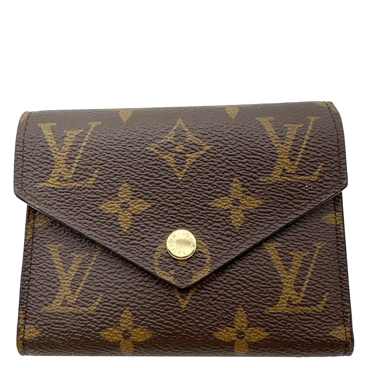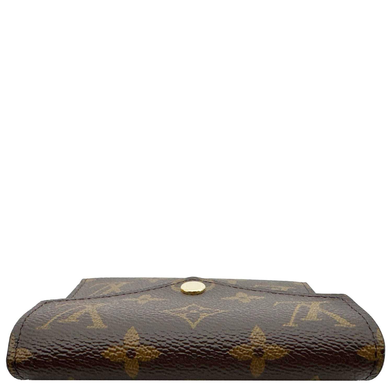 Compact brown Monogram canvas wallet featuring Louis Vuitton’s iconic print with a sleek envelope-style flap. Opens to a well-organized interior with multiple card slots, a bill compartment, and a secure coin pocket.