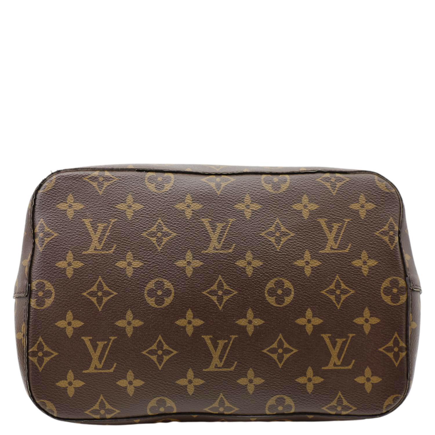 LOUIS VUITTON NeoNoe MM in Monogram canvas with pink accents. Designed with a drawstring closure, adjustable strap, and spacious bucket shape for everyday style.