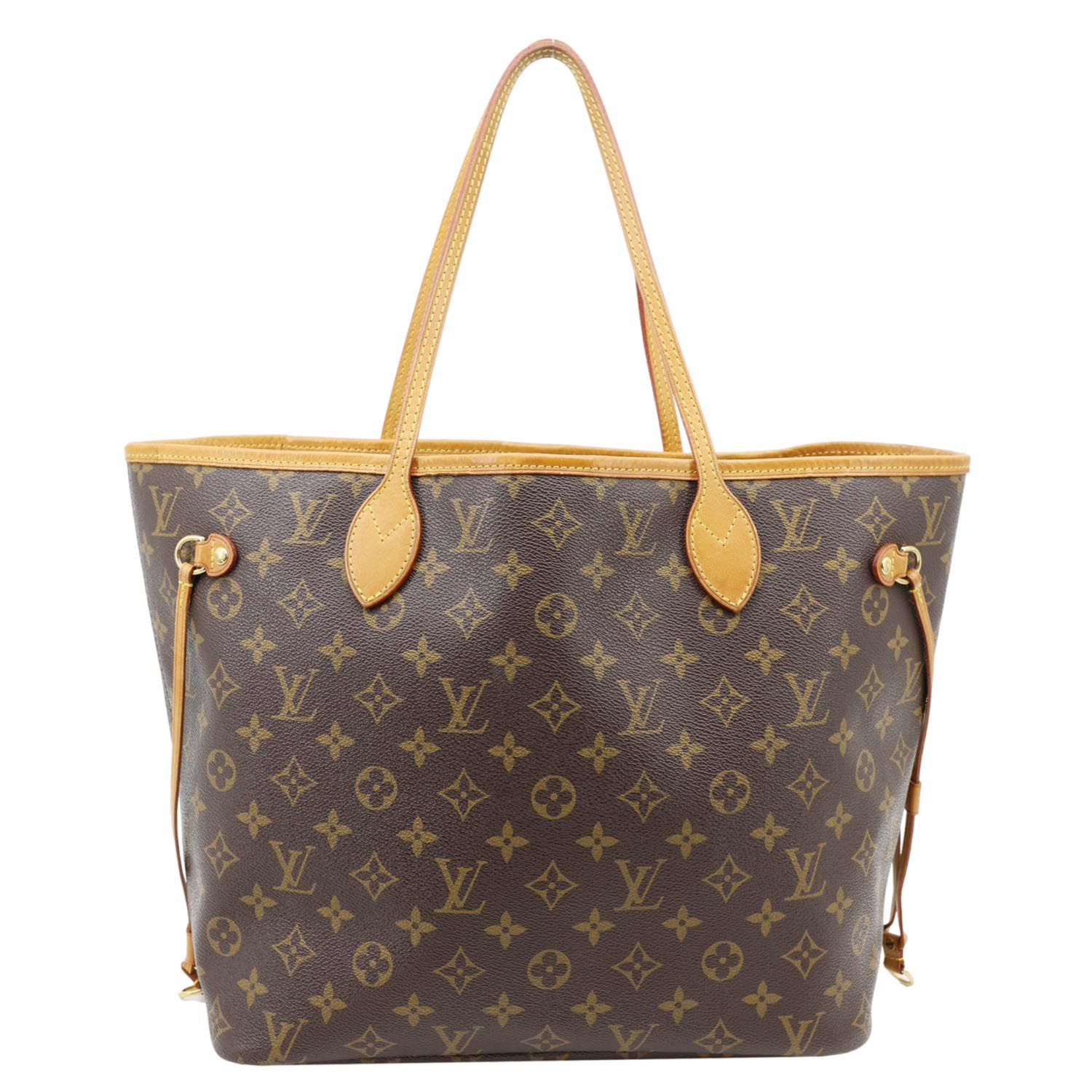 LOUIS VUITTON Neverfull MM Tote Bag in classic Monogram canvas with natural cowhide trim. Spacious yet sleek, featuring a striped textile-lined interior and side laces to adjust capacity. Perfect for everyday use, finished with slim handles and gold-tone hardware.