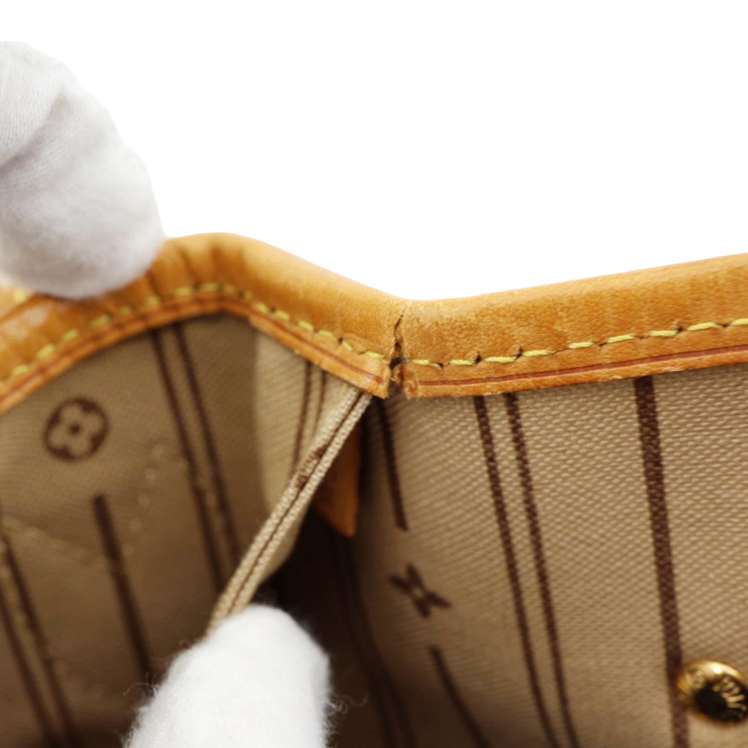 Good - The Item shows signs of use, including rubbed corners, and has some stain marks on the interior and visible cuts on the edges and top leather trim. Its gold color hardware has light scratches and discoloration. There is no unpleasant smell within the item.