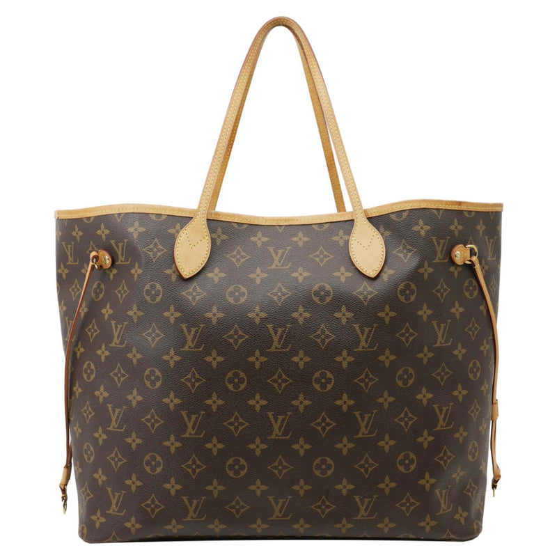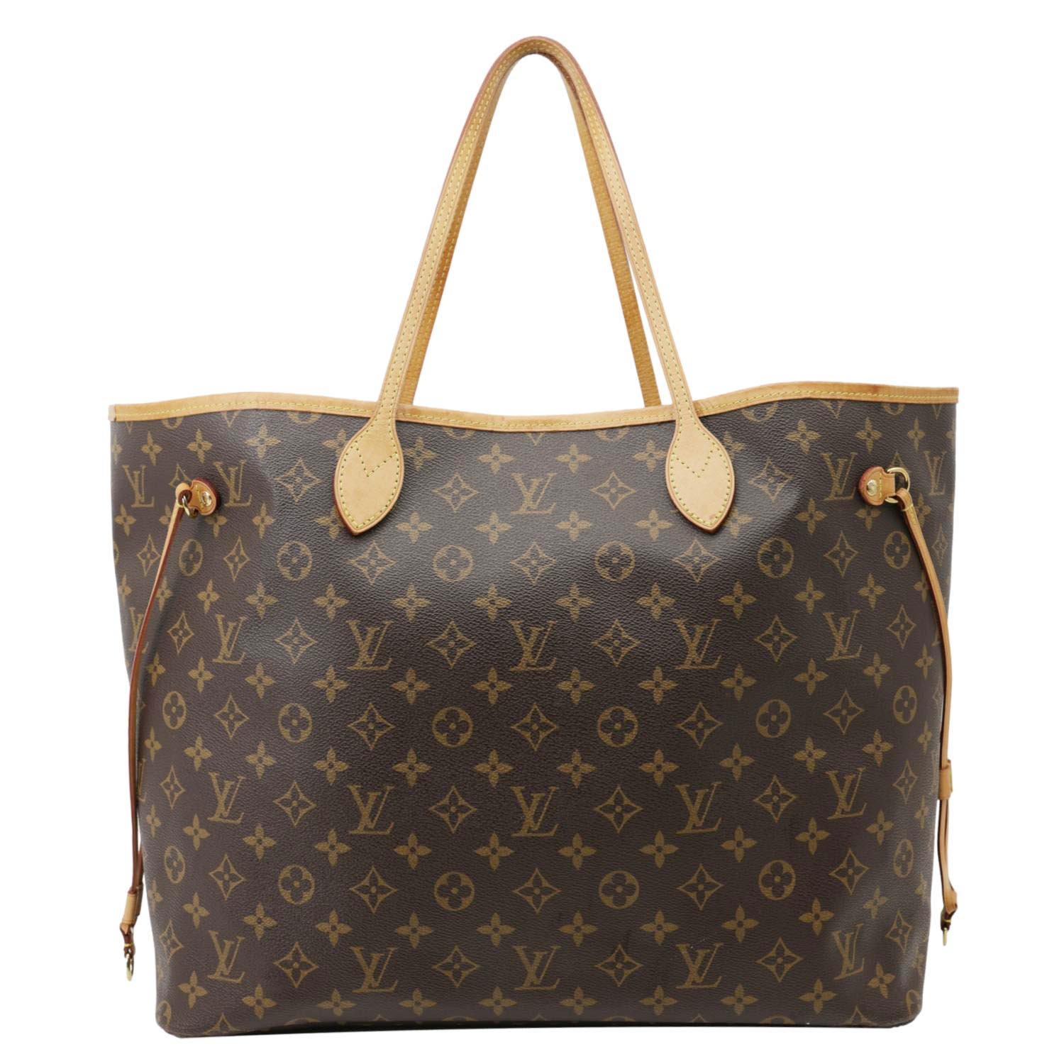 The LOUIS VUITTON Neverfull GM Monogram Canvas Tote Bag in brown features a timeless design with heritage details, made from supple Monogram canvas with natural cowhide trim. This ultra-roomy tote offers a removable pouch, colorful textile lining, and comfortable handles, perfect for everyday use or travel.