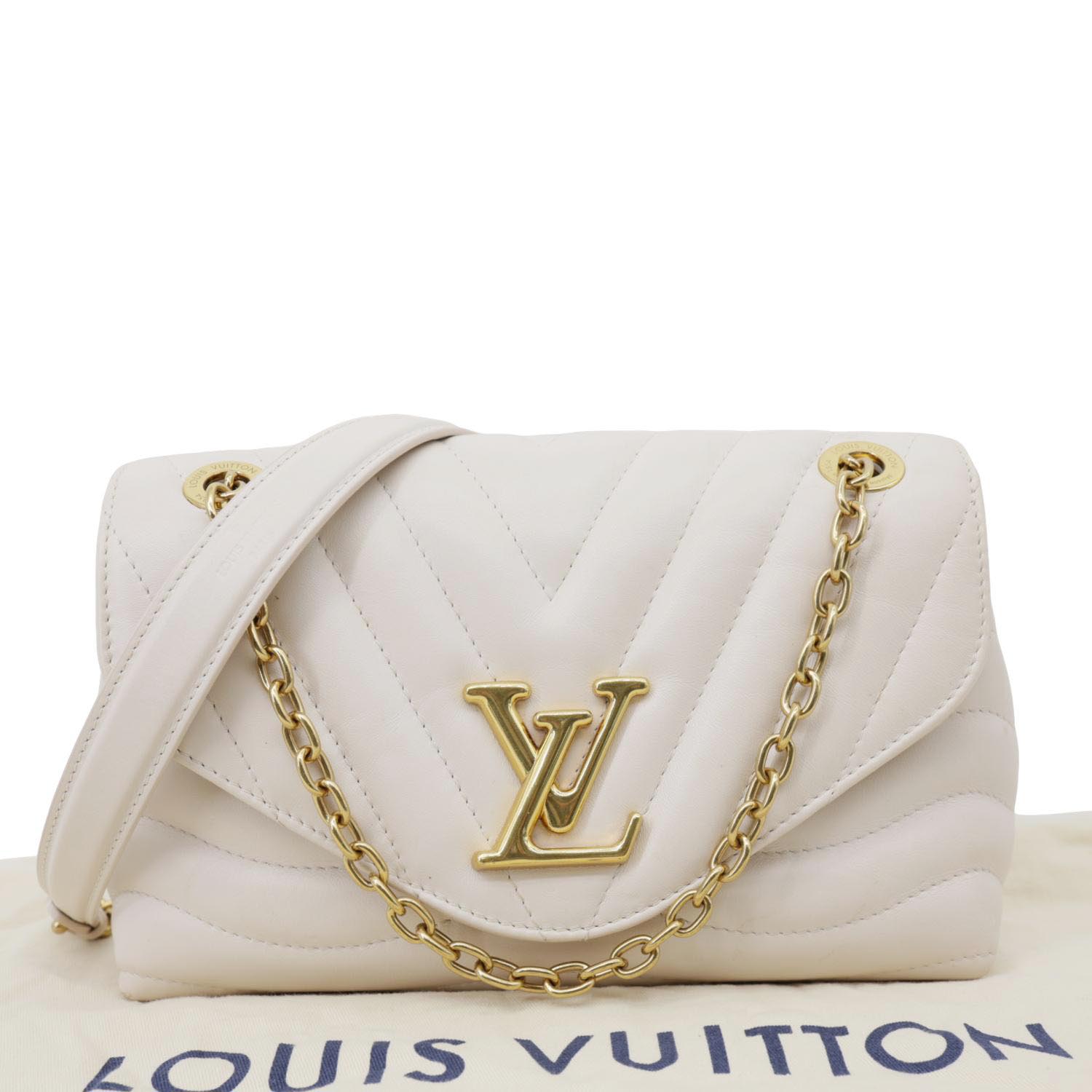 Make a statement with the LOUIS VUITTON New Wave Chain MM Calfskin Leather Shoulder Bag in off white, featuring sleek calfskin leather and bold chain-link accents. This stylish bag offers a modern, edgy twist on classic LV design with ample space and sophistication.