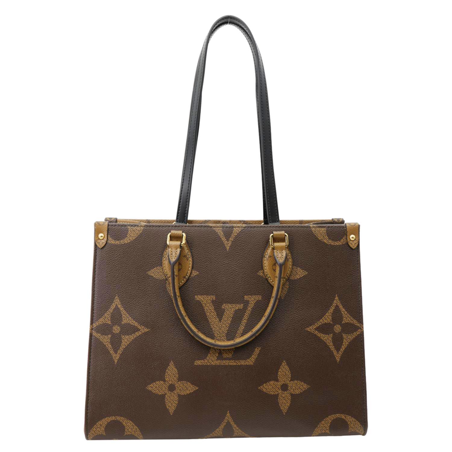 The Onthego MM tote bag from LOUIS VUITTON boasts a striking Giant Monogram Reverse Canvas design in brown, showcasing bold style and functionality. This spacious bag is perfect for daily use, effortlessly accommodating essentials with chic sophistication.