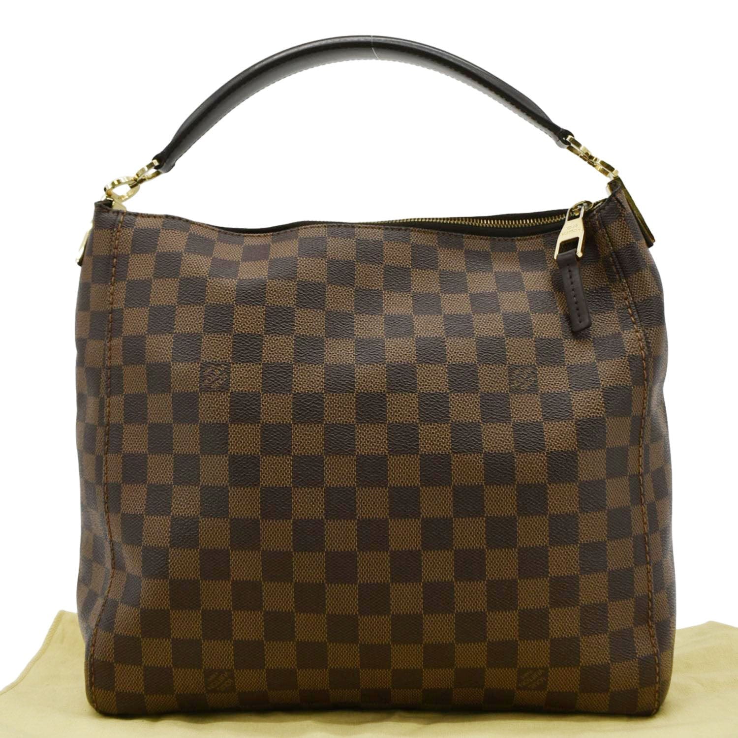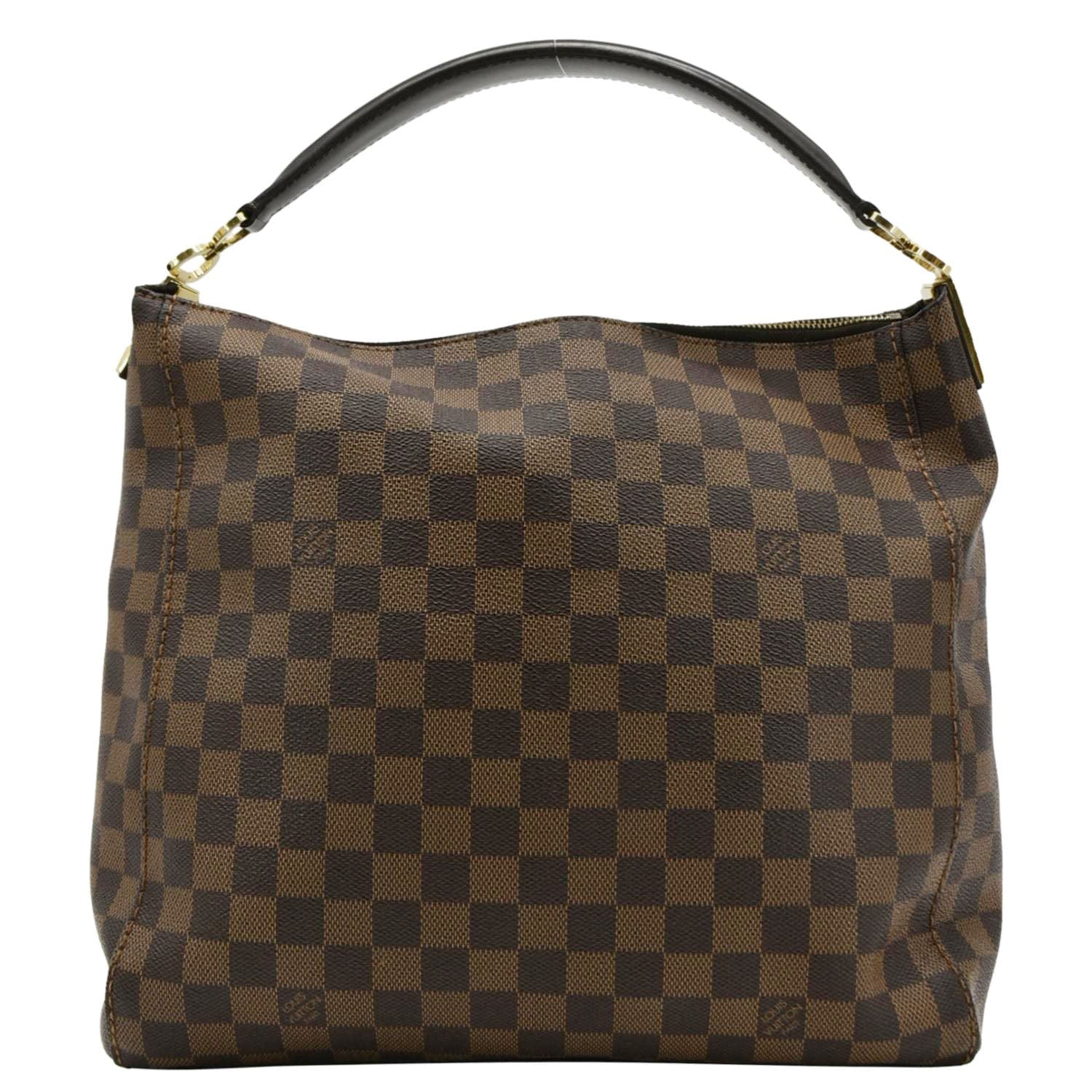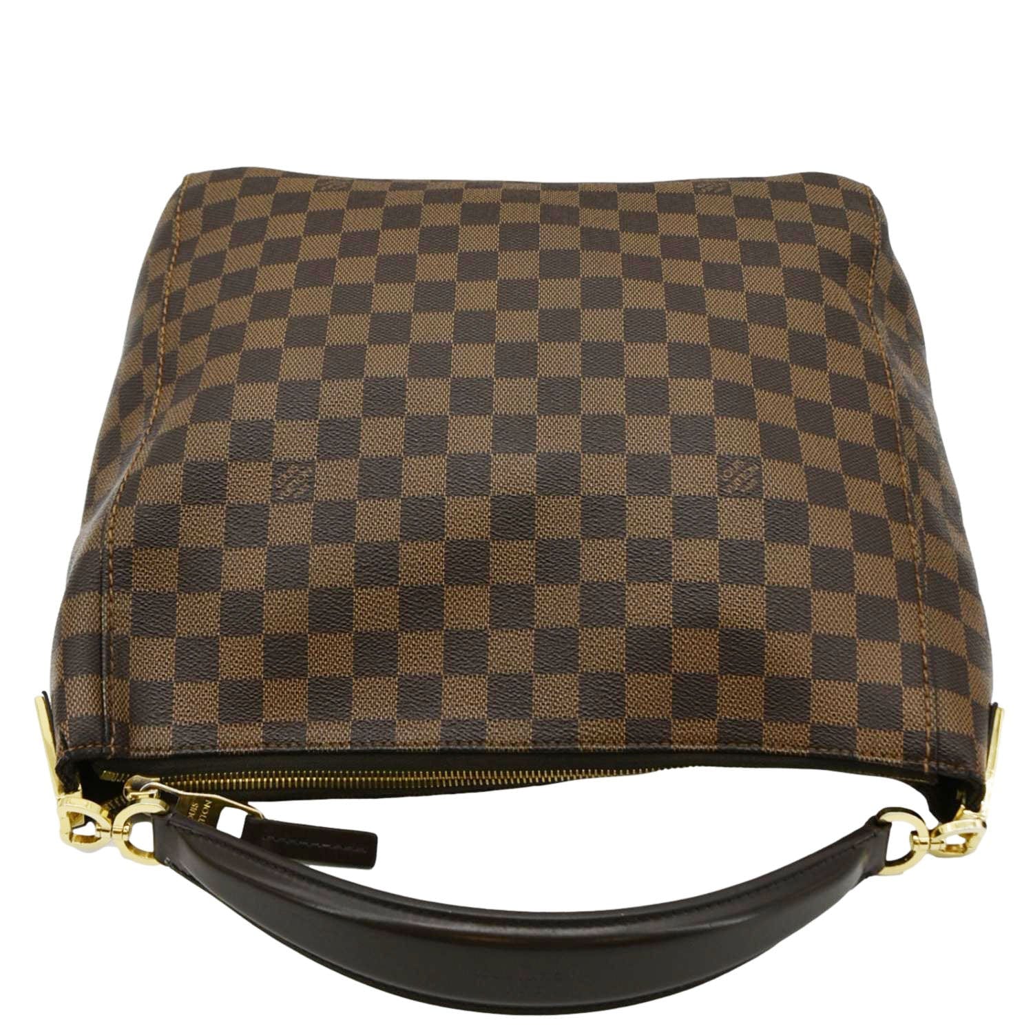 The LOUIS VUITTON Portobello PM Damier Ebene Shoulder Bag in Brown features the signature Damier Ebene canvas. This elegant shoulder bag is perfect for everyday use with its spacious interior and timeless design.