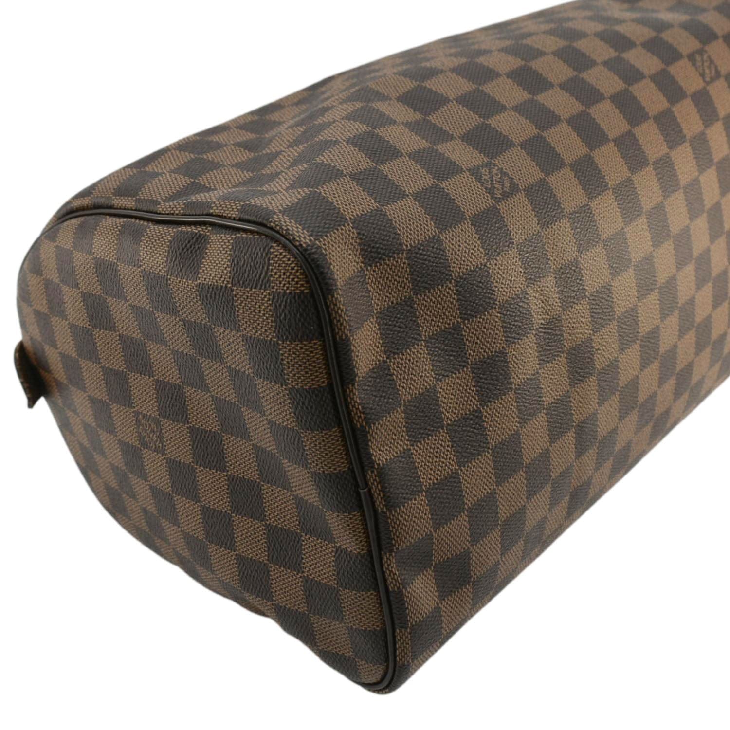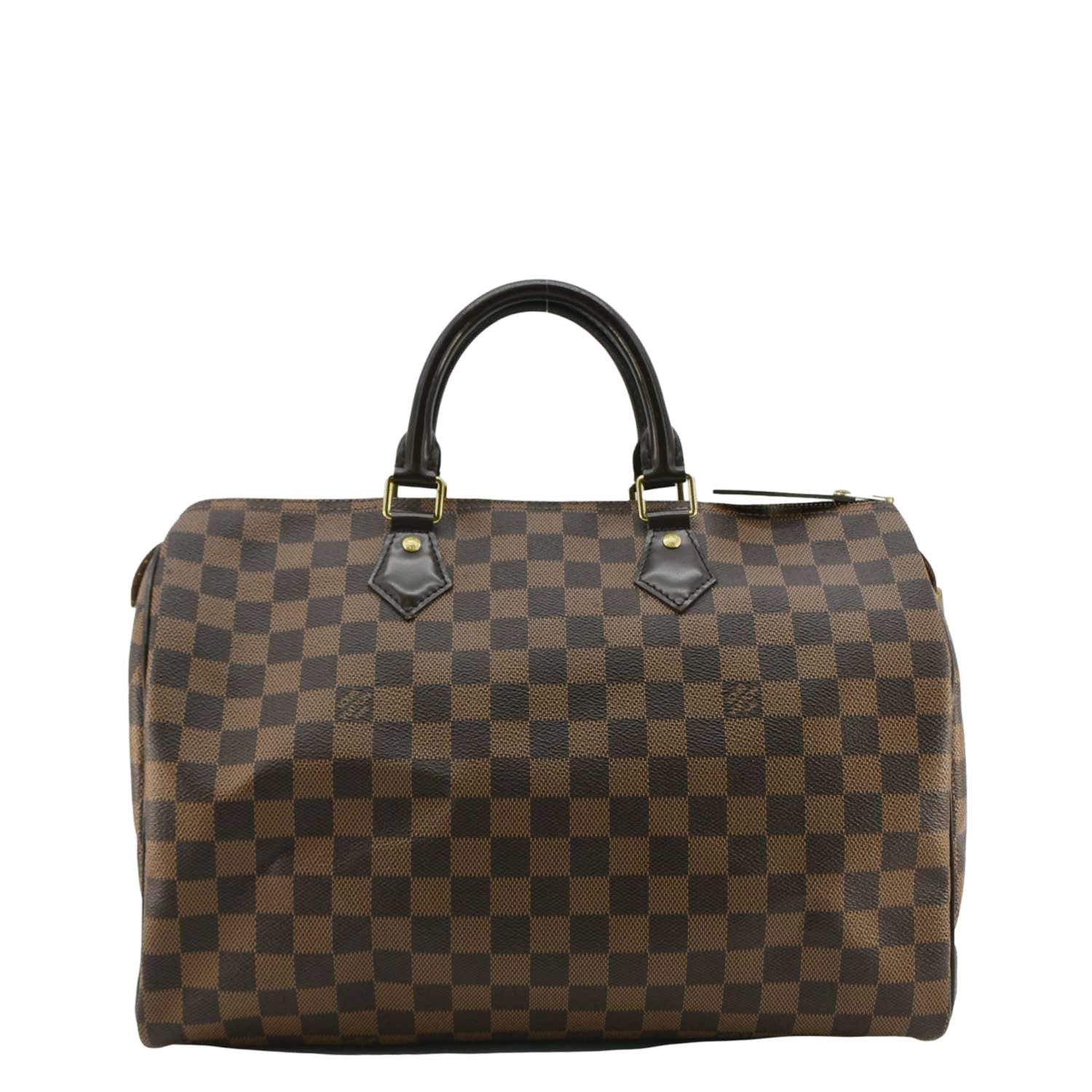 The Louis Vuitton Speedy 35 in Damier Ebene is a spacious satchel bag with the brand's signature brown checkered canvas. Featuring dual top handles, a secure zip closure, and classic design, it's perfect for both daily use and travel.