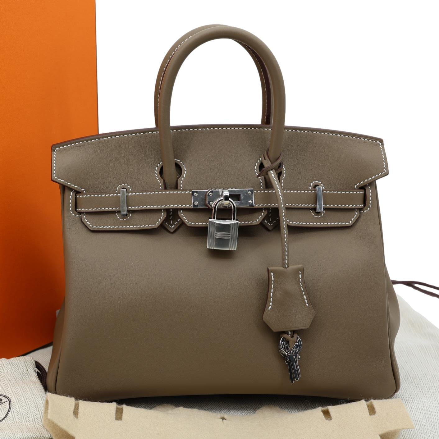 The Hermès Birkin 25 in Etoupe Swift leather embodies timeless elegance with its soft, smooth finish. Compact yet iconic, it’s a perfect blend of sophistication and everyday luxury.