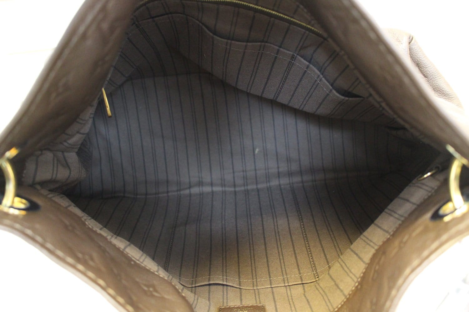 Louis Vuitton Terre Monogram Empreinte Leather Artsy MM Bag has a unique and modern structure. This roomy tote makes a perfect work or weekend bag, large enough to hold all your essentials in style. It features a detachable stylish Louis Vuitton key ring for exterior or interior use, and enough interior pockets to keep you organized on the go. Made from the highest quality calfskin leather, this embossed leather is supple and durable.