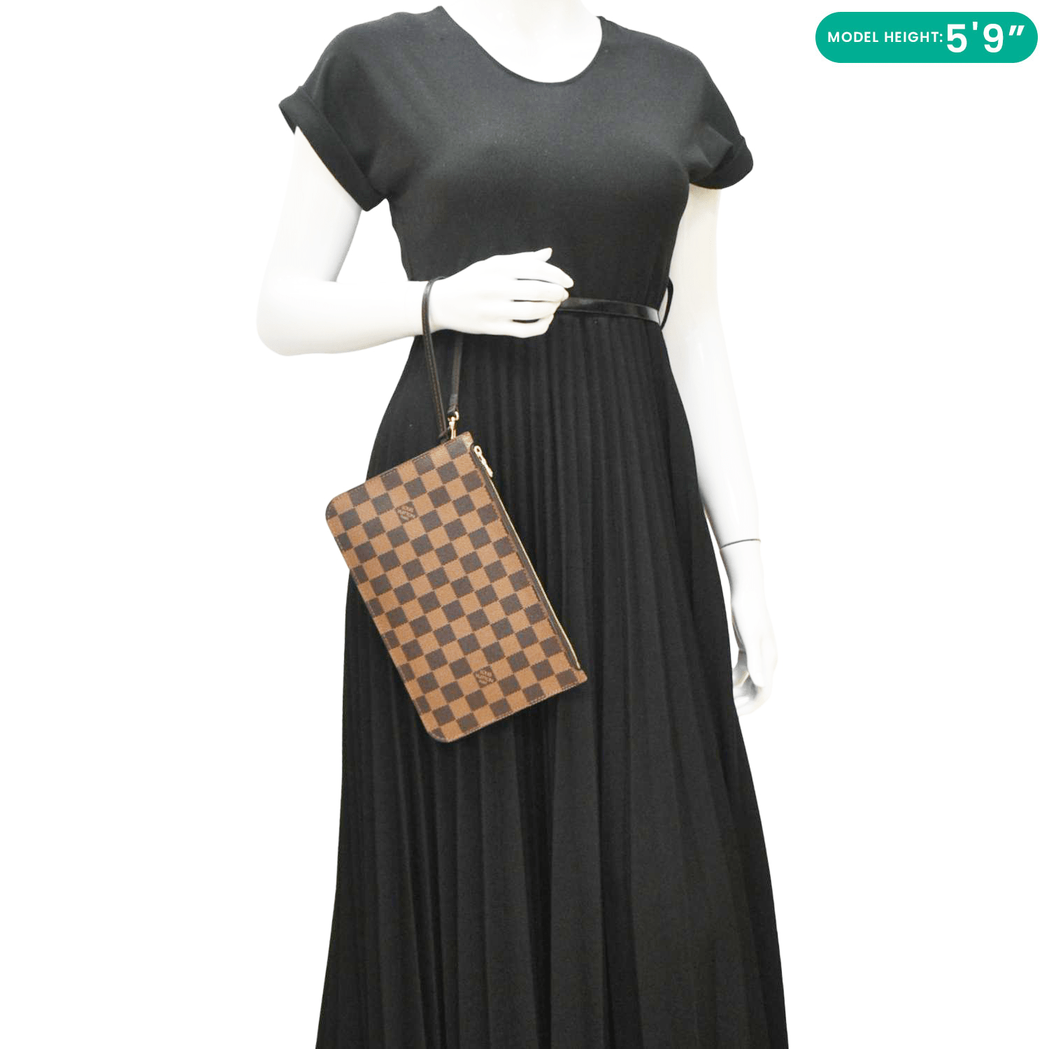 The Louis Vuitton Neverfull Damier Ebene Pochette Wristlet Pouch in Brown features the iconic Damier Ebene canvas with natural cowhide trim. Its compact design offers versatile use as a clutch or organizer.