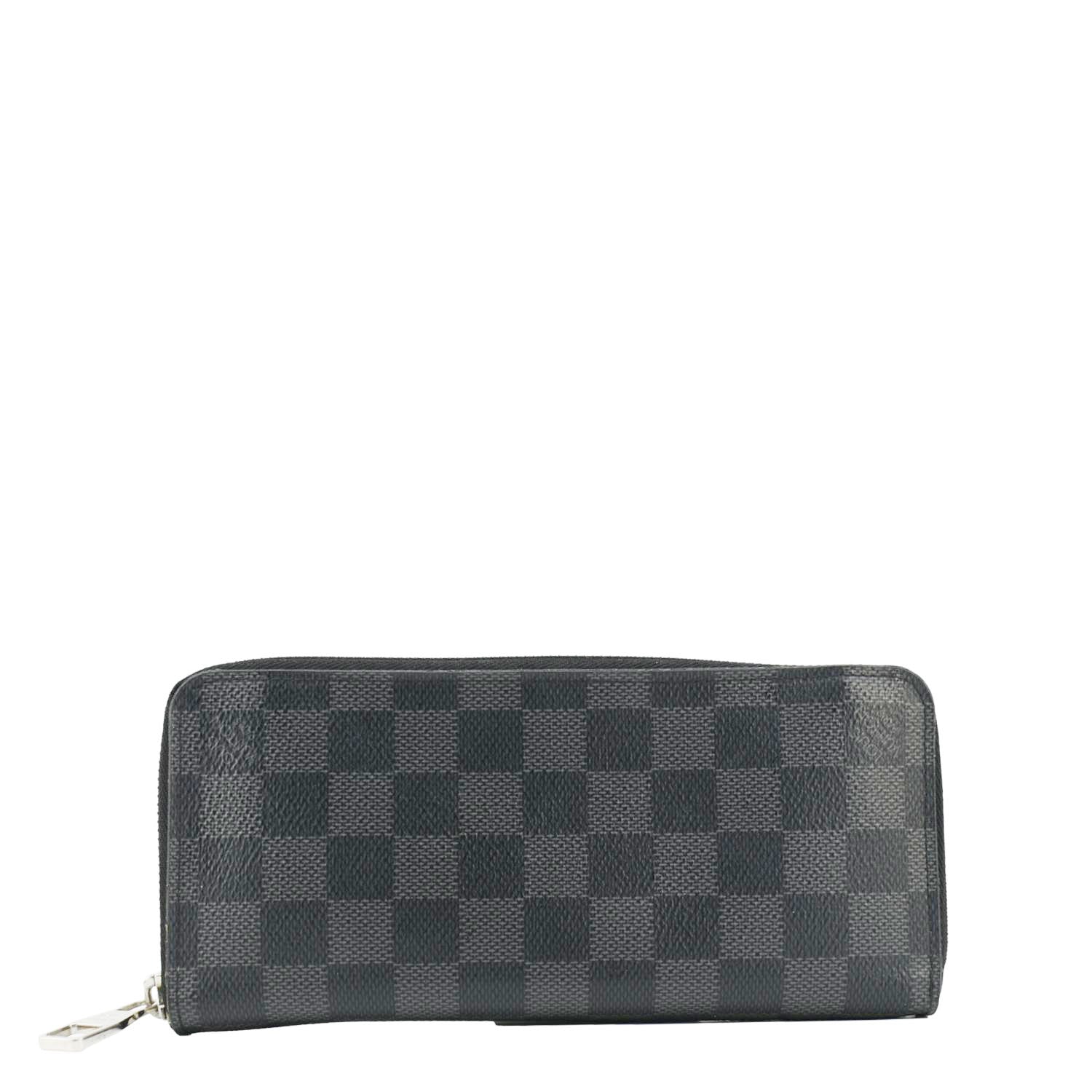 The Louis Vuitton Damier Graphite Vertical Zippy Wallet features the signature Damier Graphite canvas with silver-tone hardware. It offers multiple card slots, compartments for bills, and a secure zip-around closure, combining sleek style with functionality.