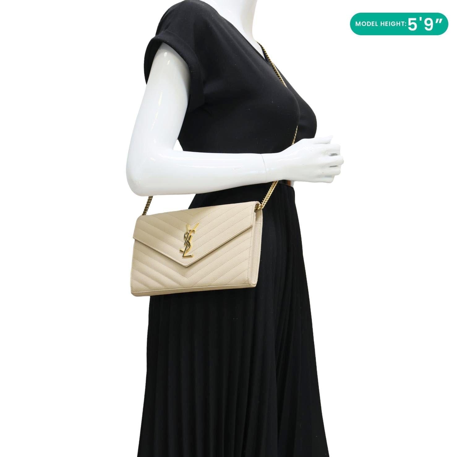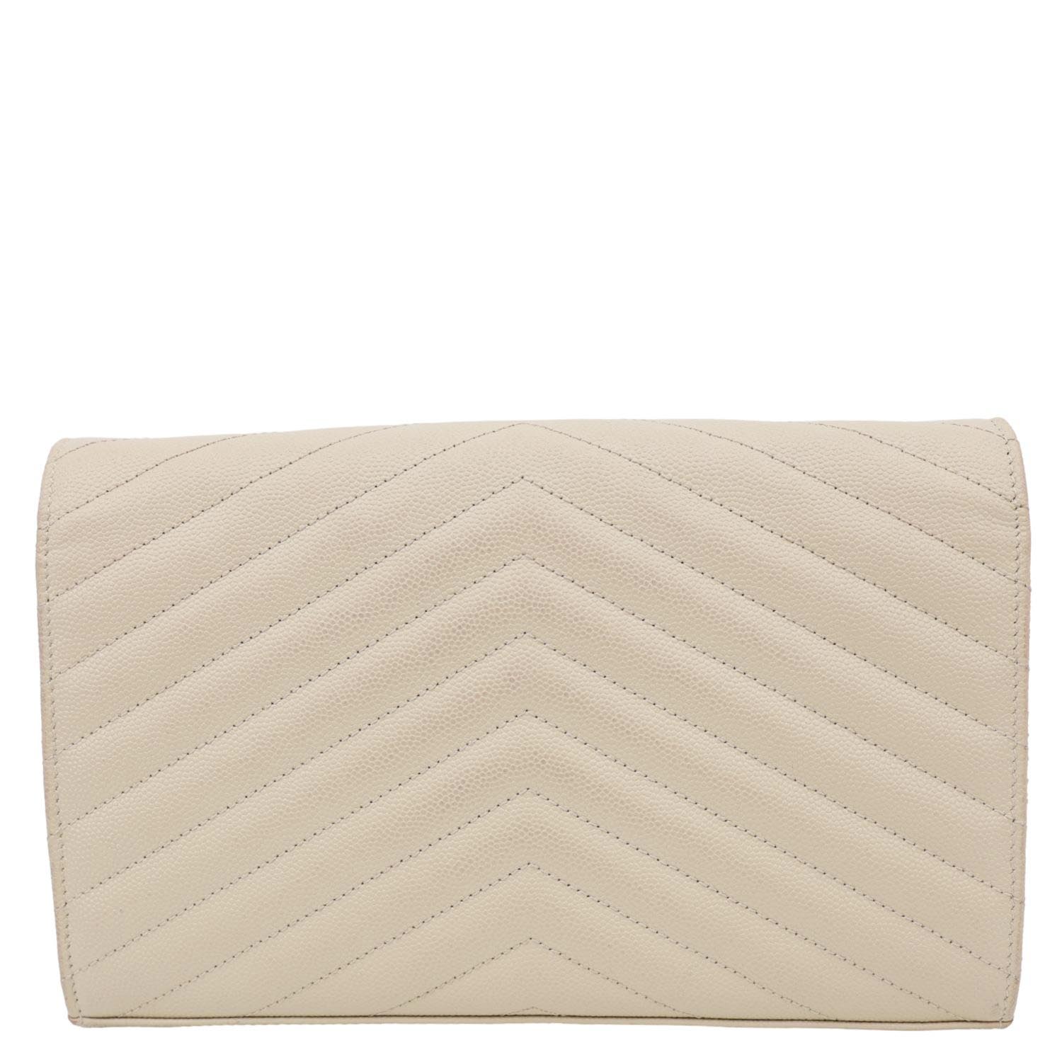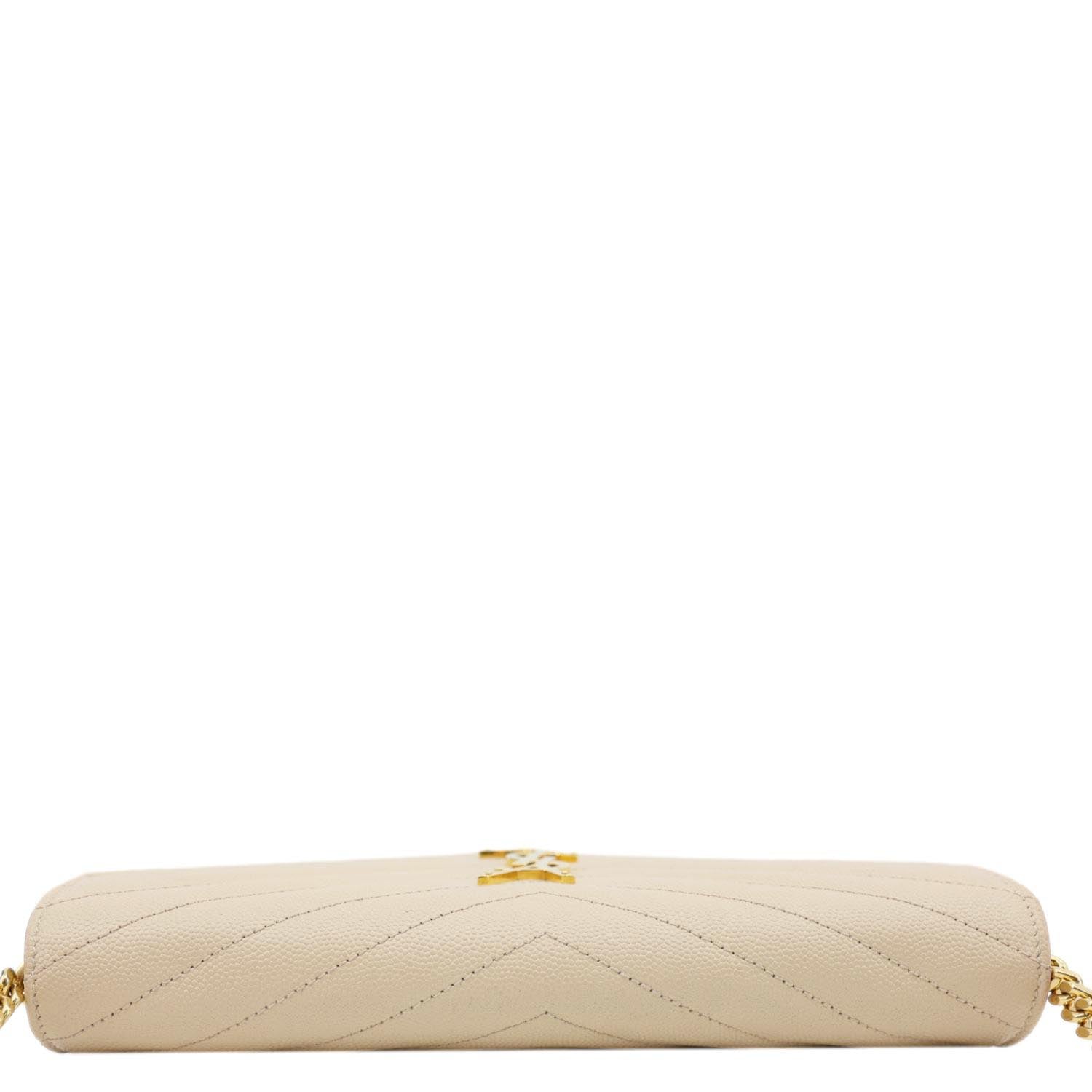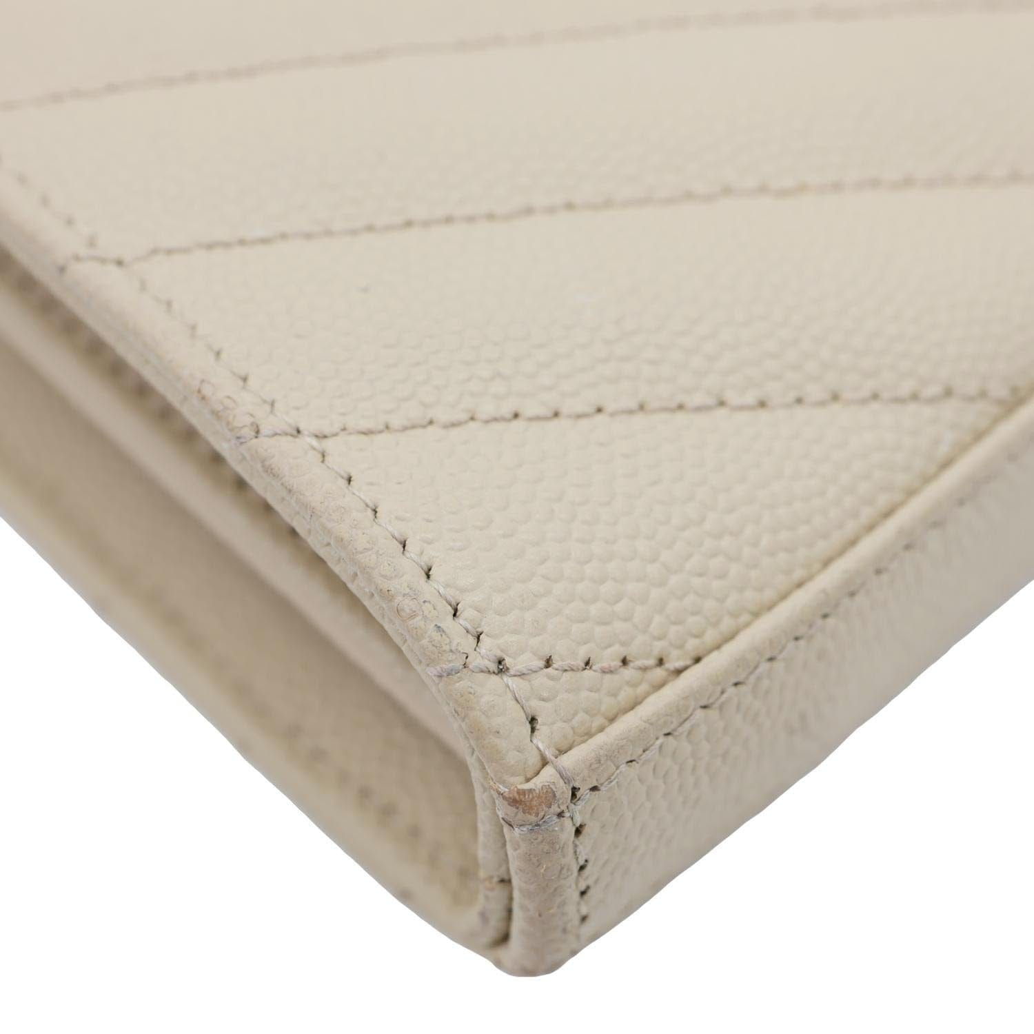 The YSL Envelope Wallet on Chain in Grain de Poudre leather features the iconic chevron design in a timeless beige shade. Elegant and versatile, it transitions seamlessly from day to night.