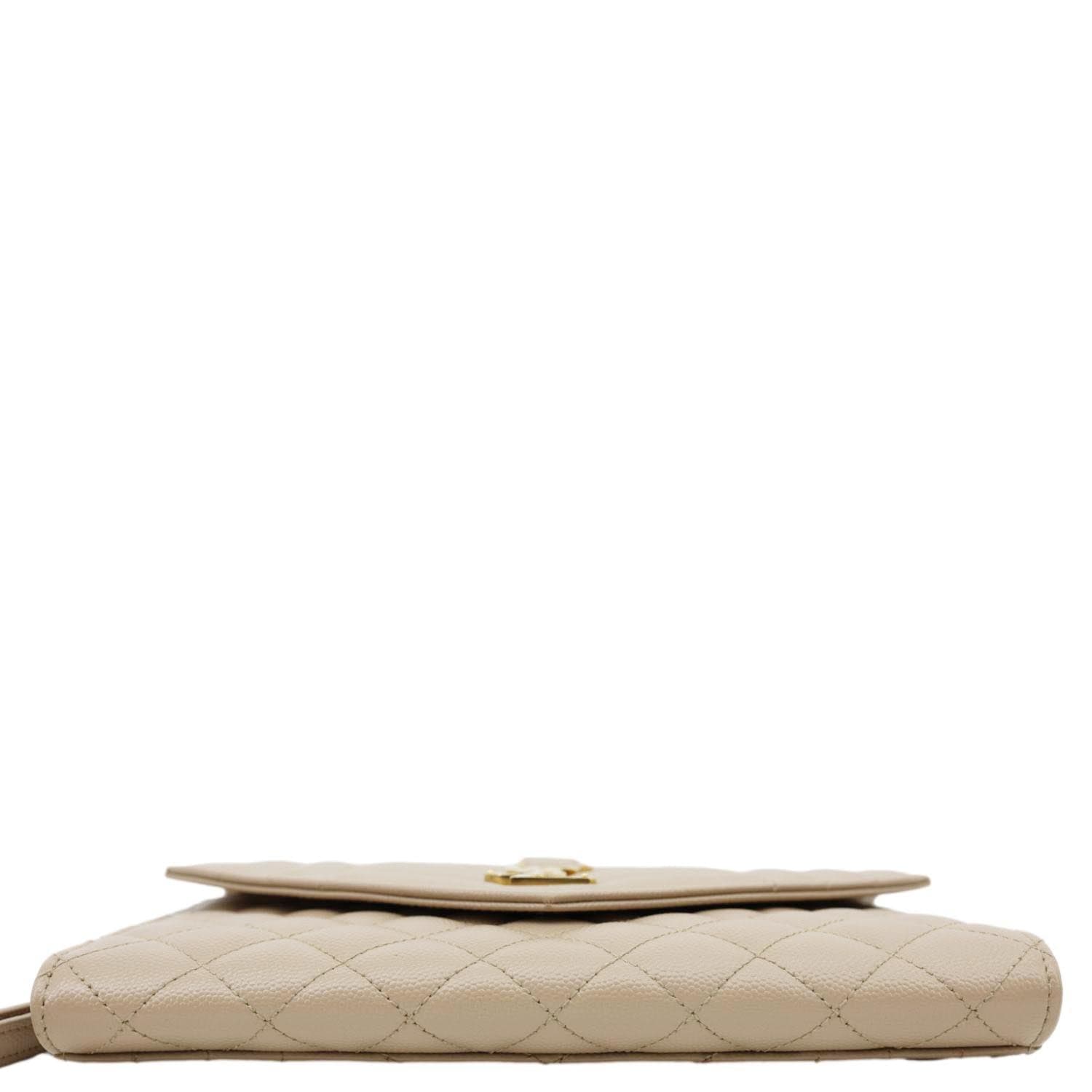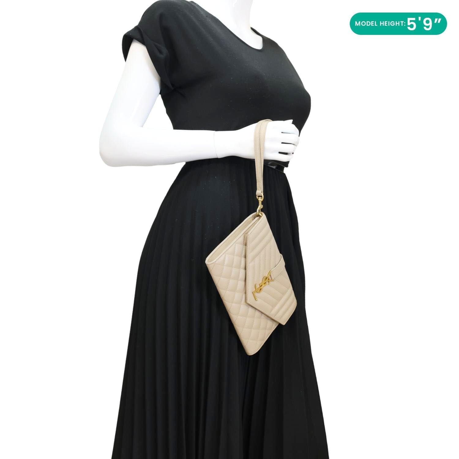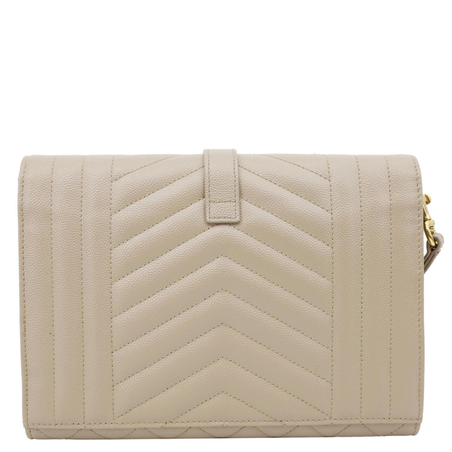 YVES SAINT LAURENT Monogram Envelope Leather Clutch Beige – A sleek clutch in Textured leather with signature YSL monogram and envelope flap. Designed with a wristlet strap for versatile and elegant carry.